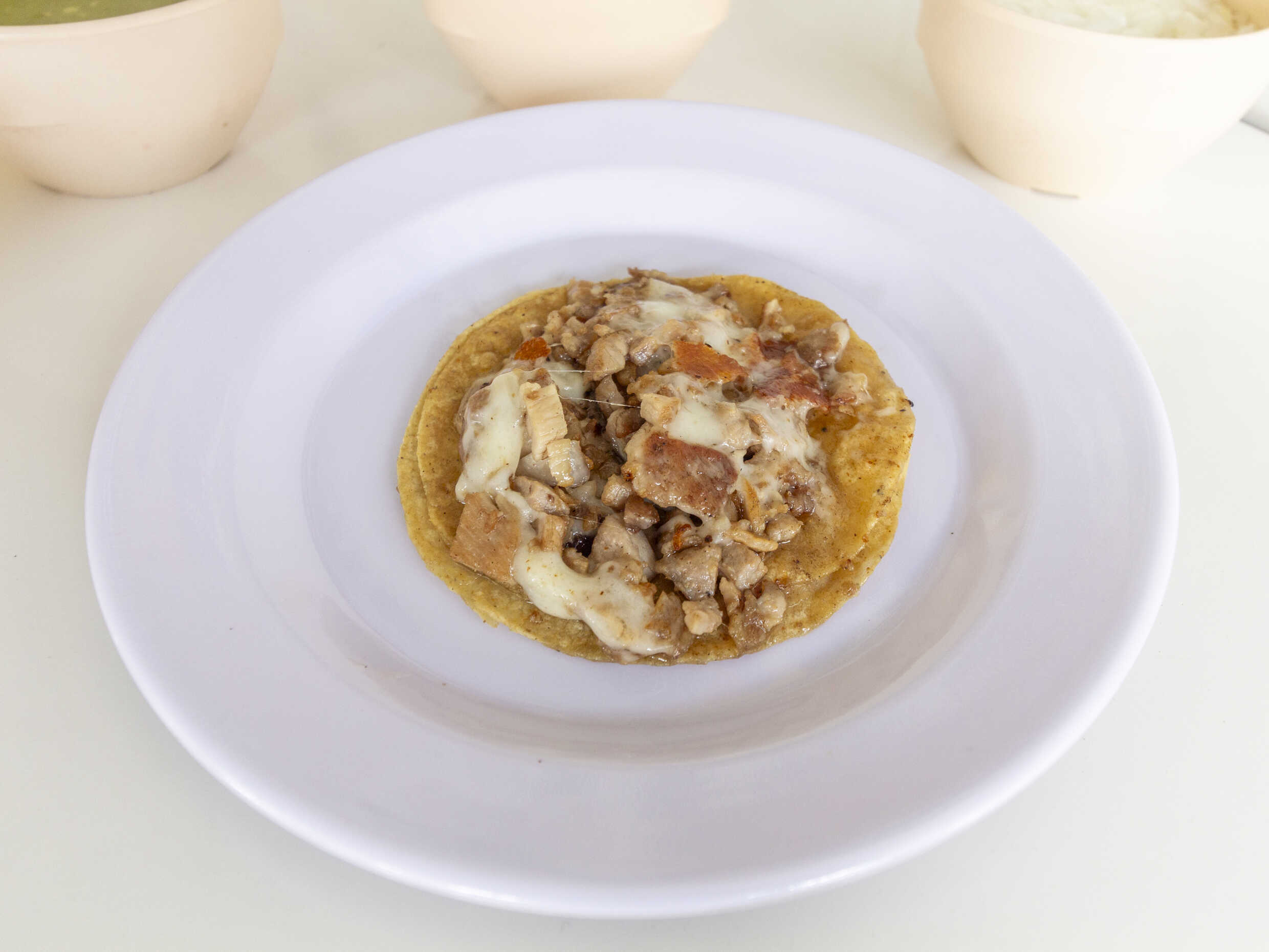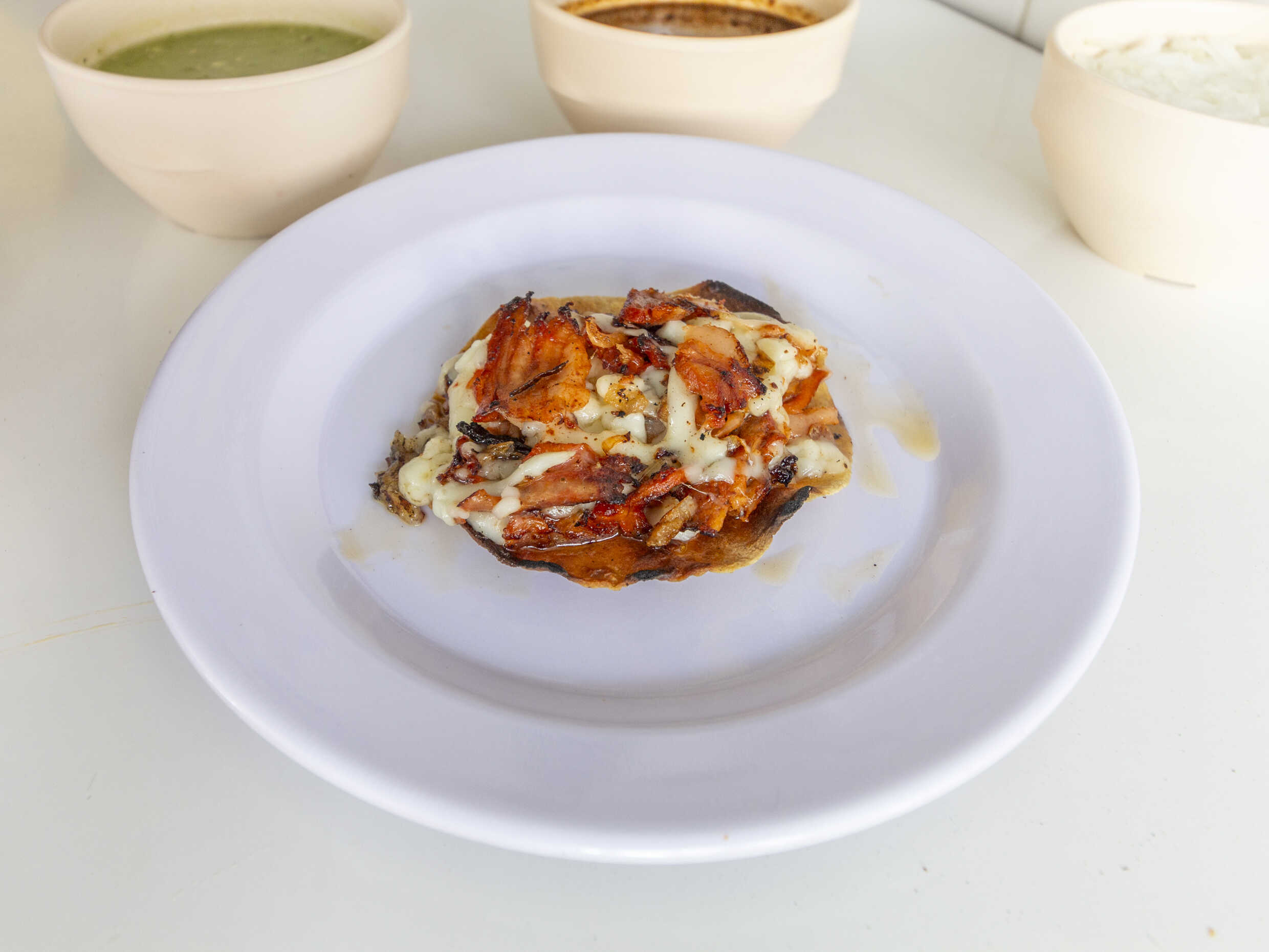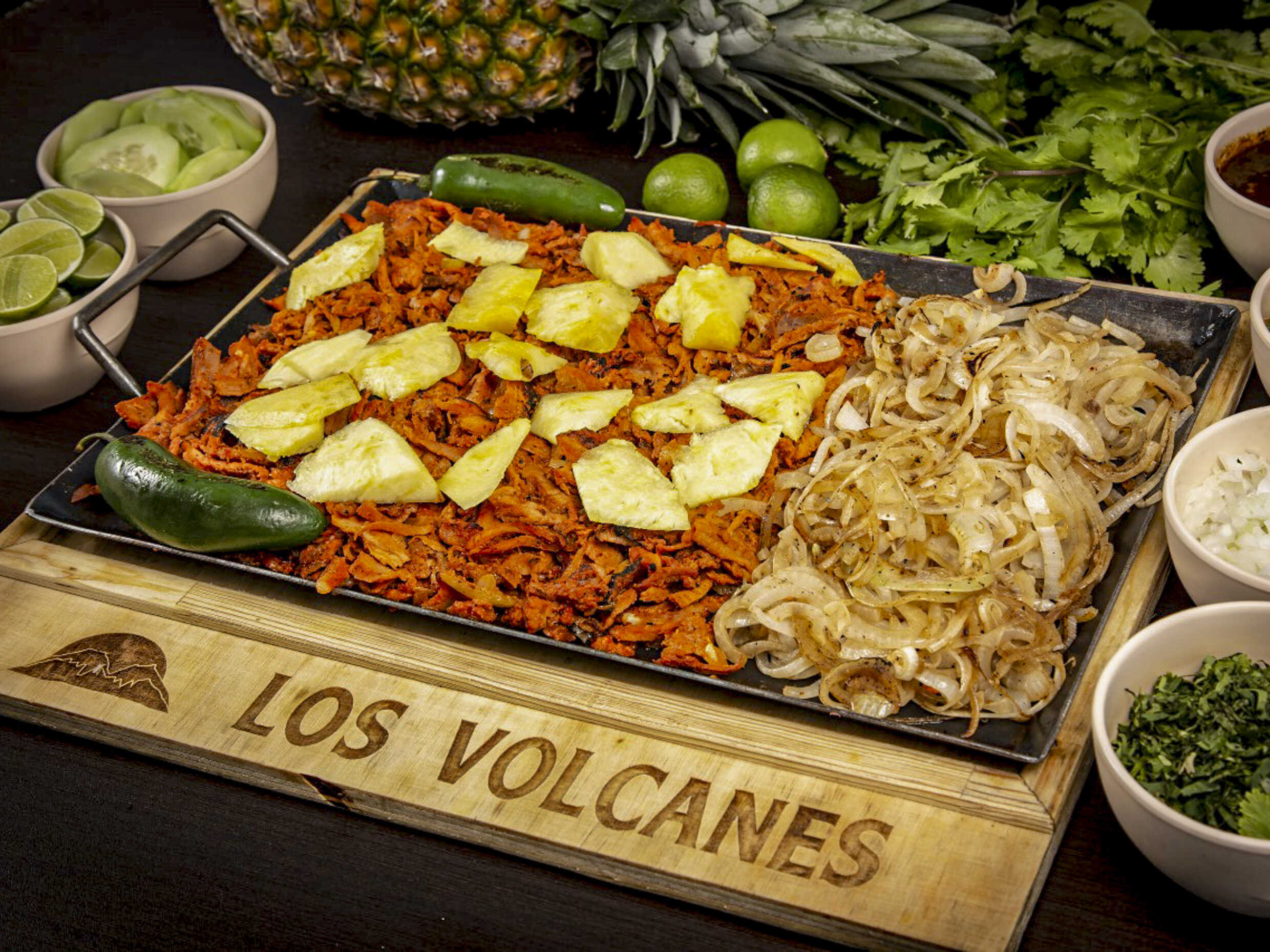 Volcán de pastor, tortilla de maíz, queo, salsas, cilantro y cebolla.