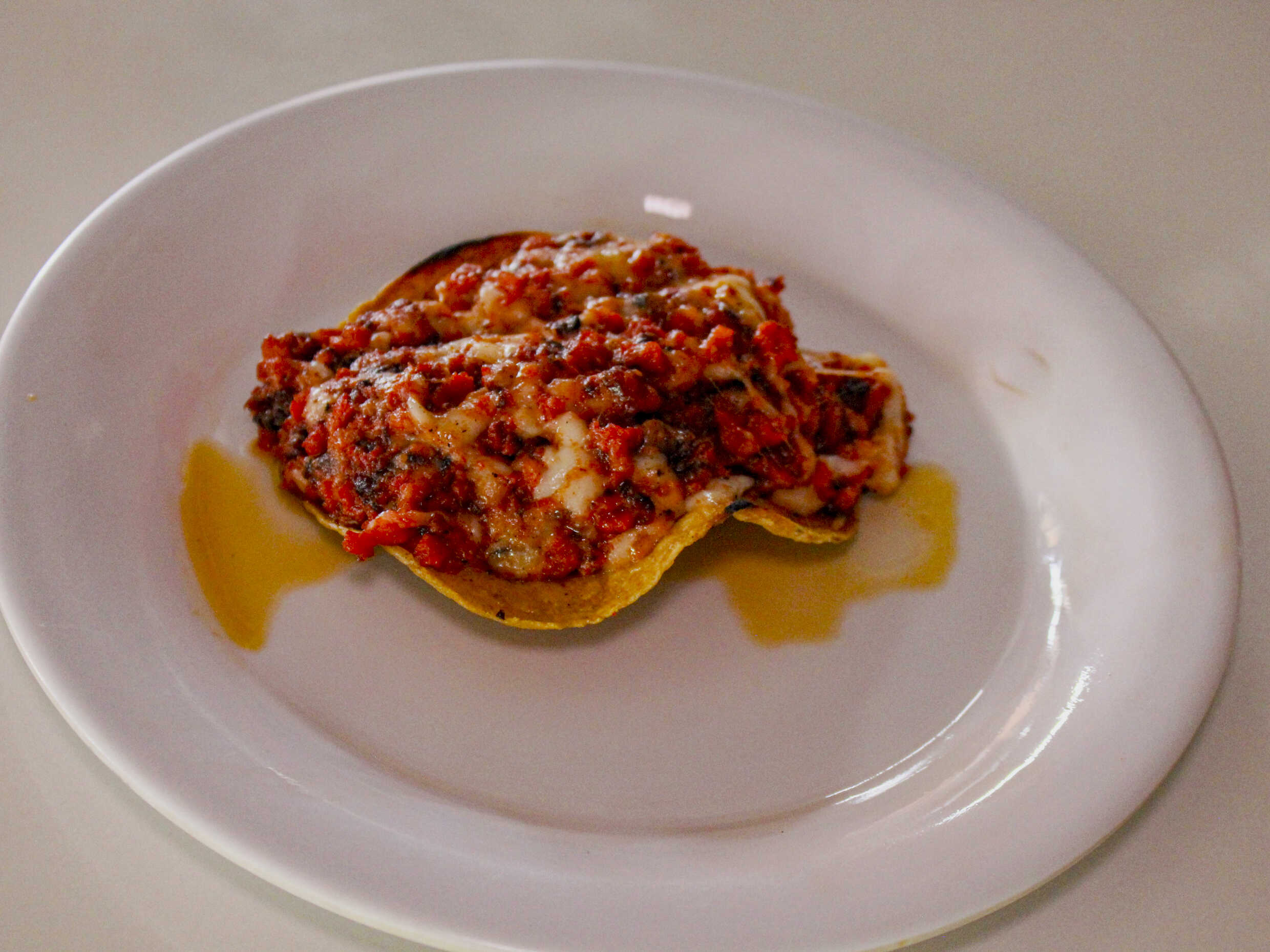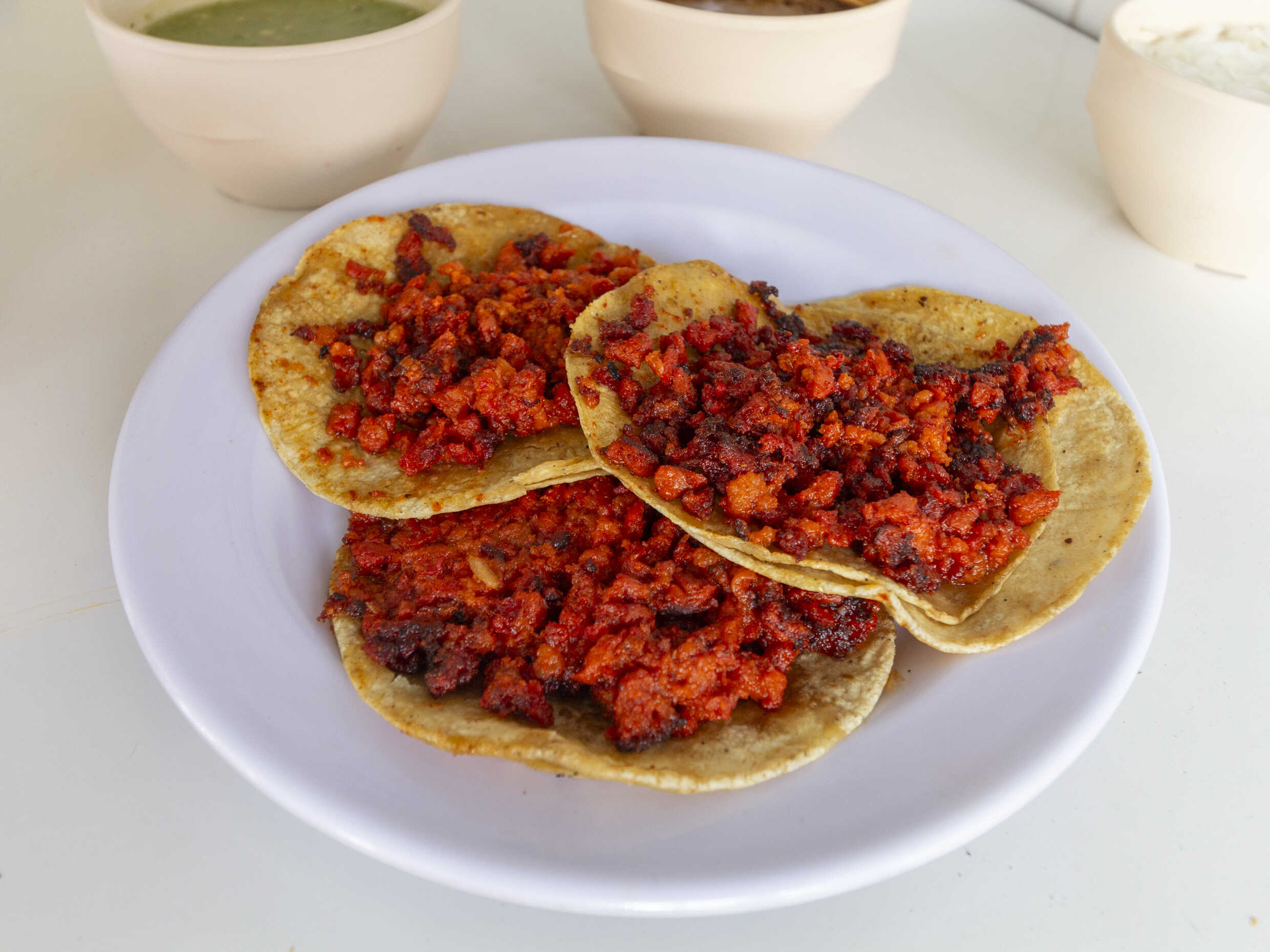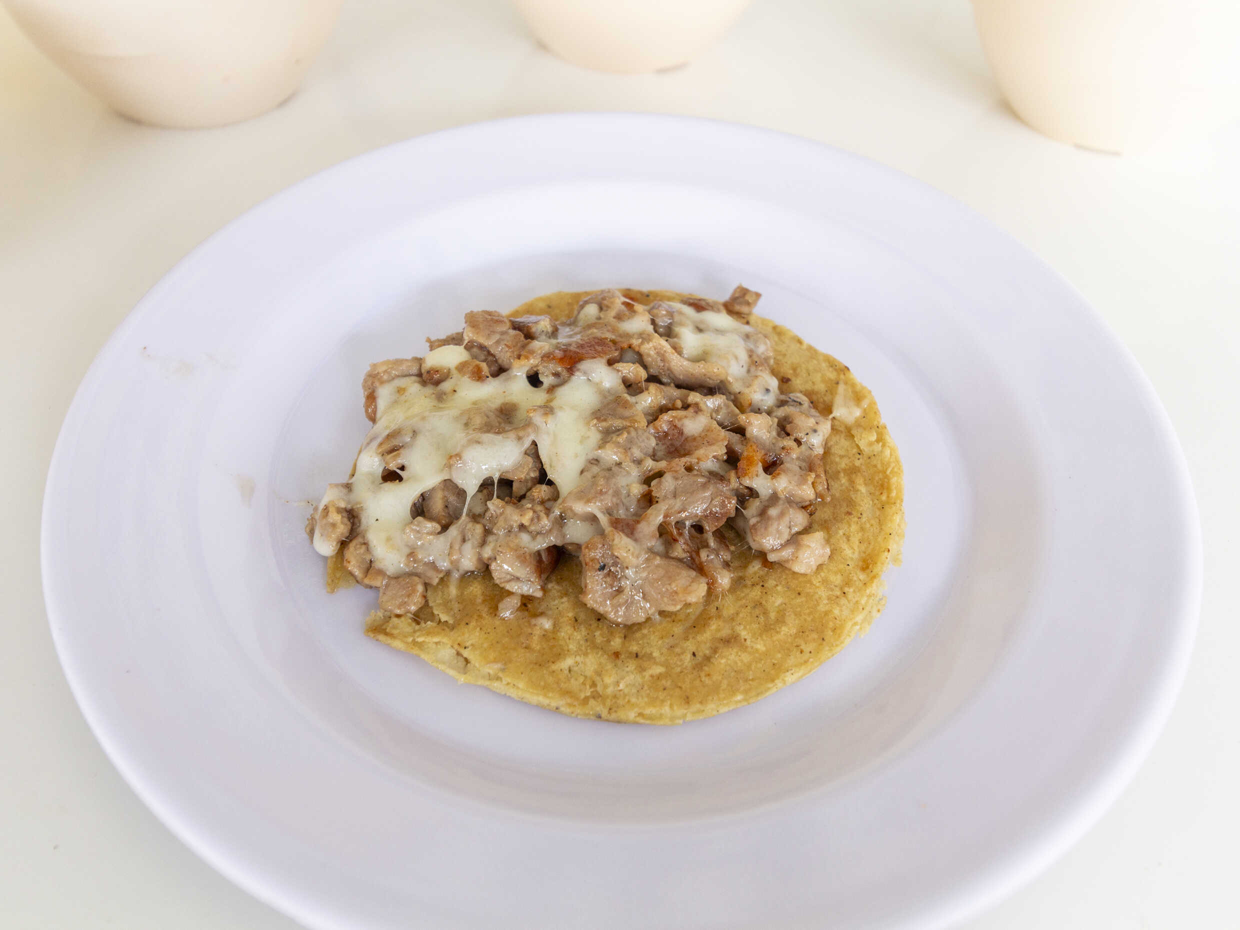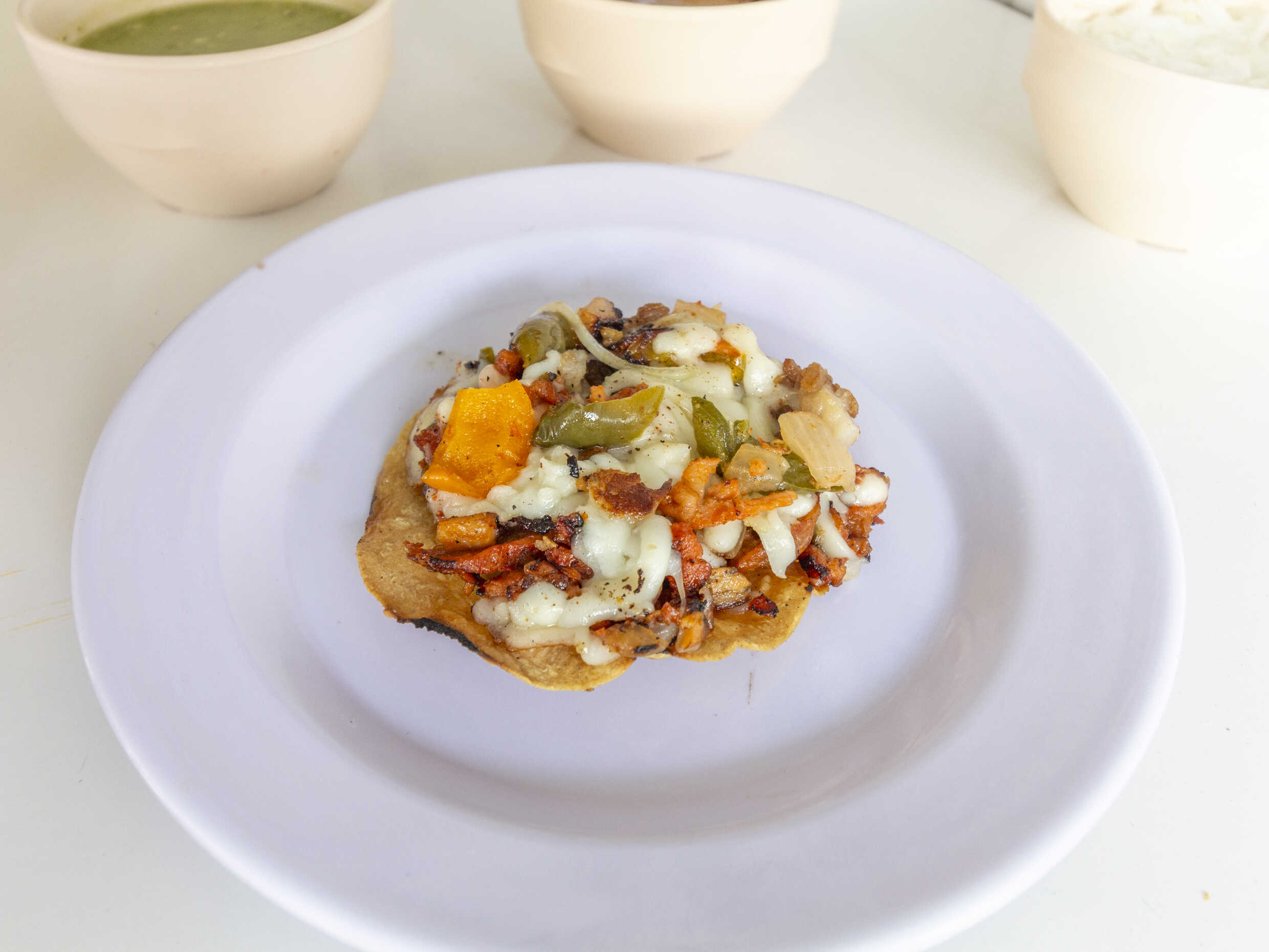 Volcán de pastor, tortilla de maíz, queo, salsas, cilantro y cebolla.