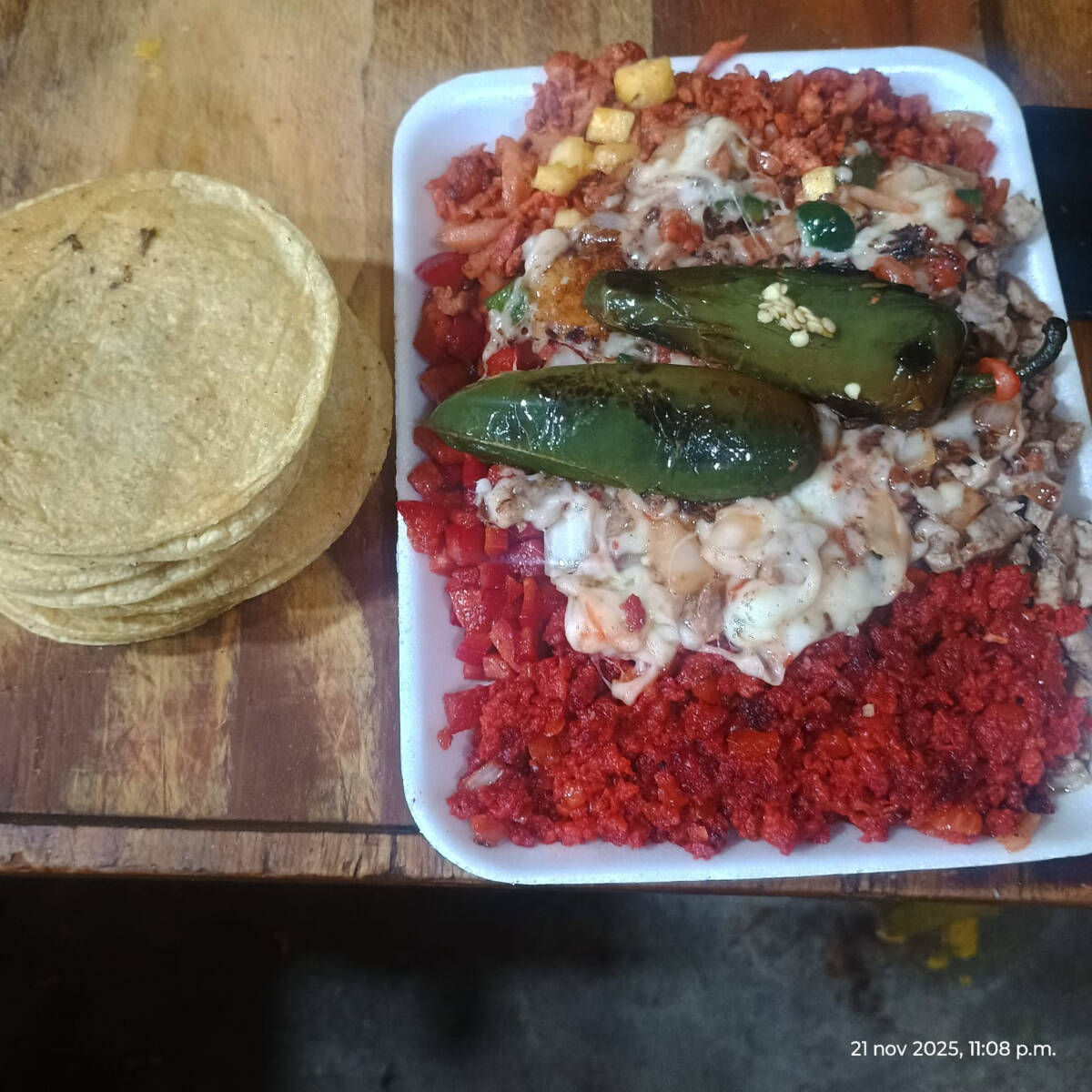 Tostada de maíz con queso y carne.