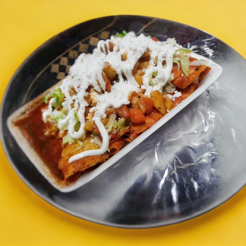2 teleras bañadas en salsa roja especial de la casa, frito, relleno de papa con zanahoria y chorizo, lechuga, crema y queso, salsa casera aparte.