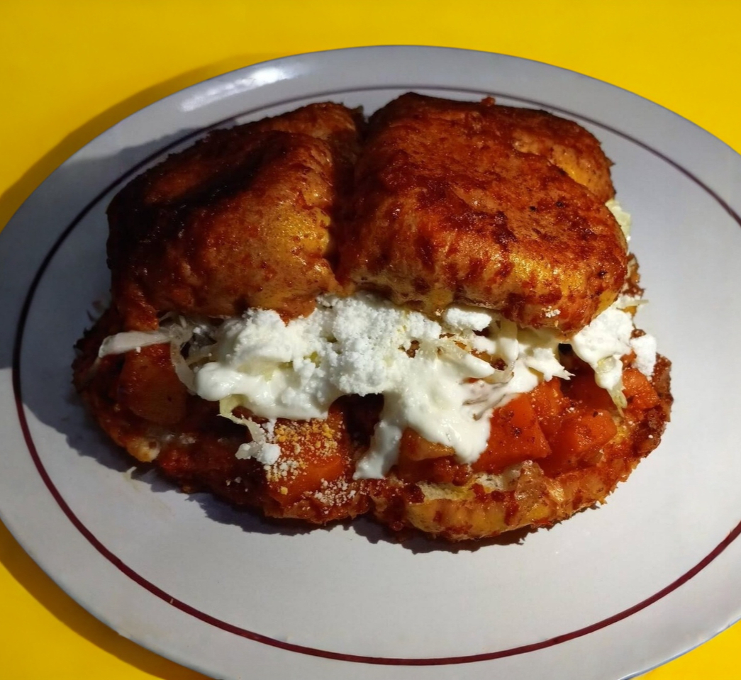 telera bañada en salsa roja especial de la casa, frito, relleno de papa con zanahoria y chorizo, lechuga, crema y queso, salsa casera aparte.