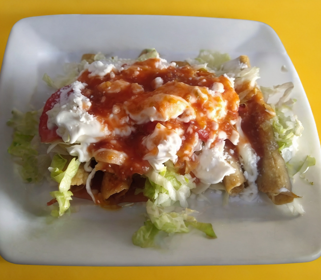 Tortilla de maíz normal grande frita envuelta, rellena de carne deshebrada con lechuga, jitomate, cebolla, crema y queso, salsa aparte para poner a su gusto, 5 piezas.