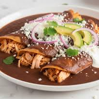 Enmoladas (5 Pzas) rellenas de Pollo deshebrado o queso panela, bañadas en exquisito Mole de la Casa y acompañadas de arroz y frijoles refritos. Incluyen: Bolillo y salsa.