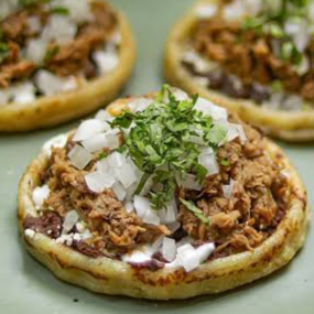 Sopes preparados con frijoles refritos, una Especialidad de Carne a elegir, bañados con crema y queso panela. Incluyen: Salsa y verdura.