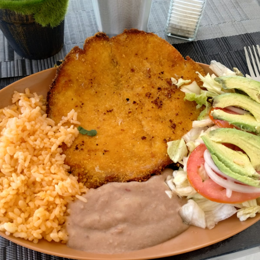 Filete de pollo empanizado acompañado de frijoles refritos, arroz y ensalada. Incluye: Tortillas, limón y Salsa.