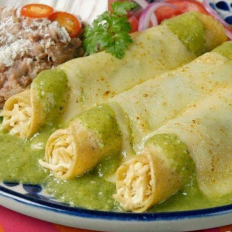 Enchiladas (5 pzas) rellenas de pollo deshebrado o queso panela, bañadas en Salsa verde cremosa y queso asadero, acompañadas de frijoles refritos con arroz. Incluyen: Bolillo y salsa.
