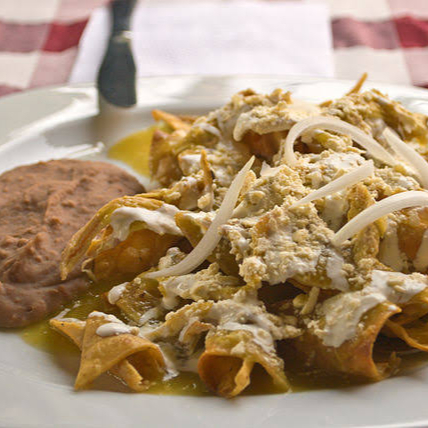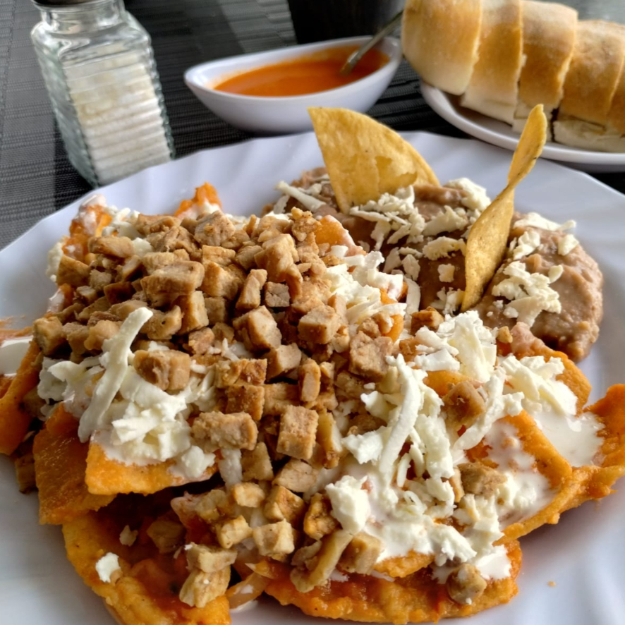 Chilaquiles preparados con Totopos bañados en salsa casera, cubiertos con queso panela y crema, y acompañados de frijoles refritos. Incluyen: Salsa y bolillo.