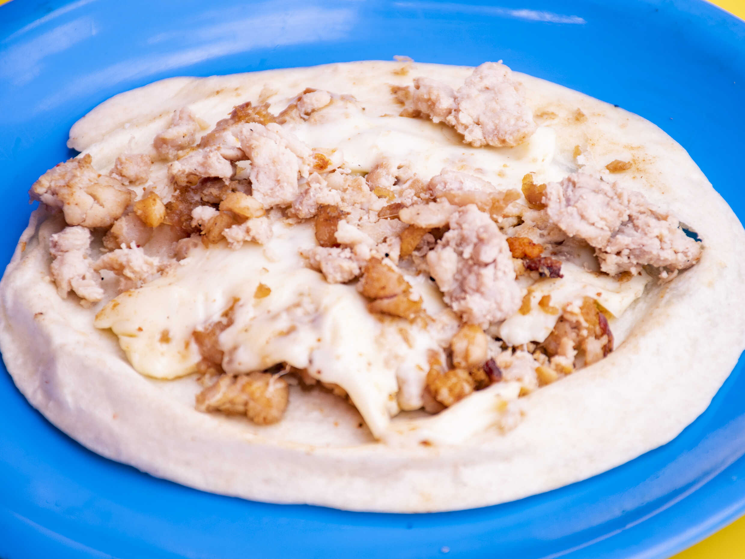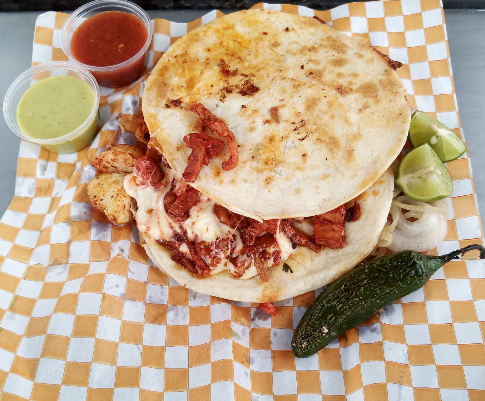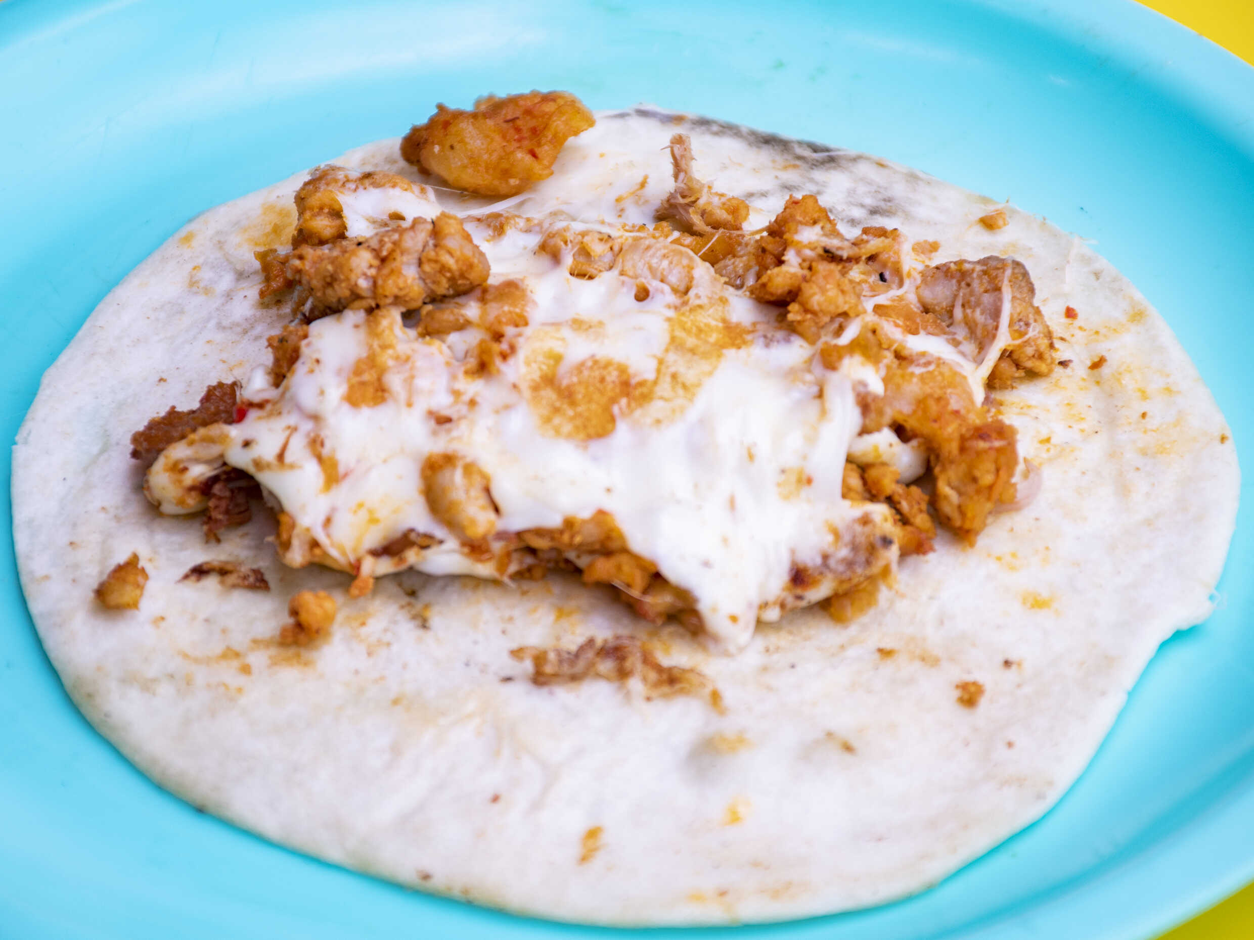 Dos tortillas de harina con carne al pastor y queso asadero.