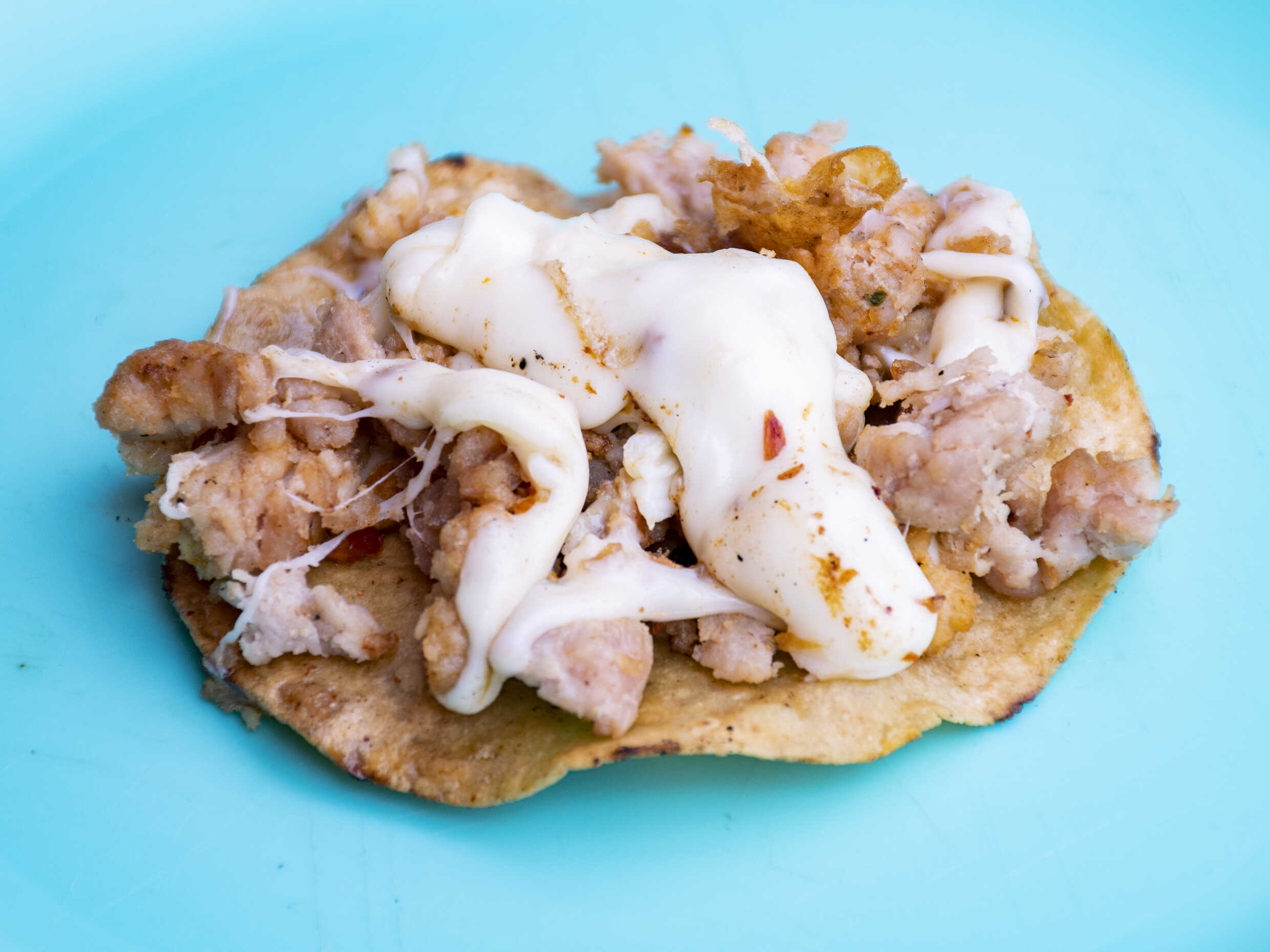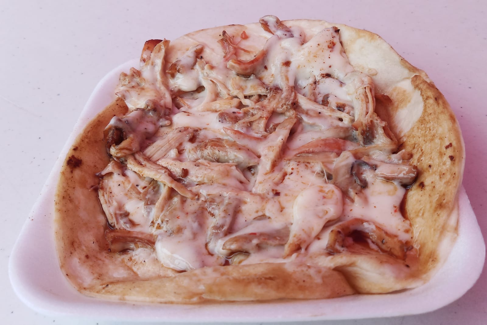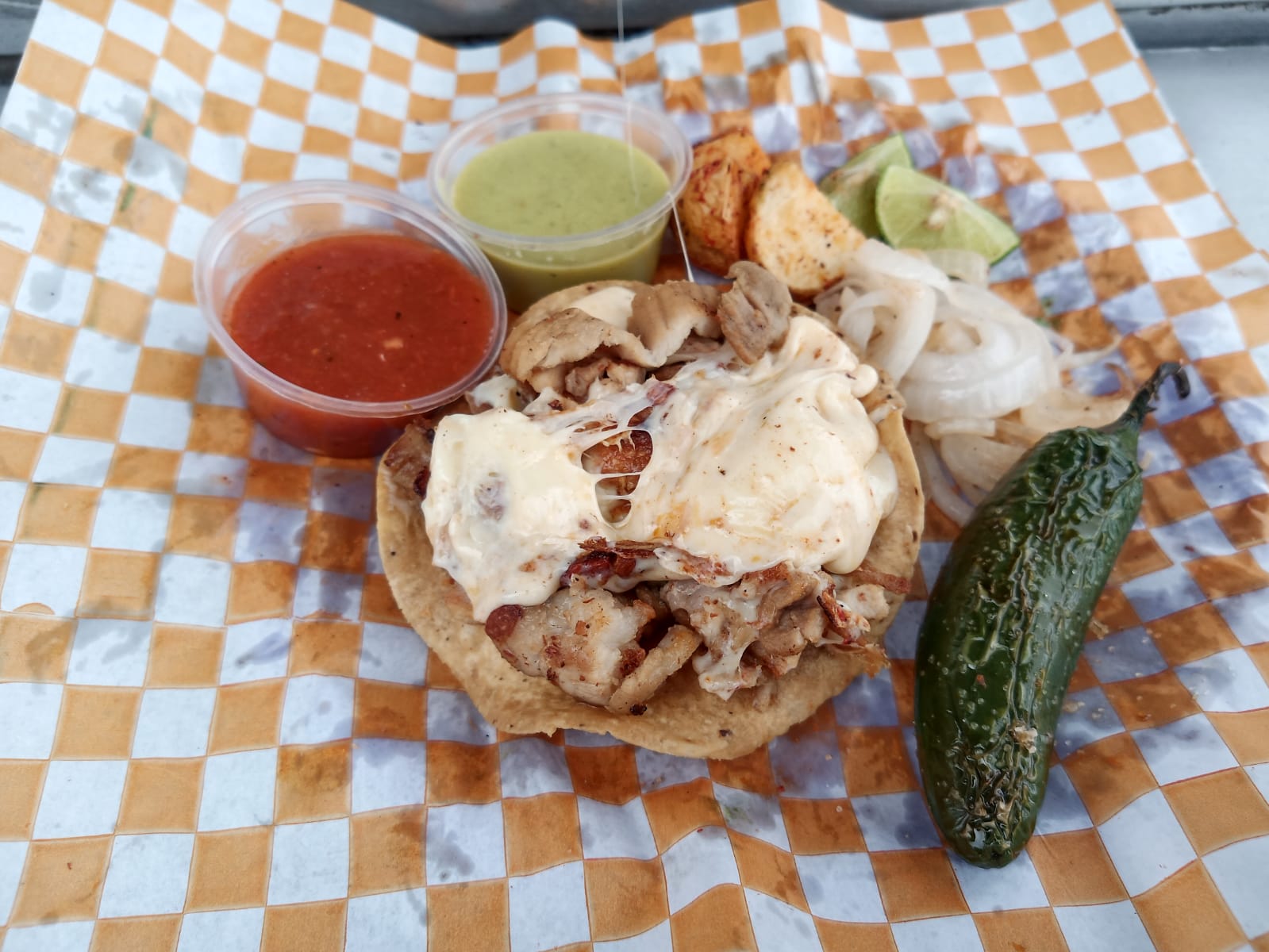 Dos tortillas de harina con carne al pastor y queso asadero.