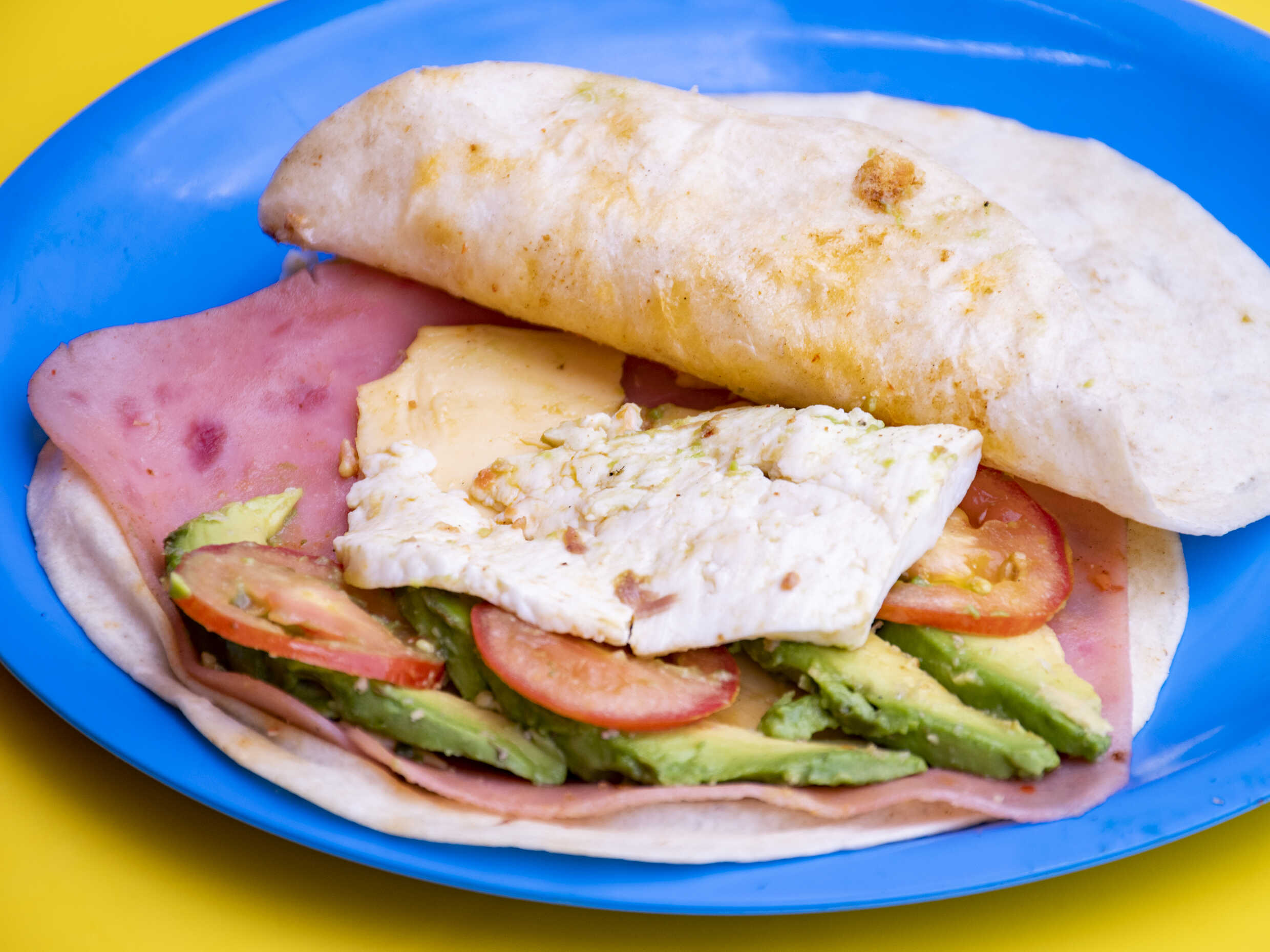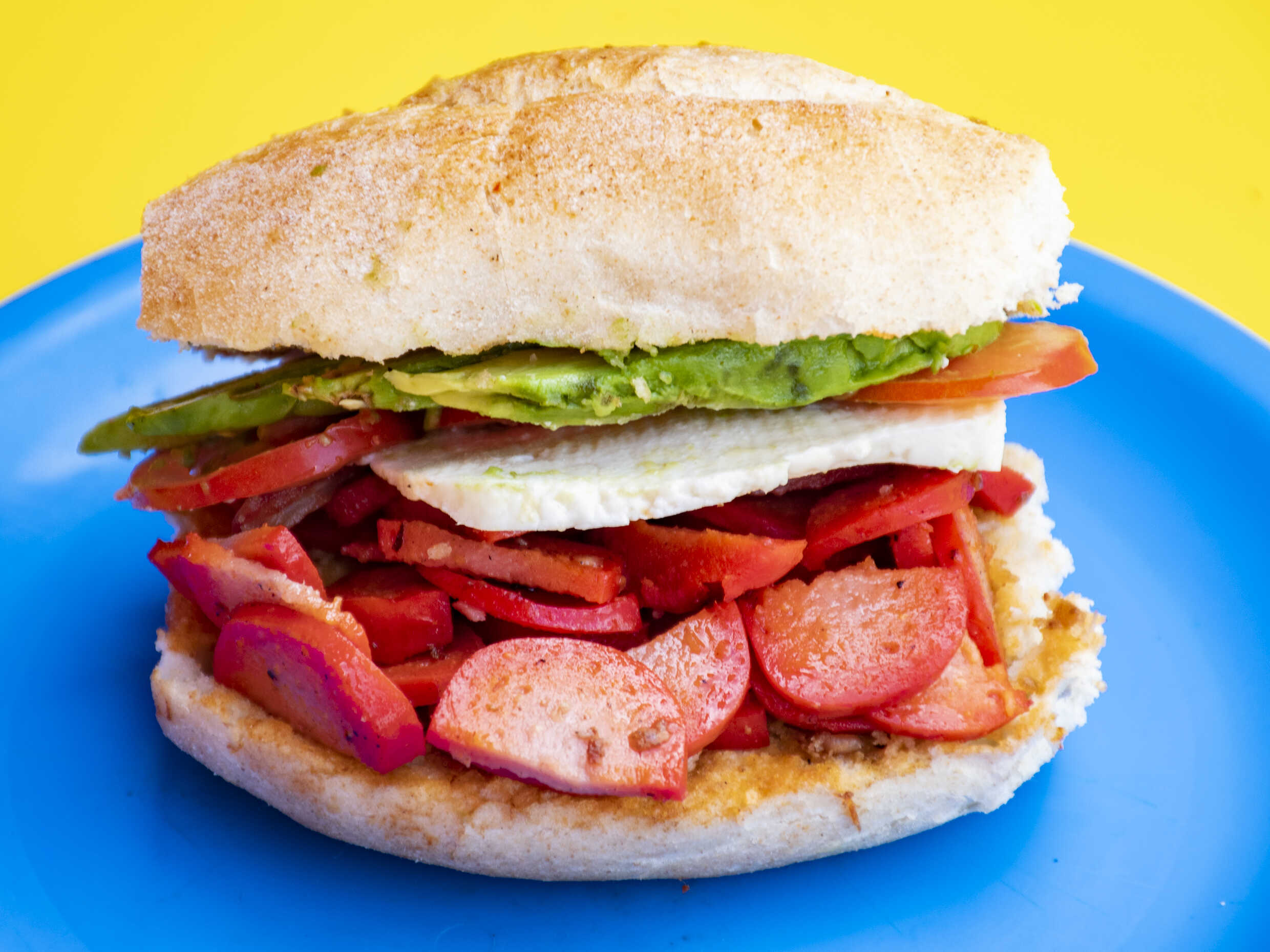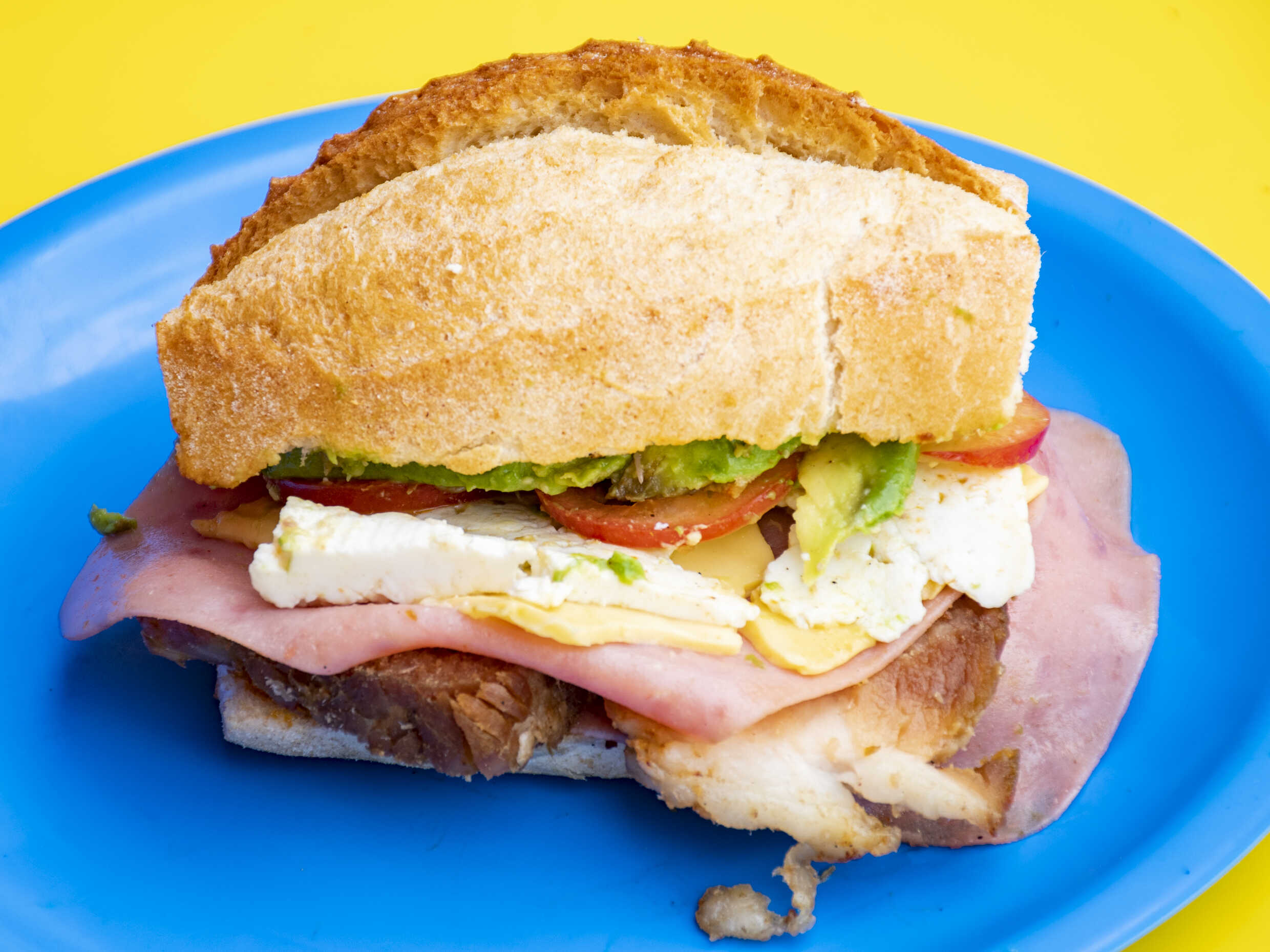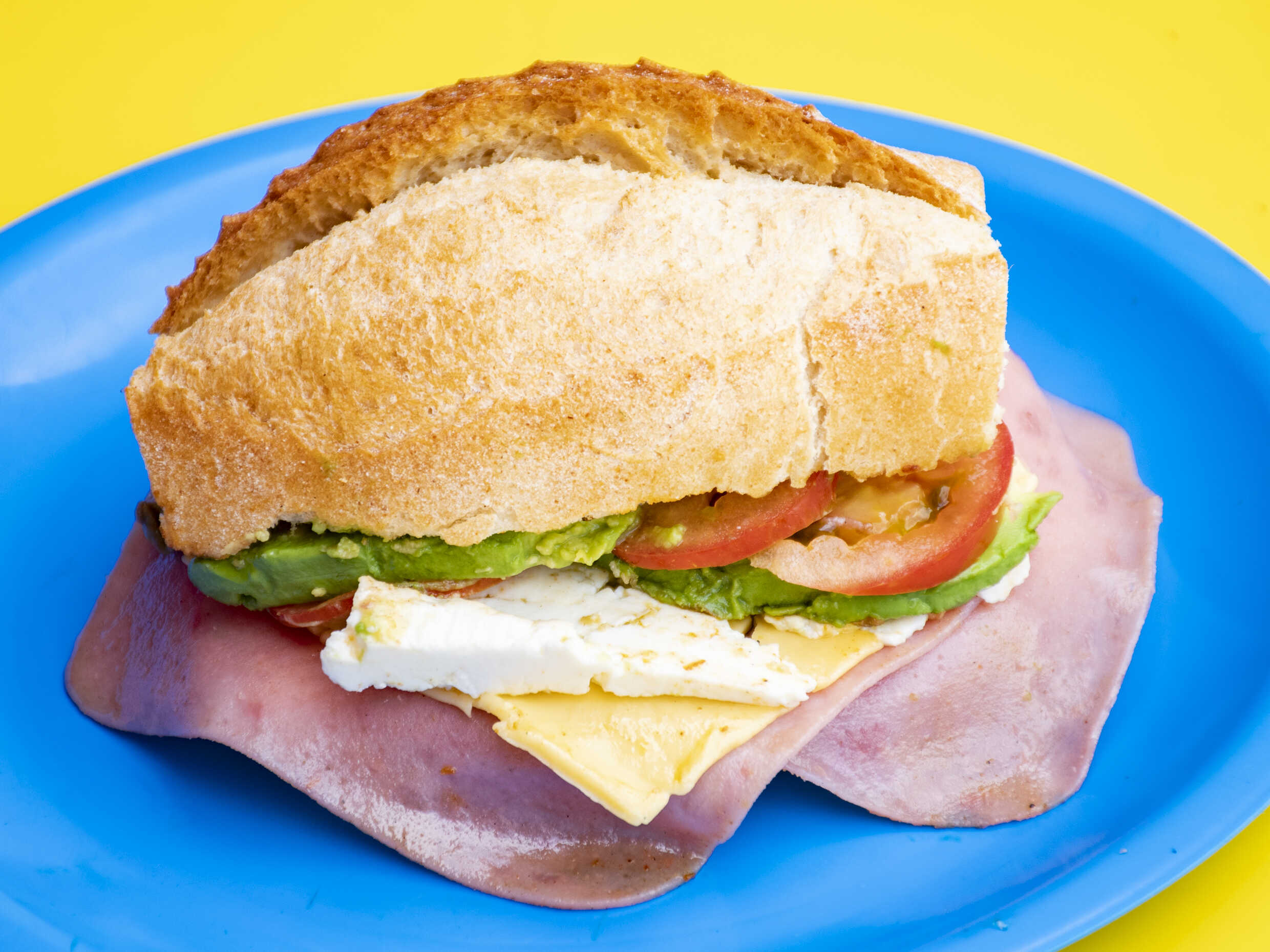 Bolillo 14 cm con jamón, mayonesa, aguacate, queso blanco y amarillo y jitomate.
