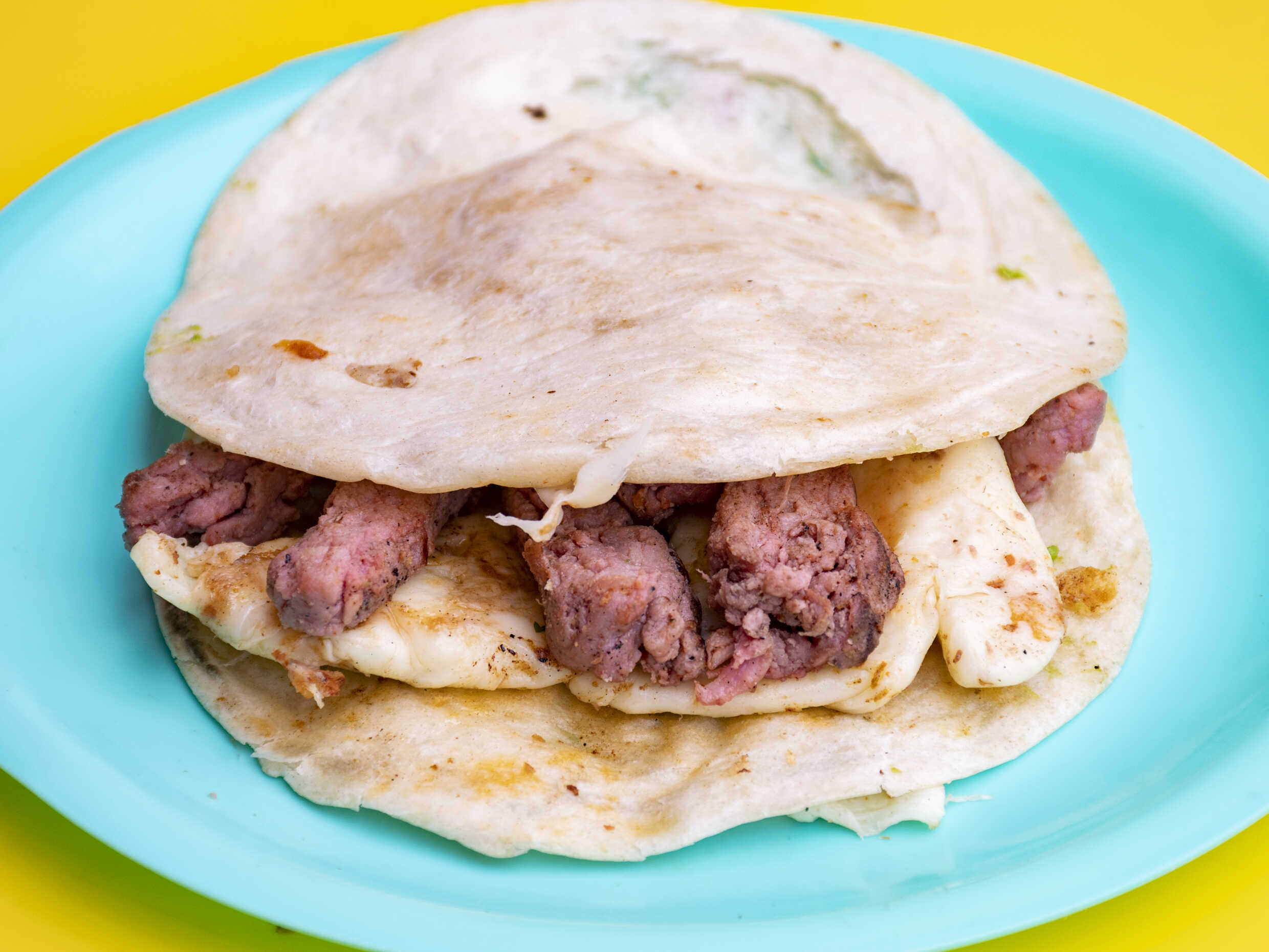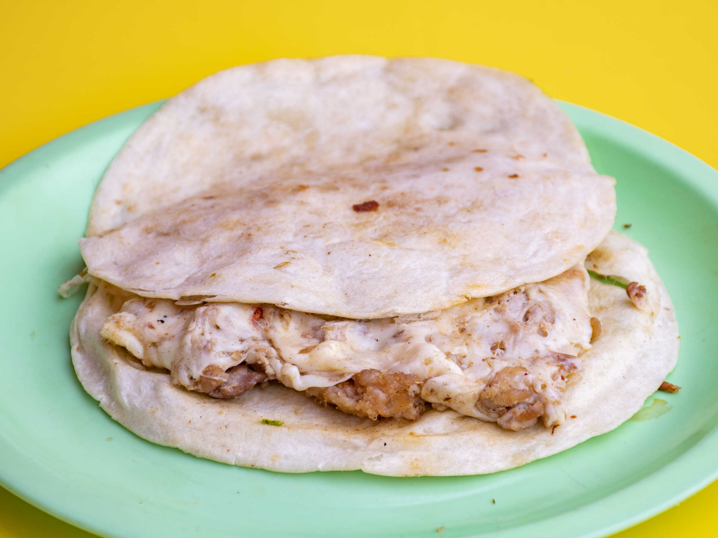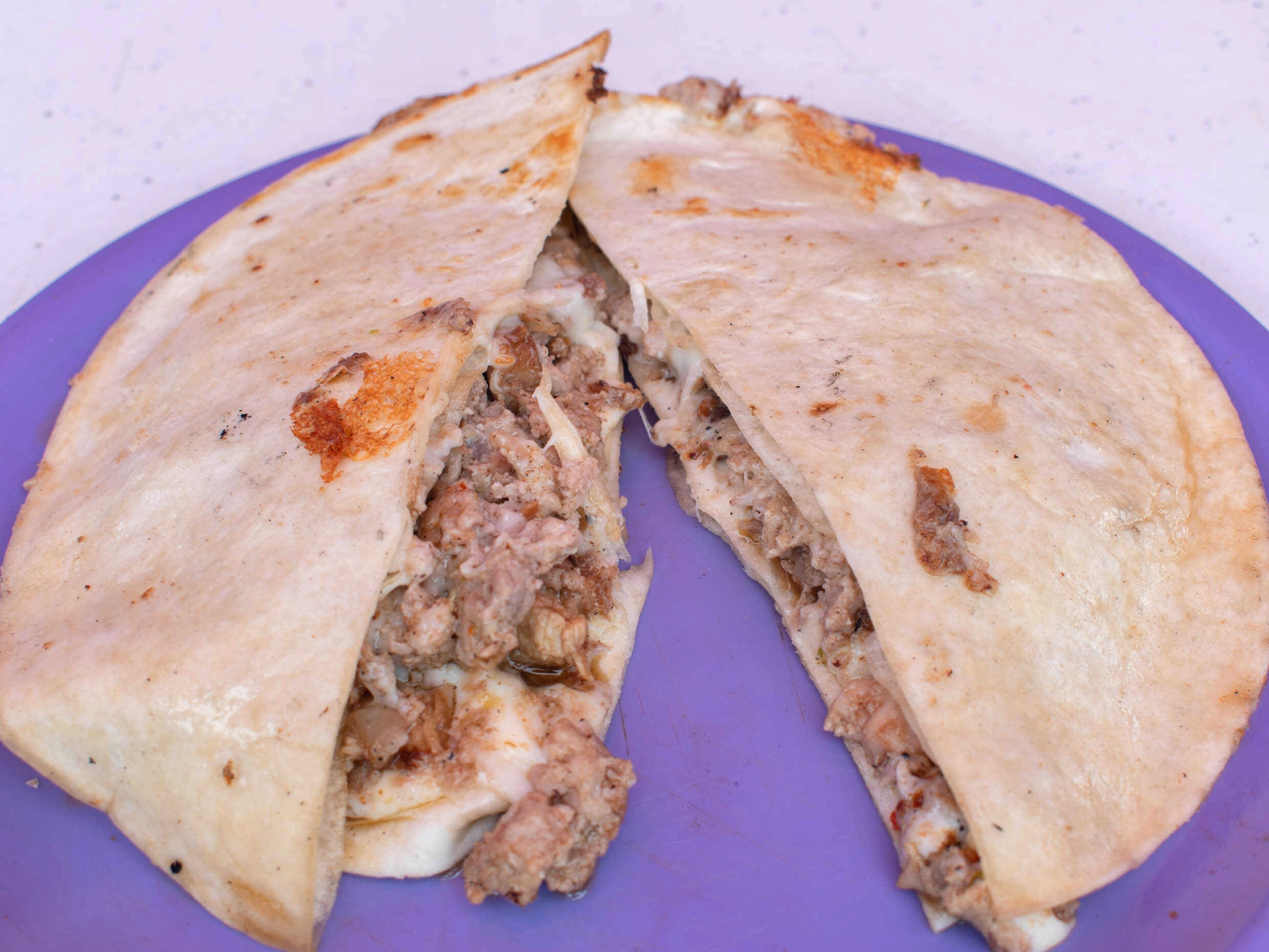 Dos tortillas de harina con carnita maciza y queso asadero.