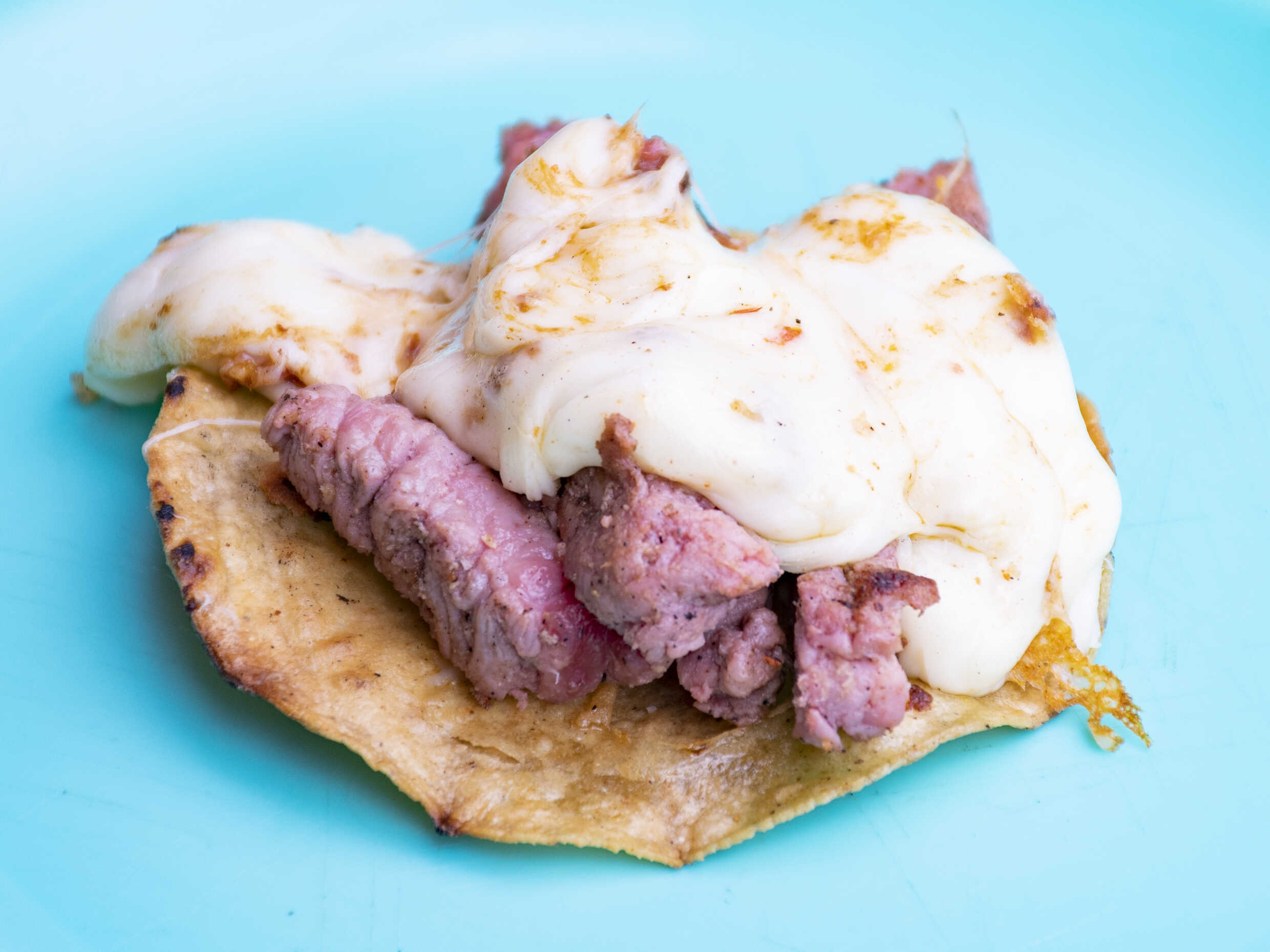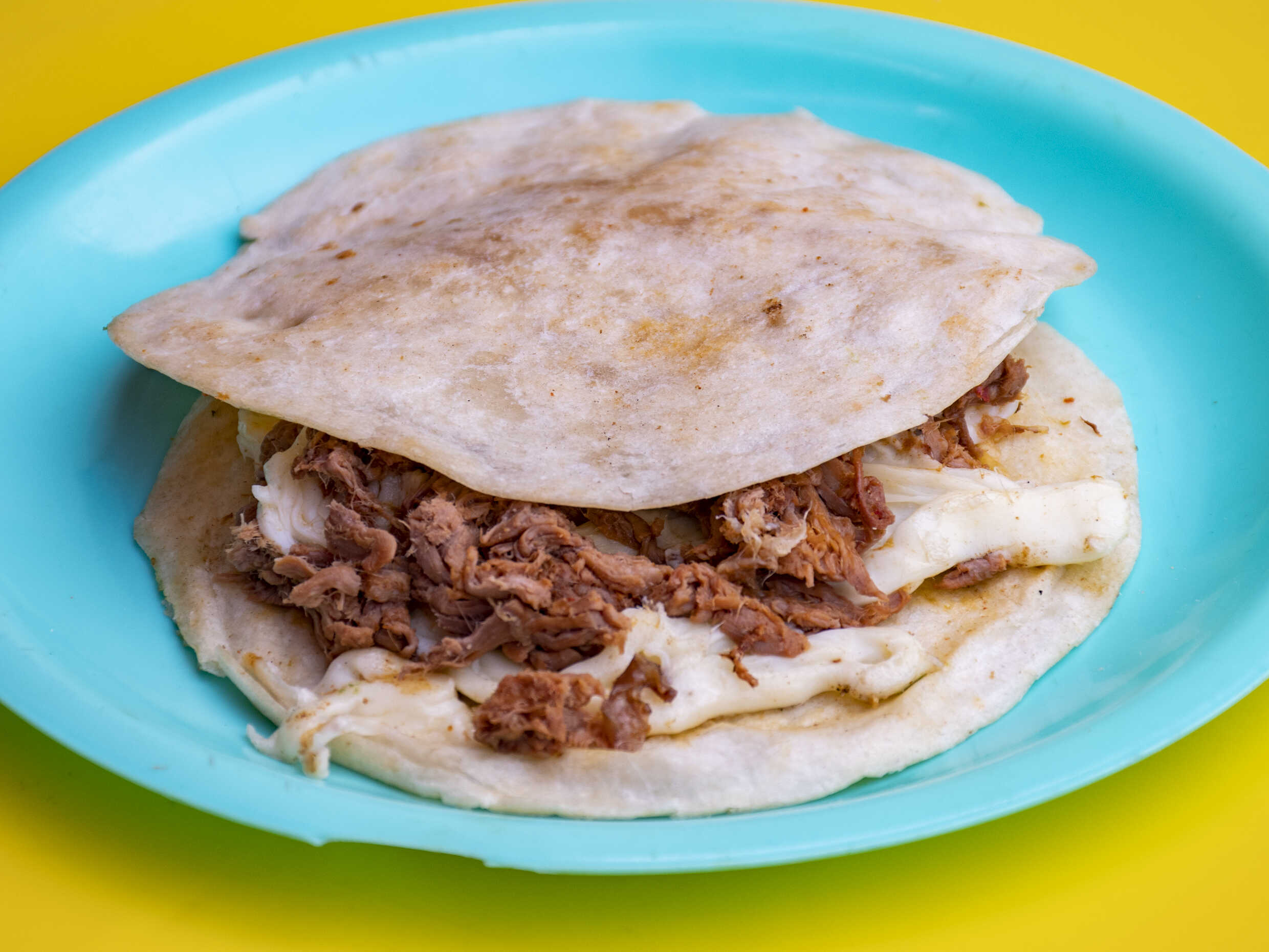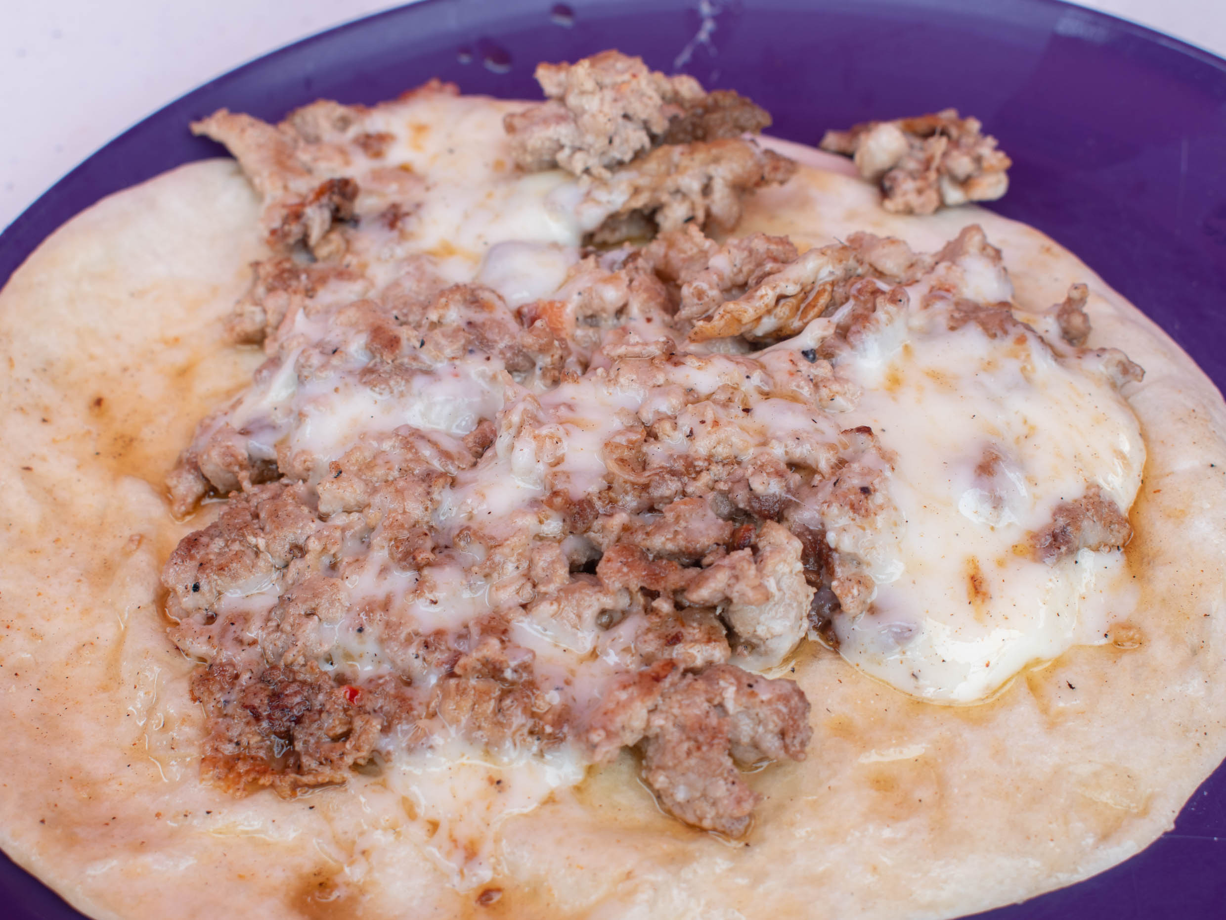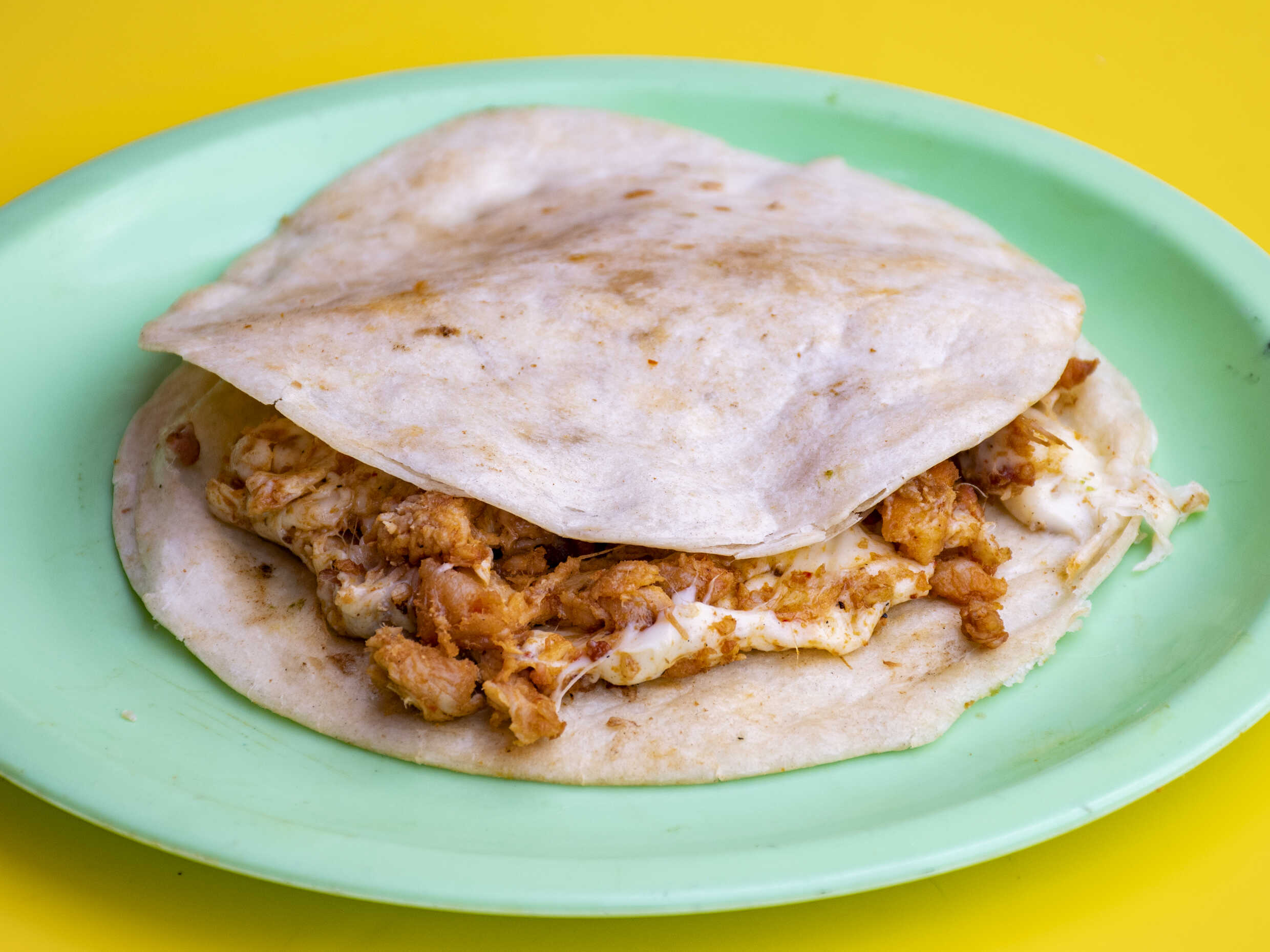 Dos tortillas de harina con carnita maciza y queso asadero.