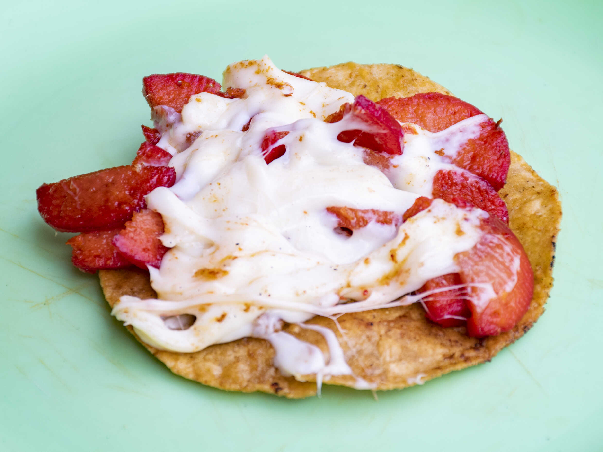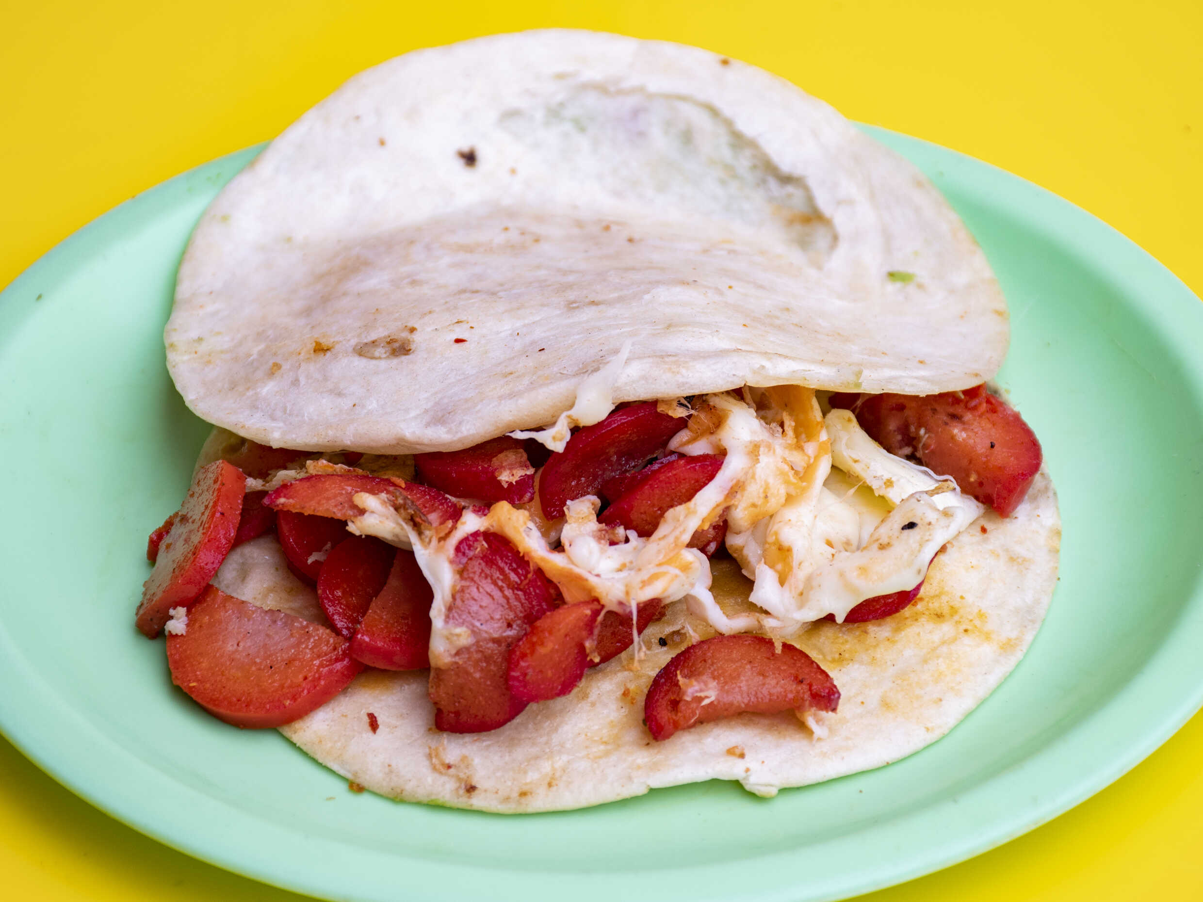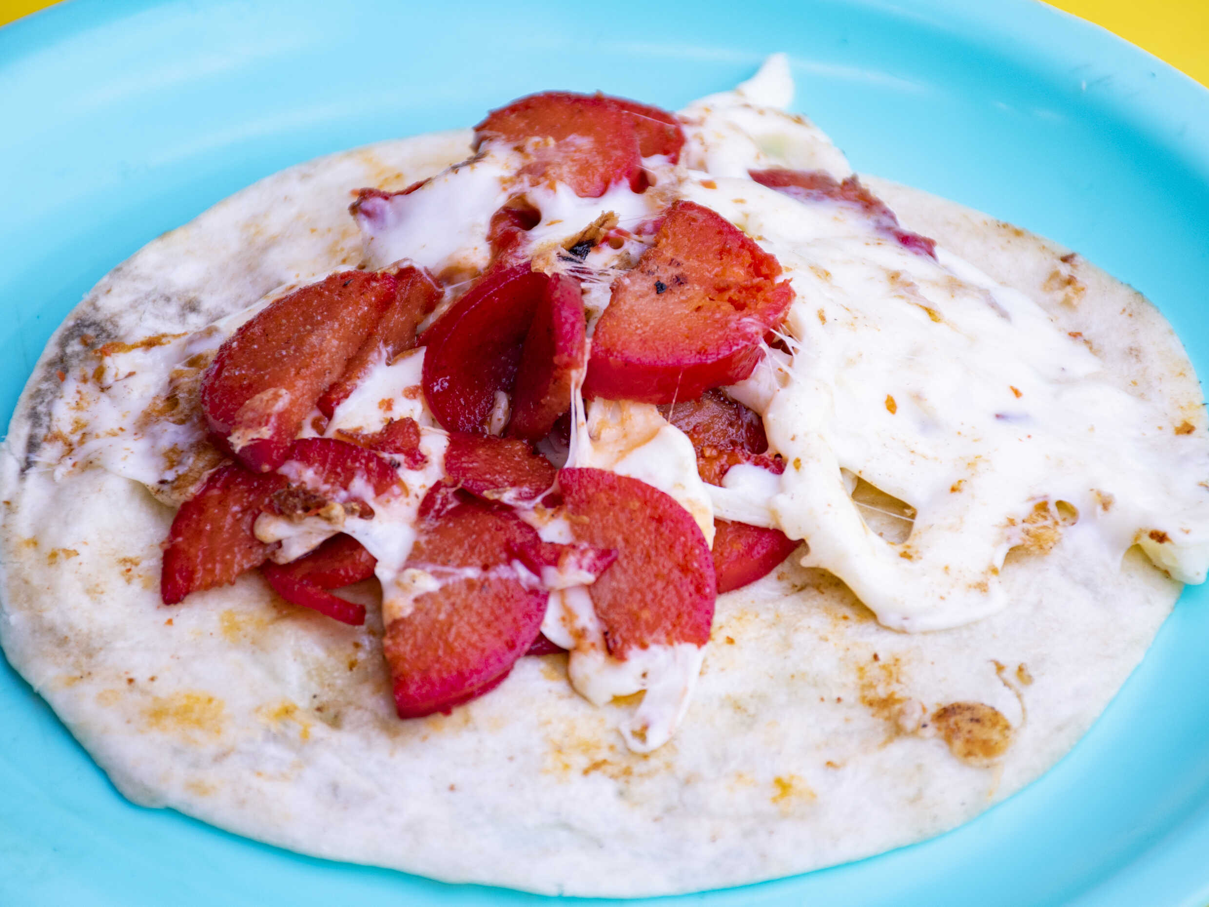 Dos tortillas de harina con chorizo rojo y queso asadero.