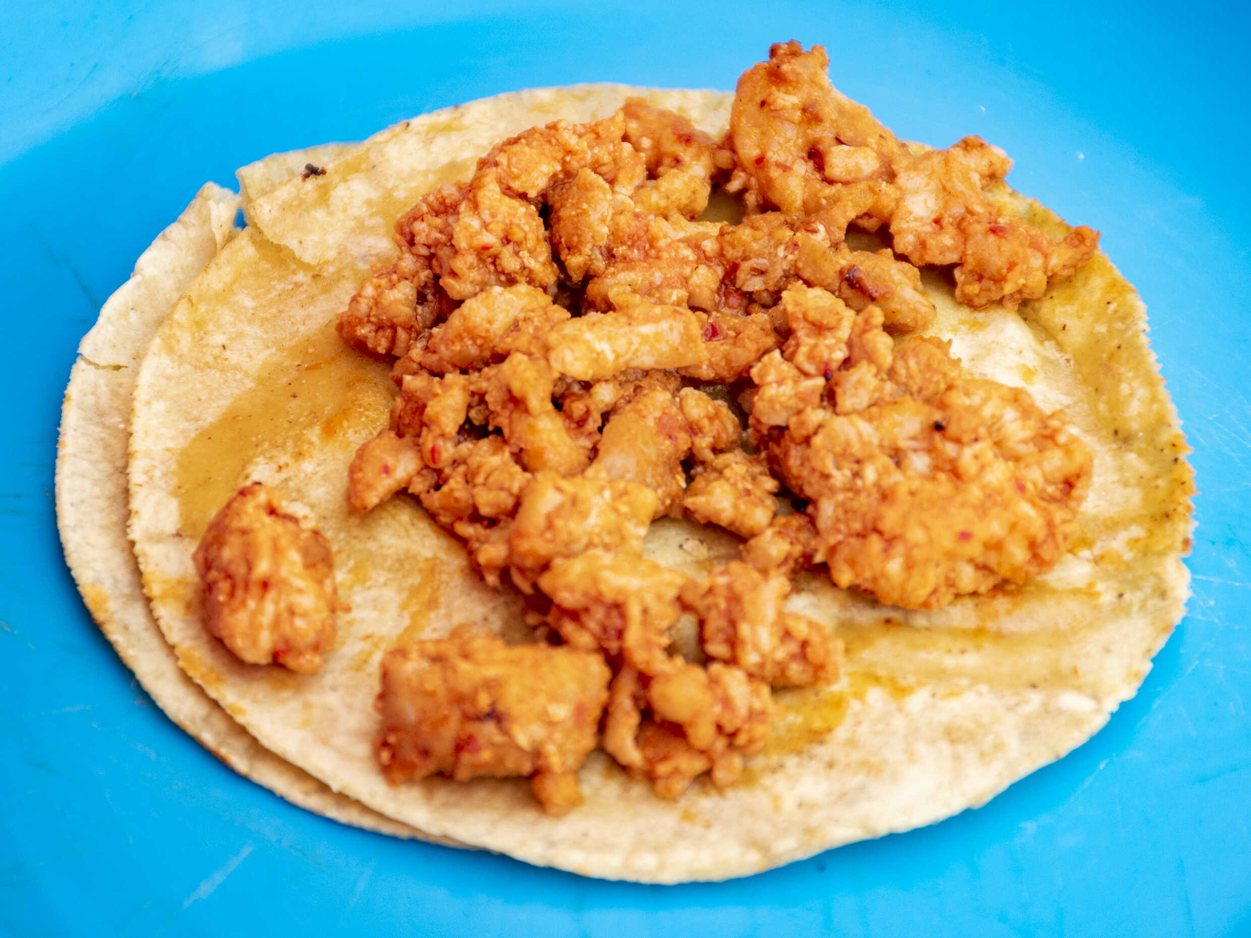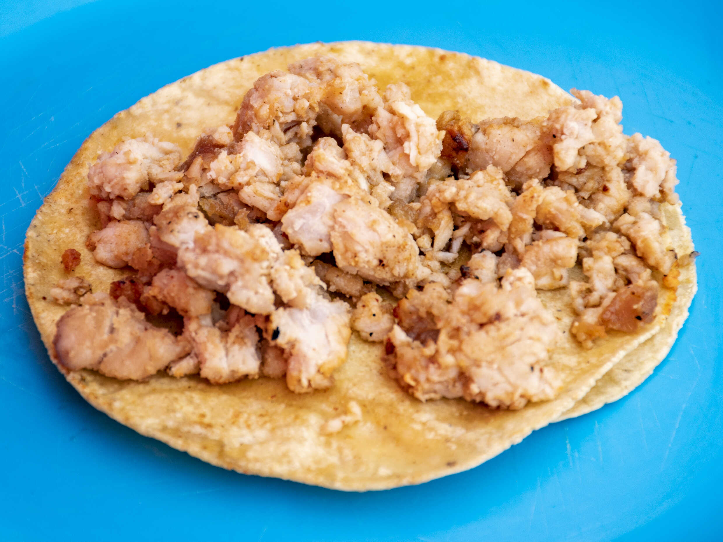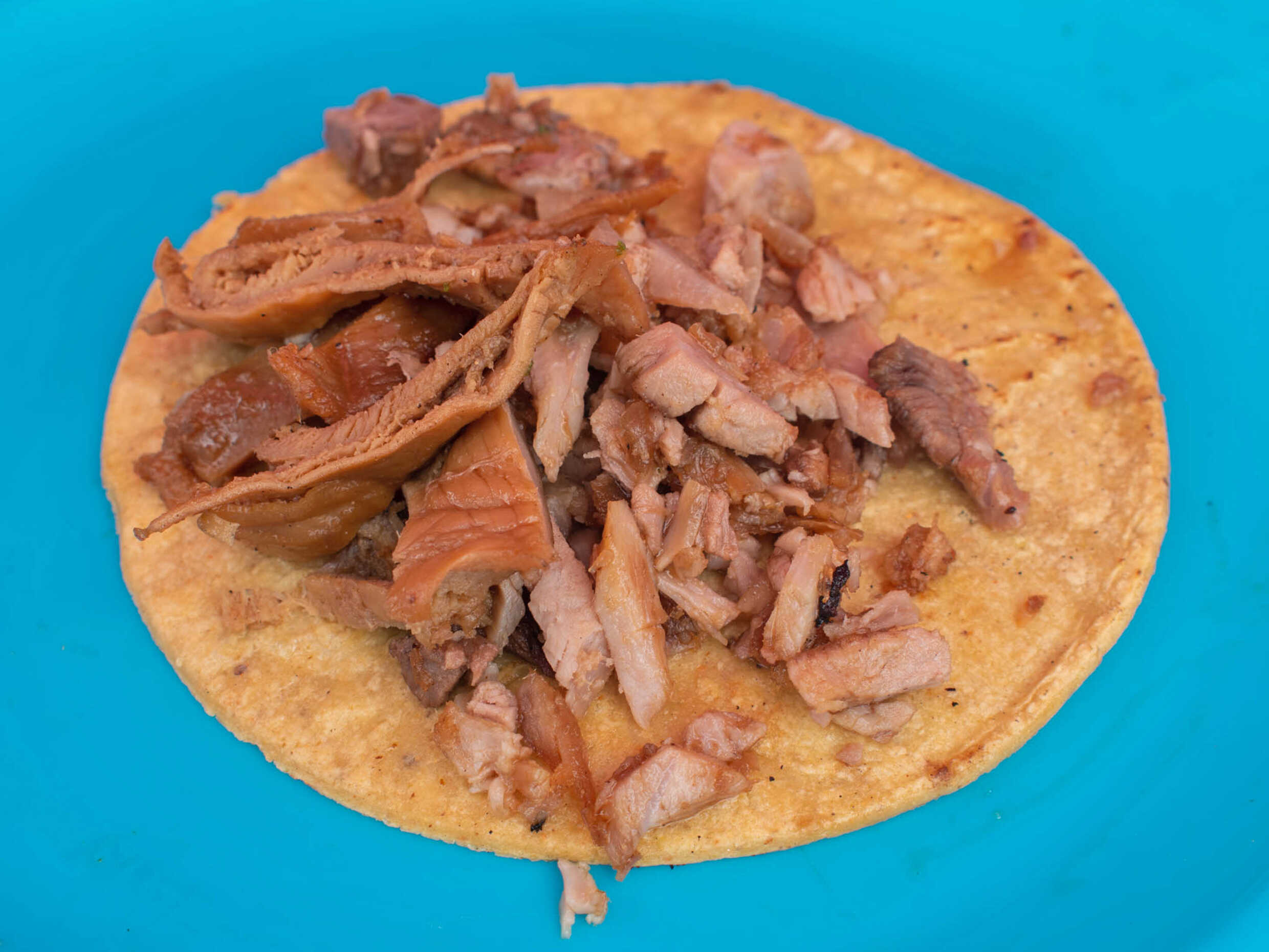 Tortilla de maíz con carnitas maciza, incluye limón y verdura.