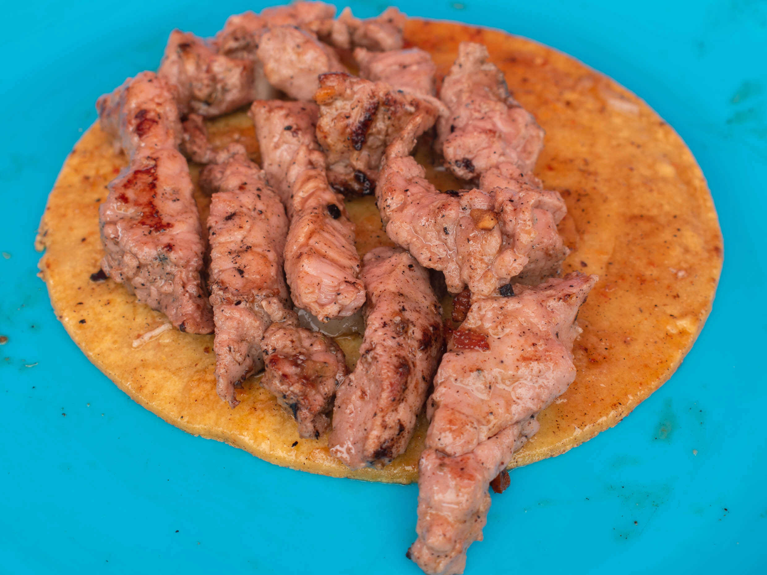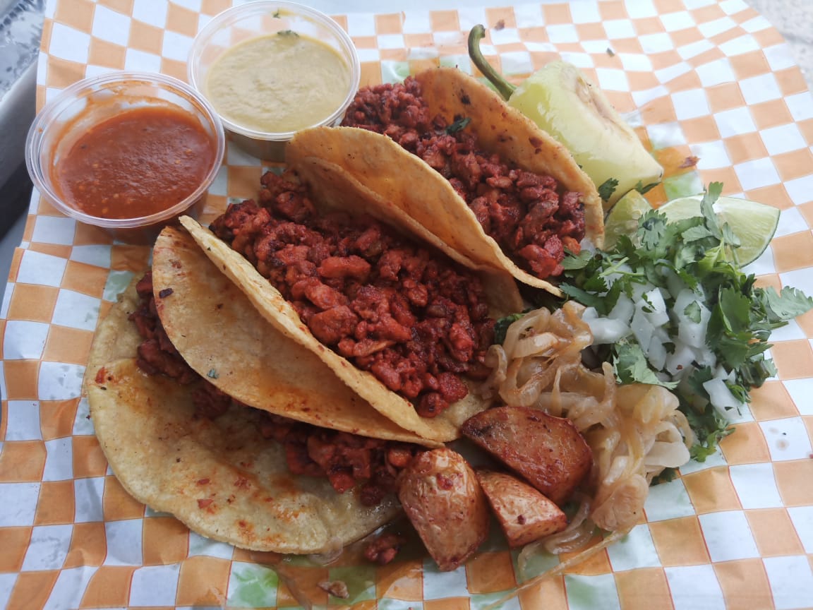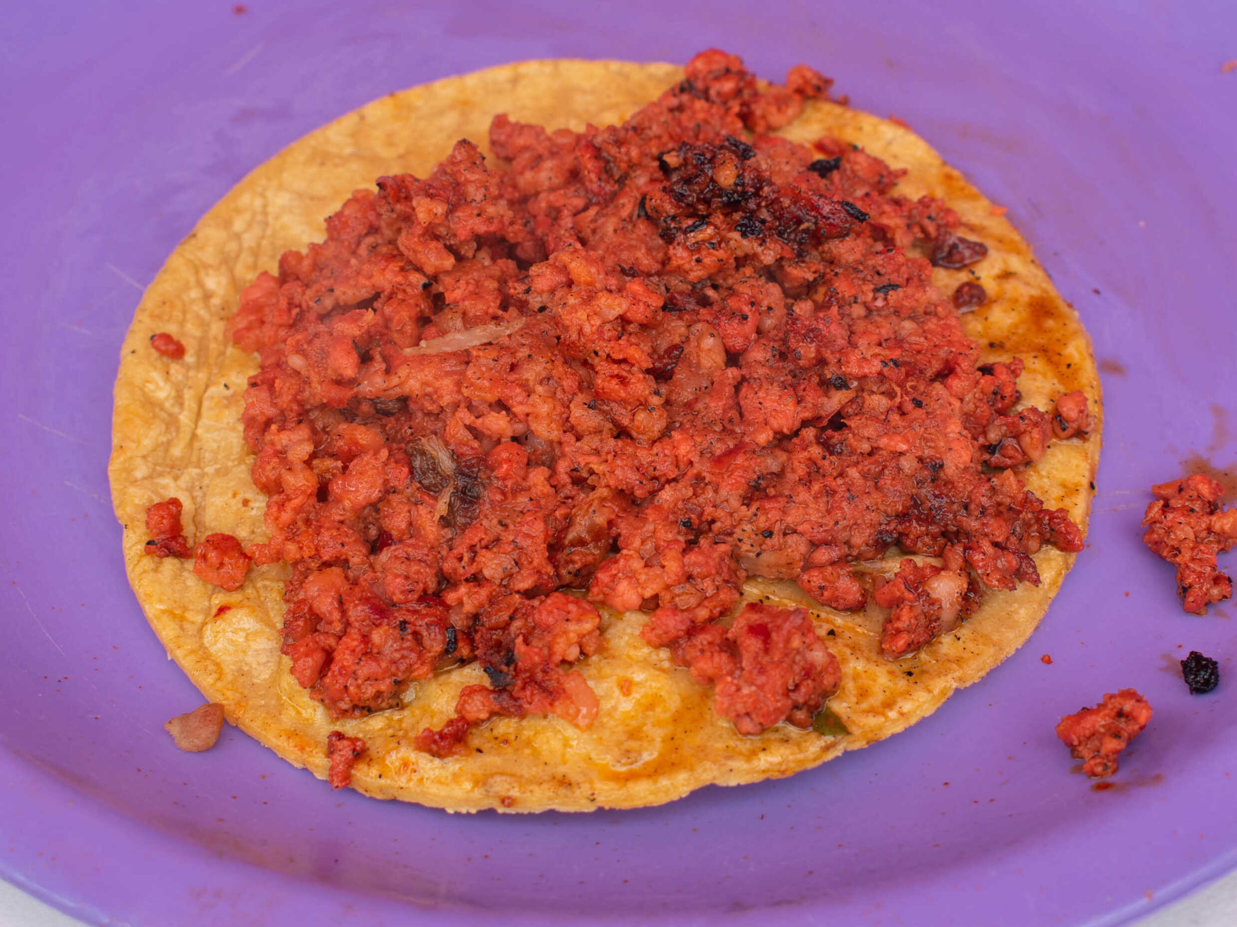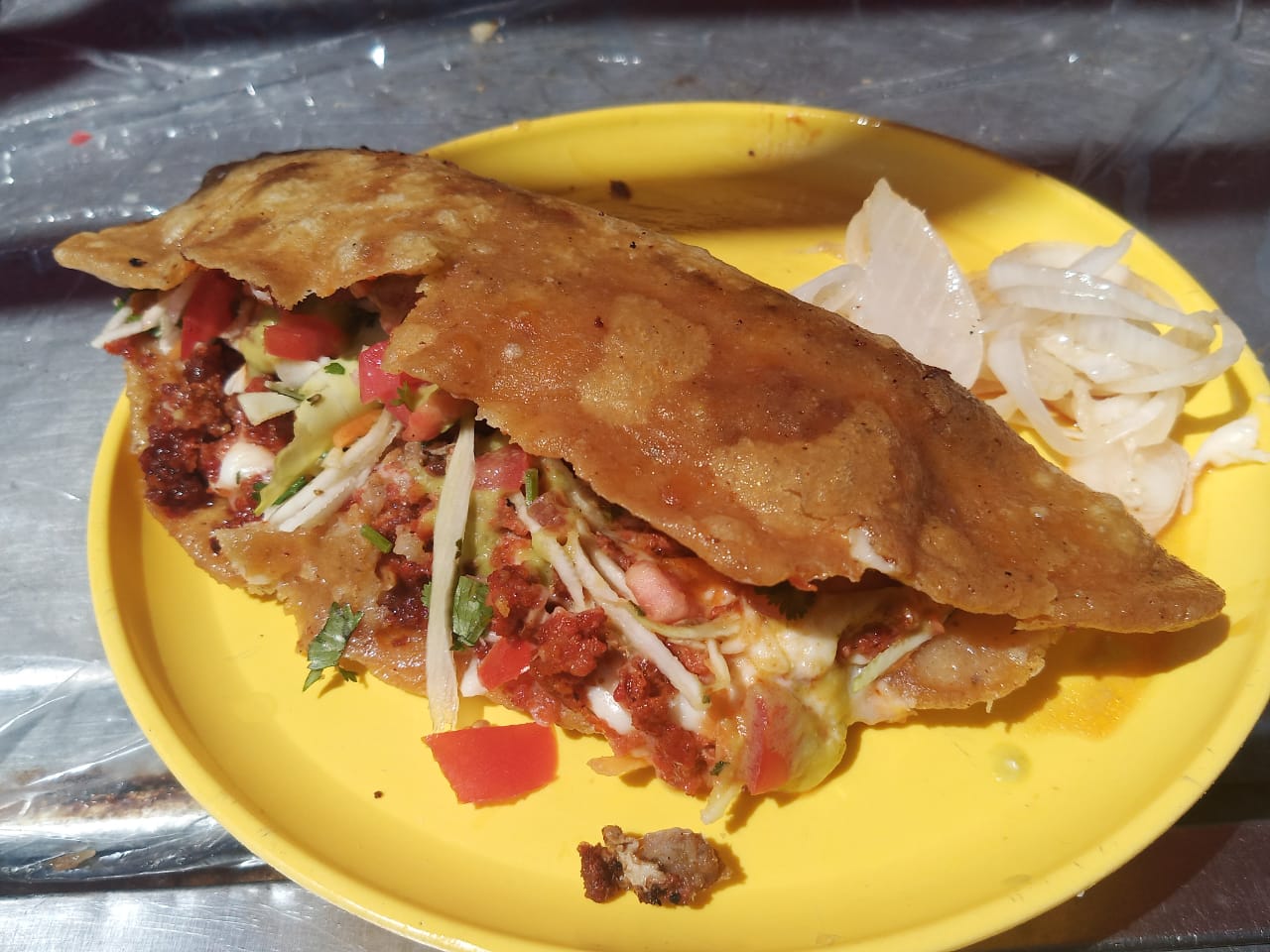 Tortilla de maíz con bistec de puerco y chorizo rojo, incluye limón y verdura.