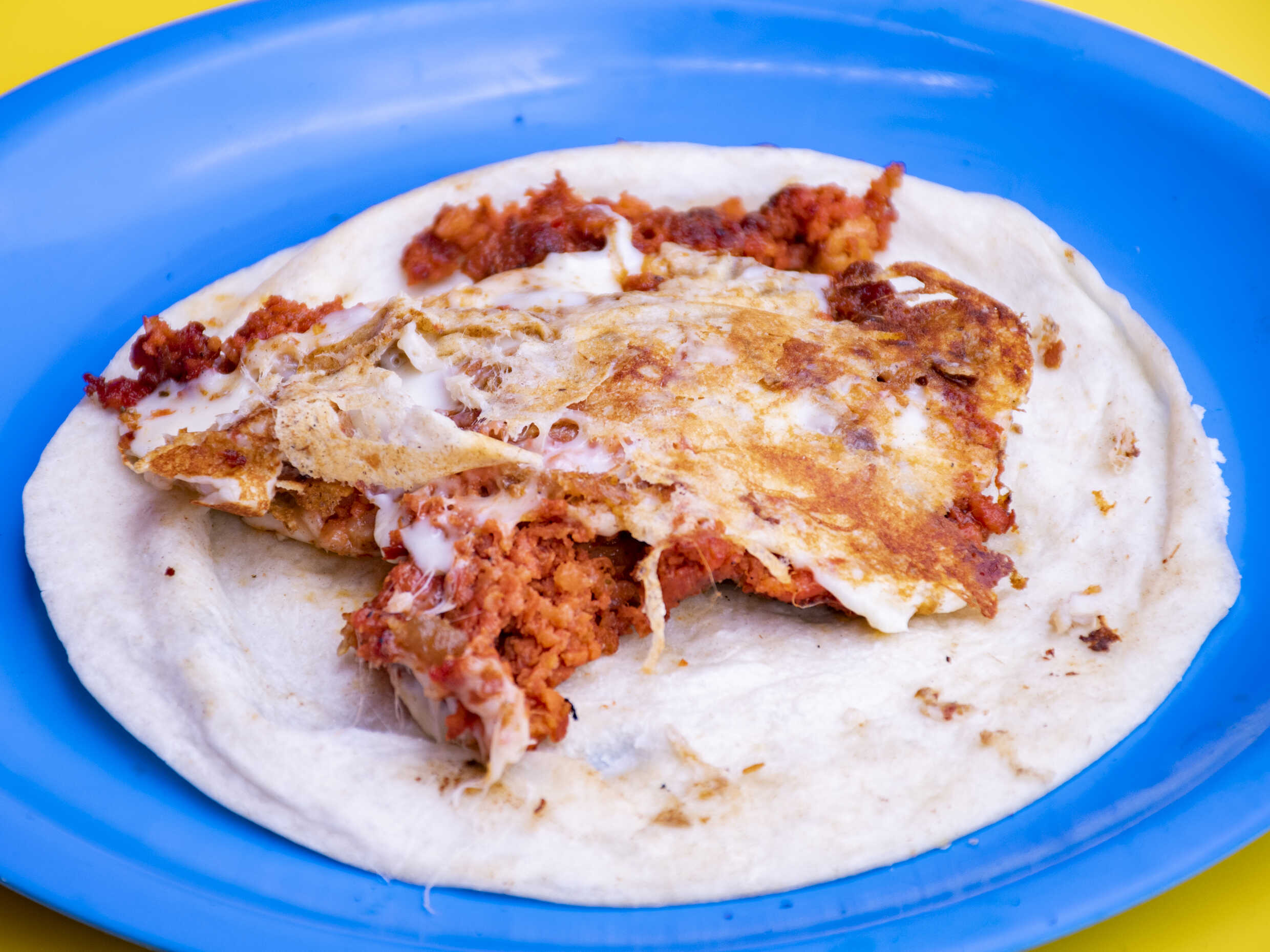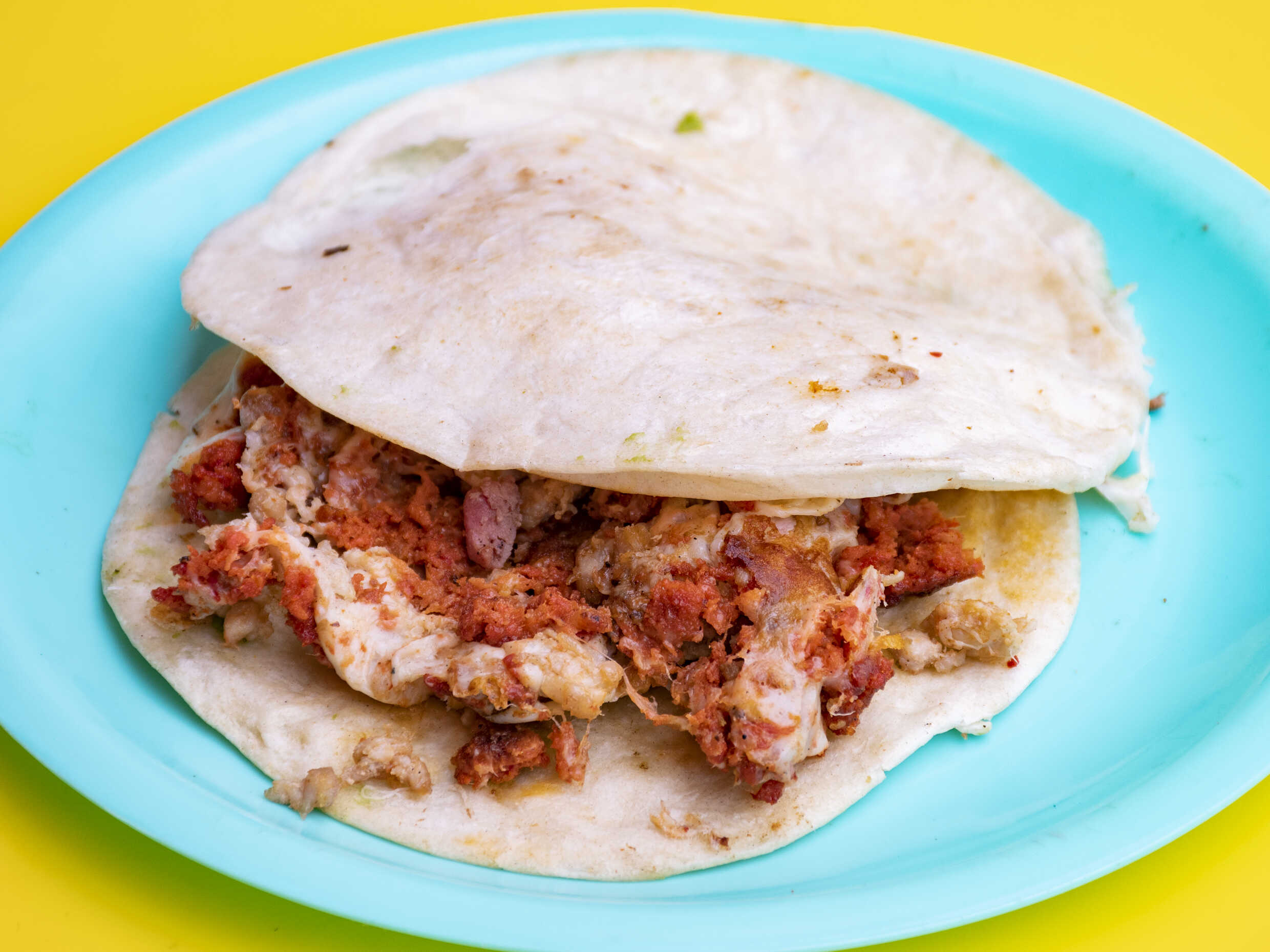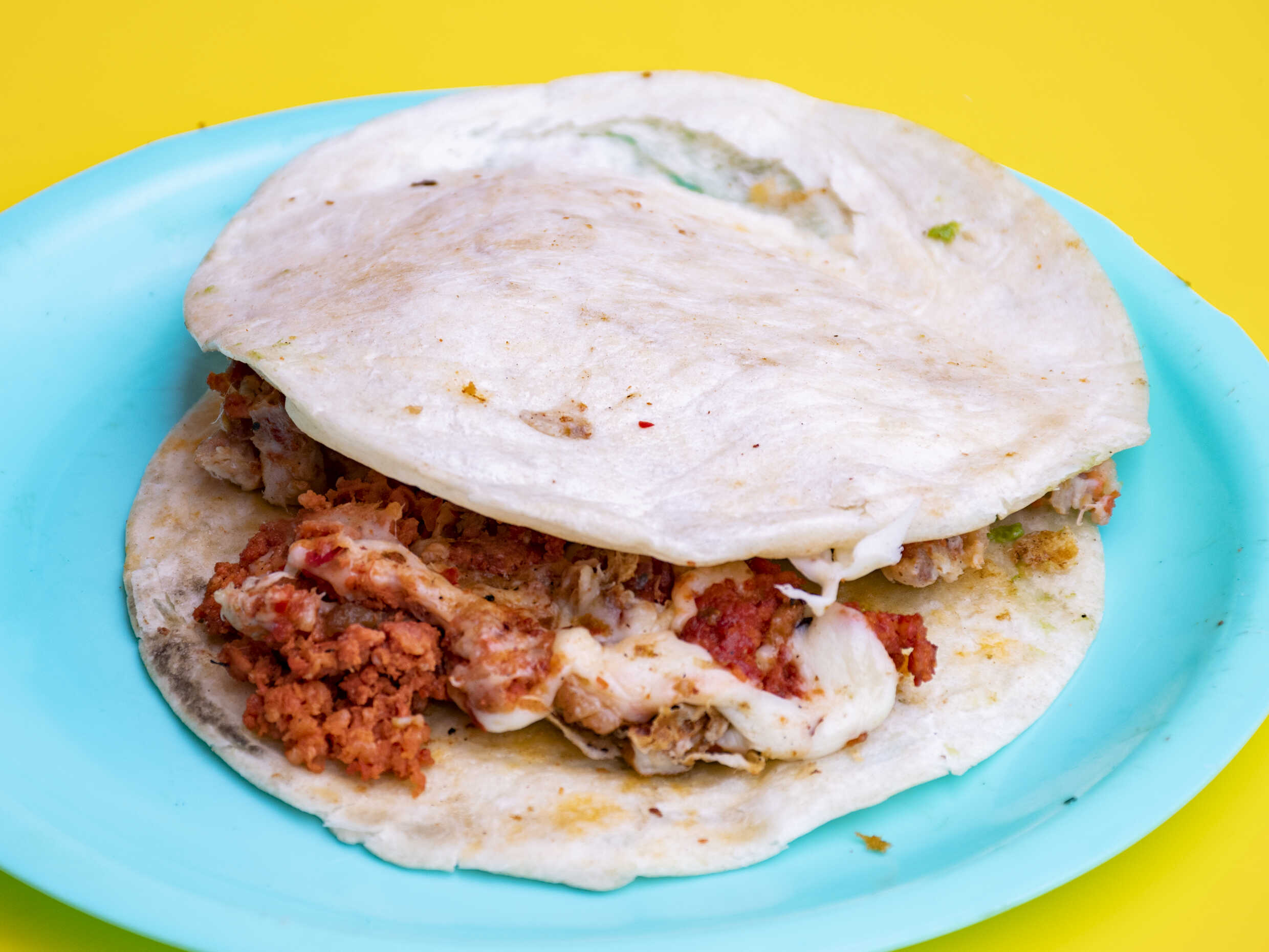 Dos tortillas de harina con bistec de puerco, chorizo rojo y queso asadero.