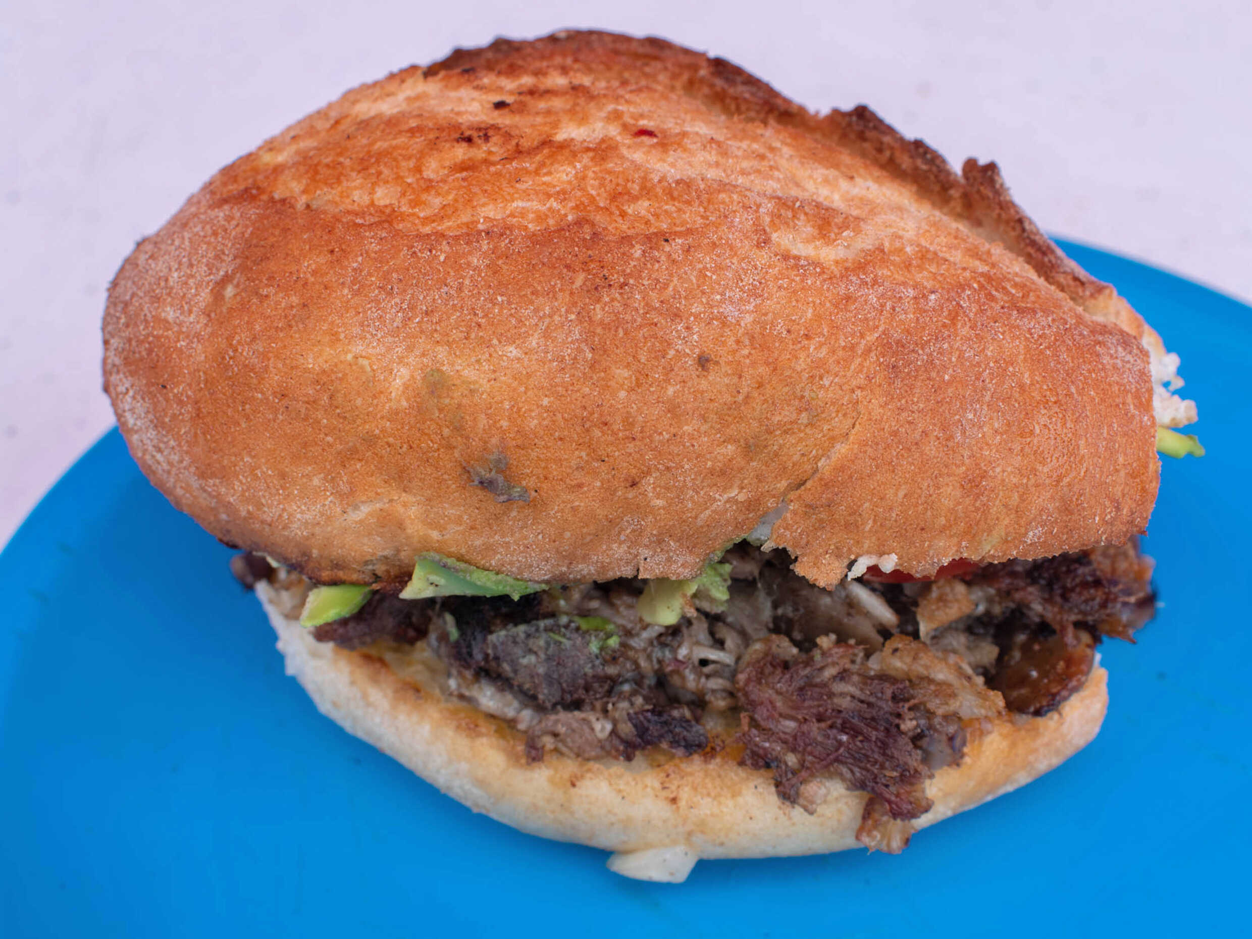 Bolillo 14 cm con chorizo y carne de lomo, mayonesa, aguacate, queso blanco y jitomate.