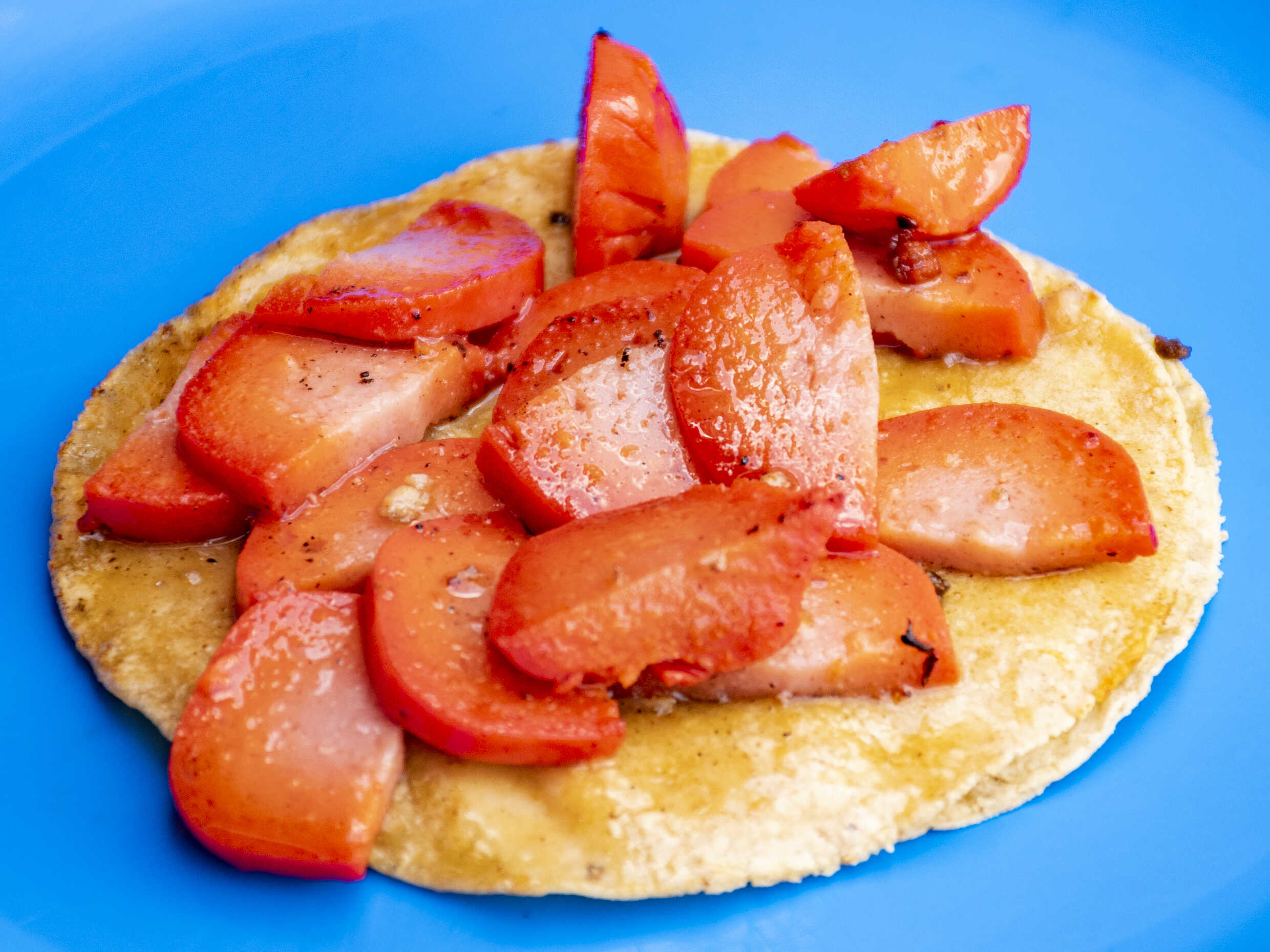 Tortilla de maíz con salchichón, incluye limón y verdura.