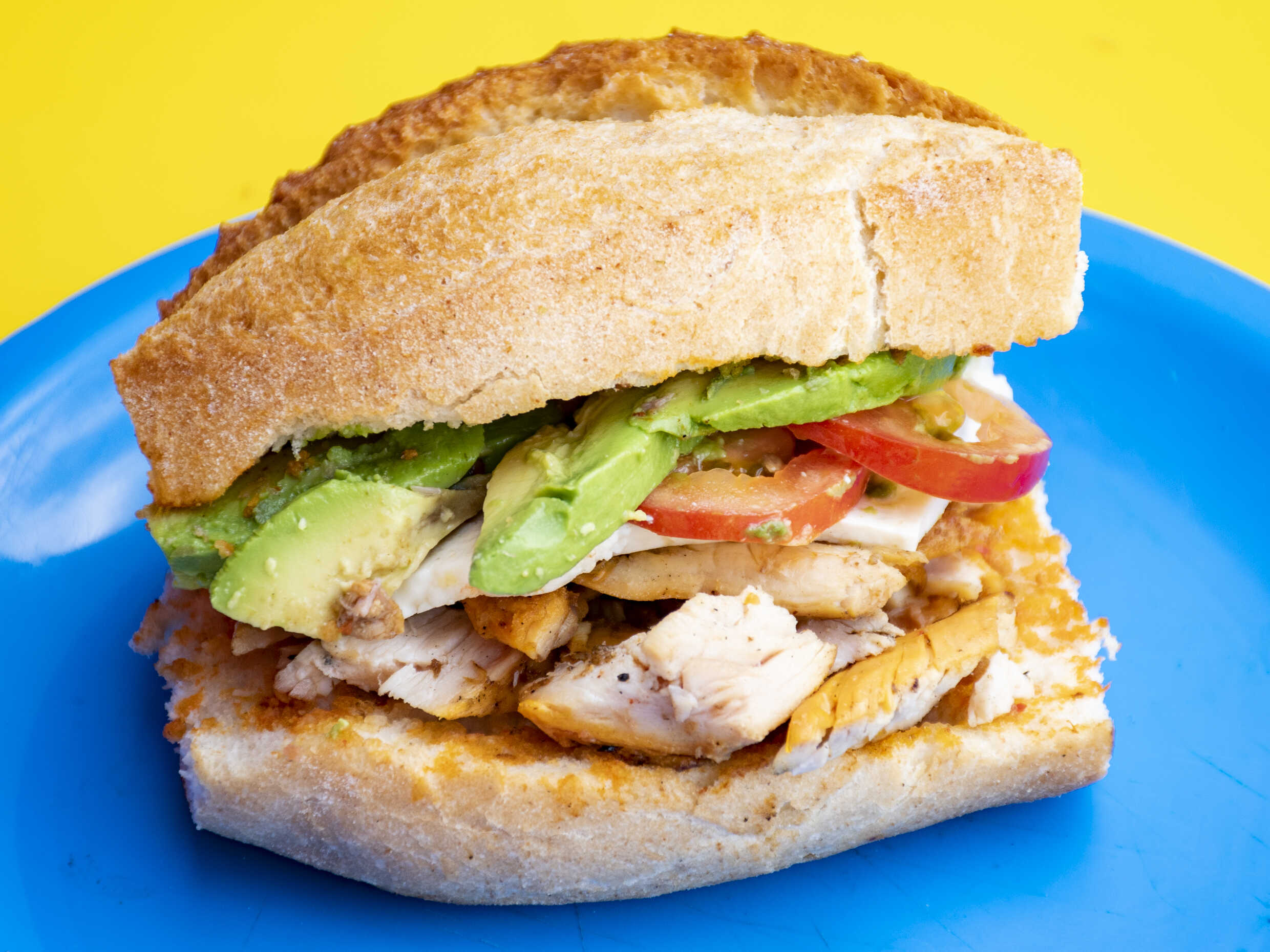 Bolillo 14 cm con carne de pollo, mayonesa, aguacate, queso y jitomate.