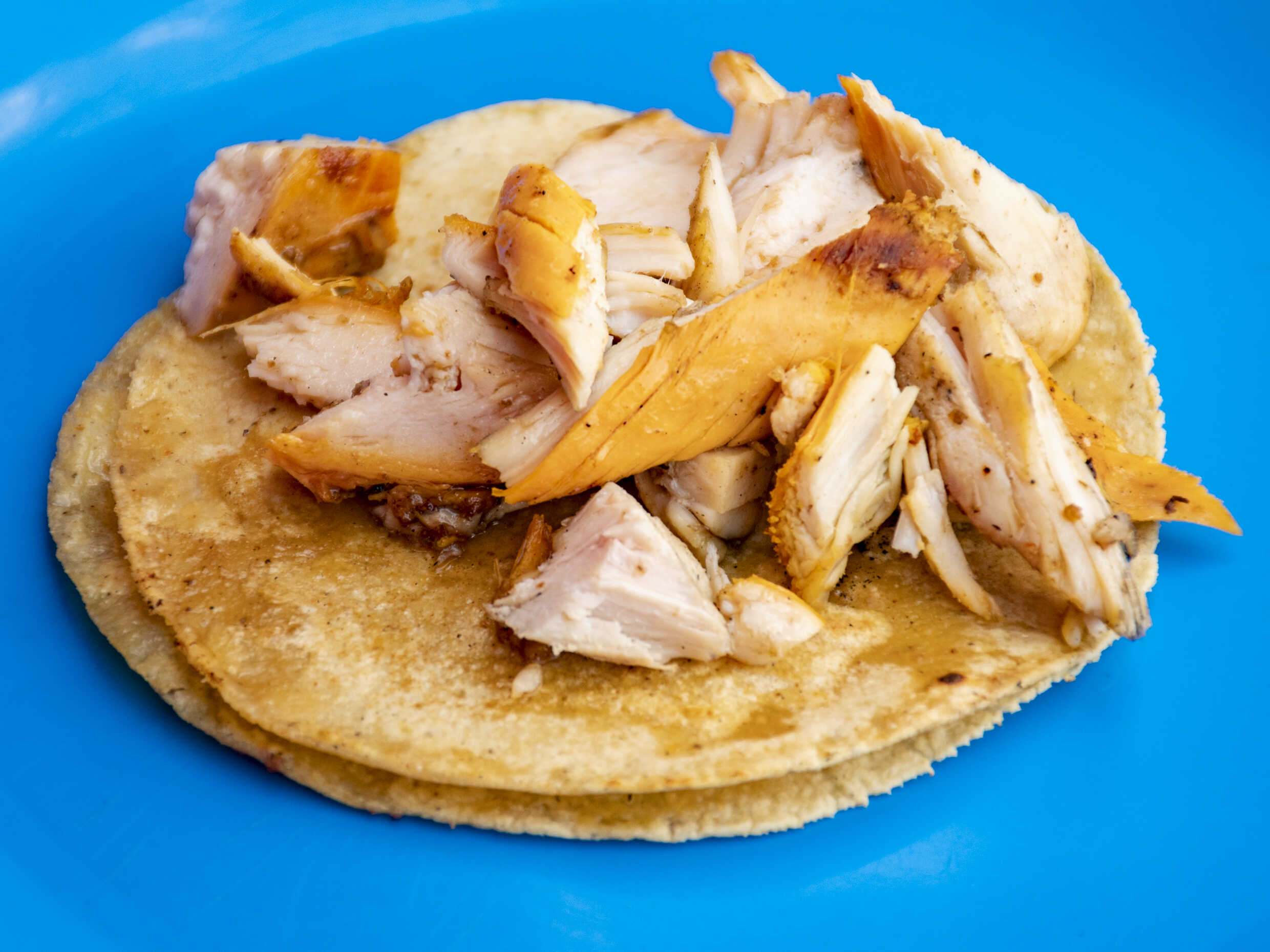 Tortilla de maíz con carne de pollo, incluye limón y verdura.