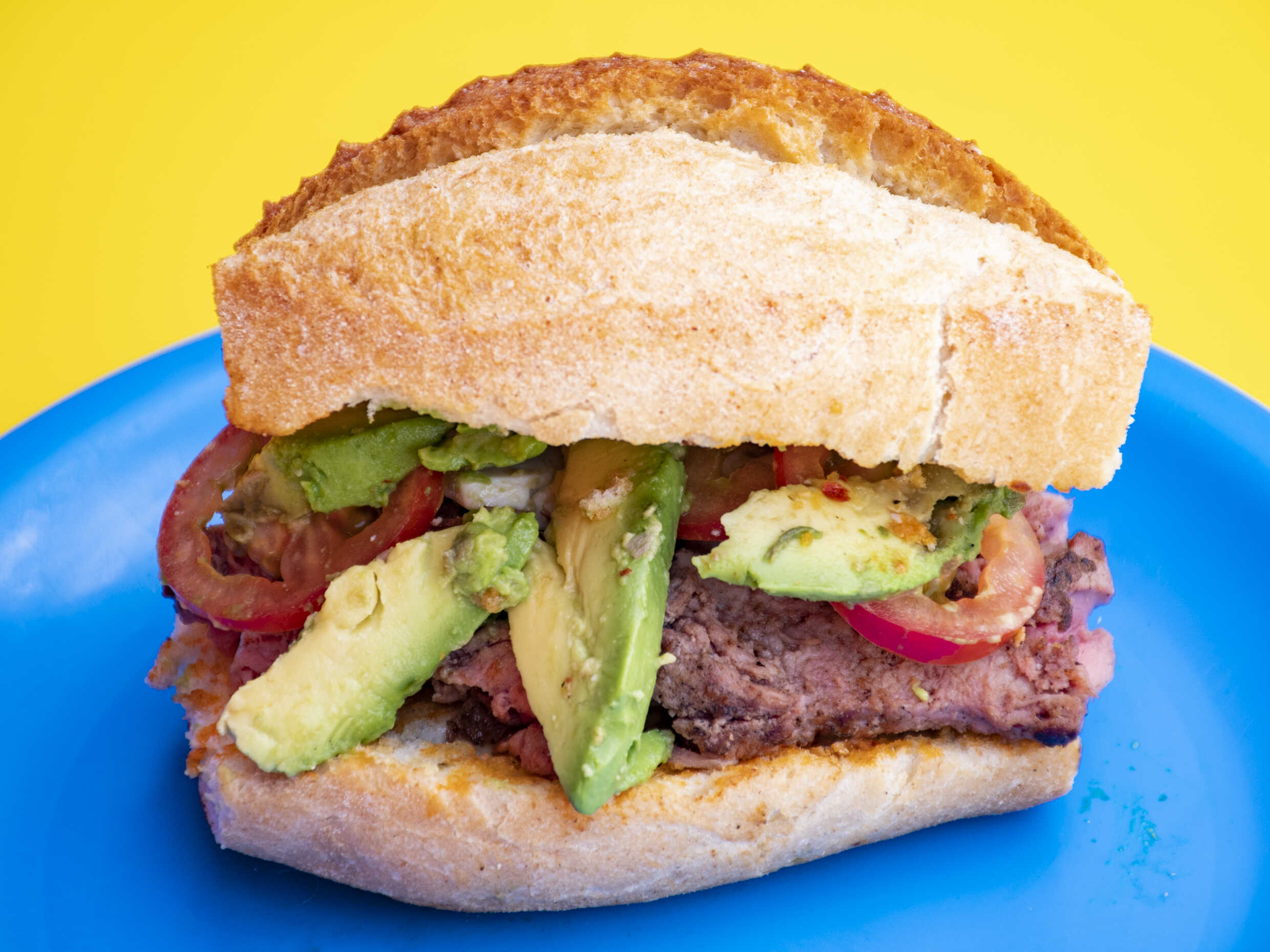 Bolillo 14 cm con carne arrachera, mayonesa, aguacate queso y jitomate.