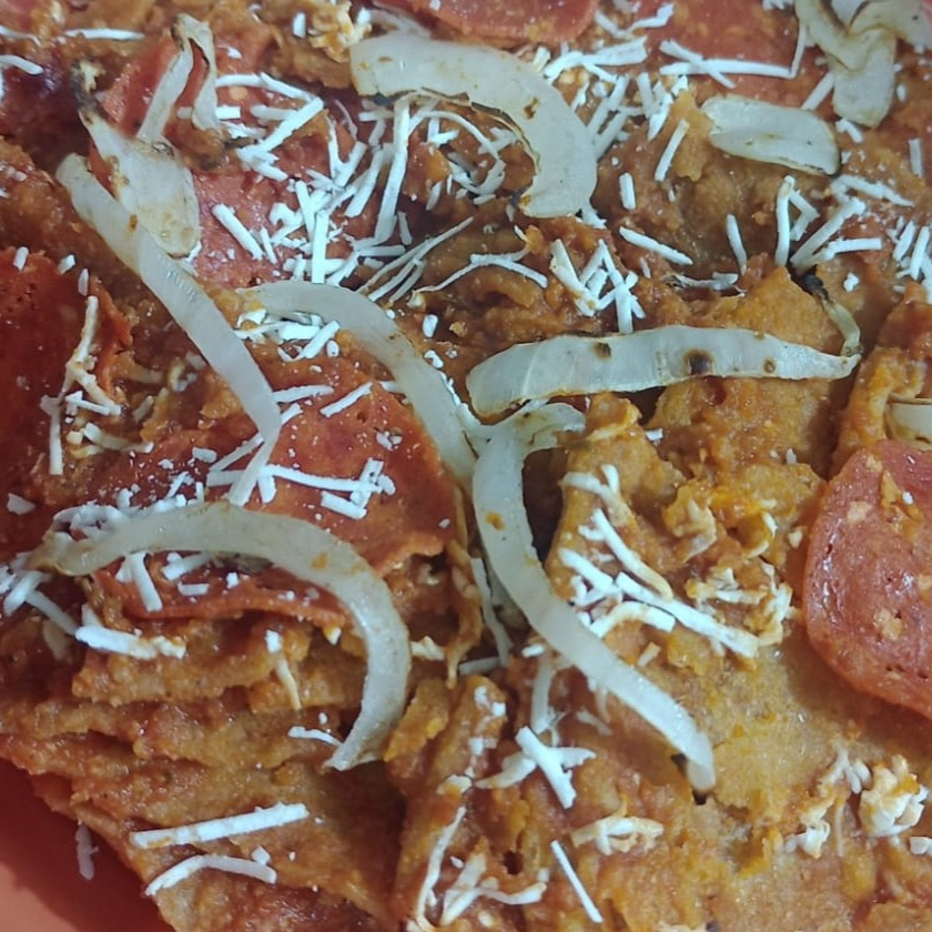 Peperoni horneado, Deliciosa Salsa de pizza y queso ligeramente picosita con tortilla de maíz frita, espolvoreada de queso y un toque de cebolla cocida al horno. (CHAROLA GRANDE)