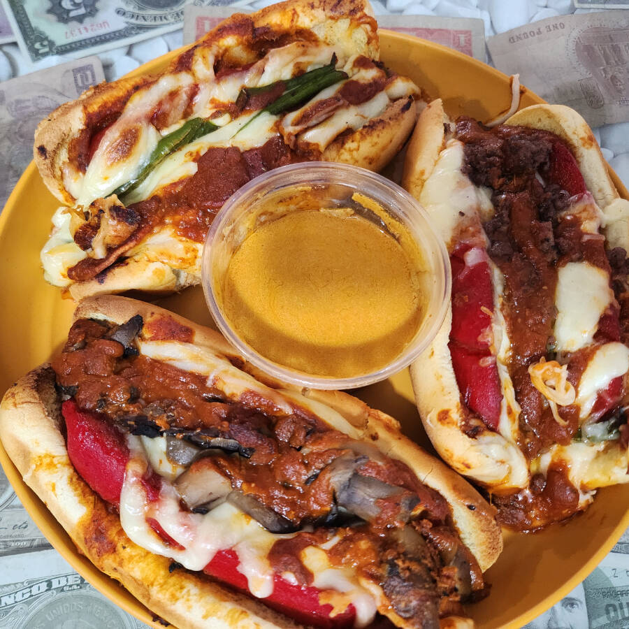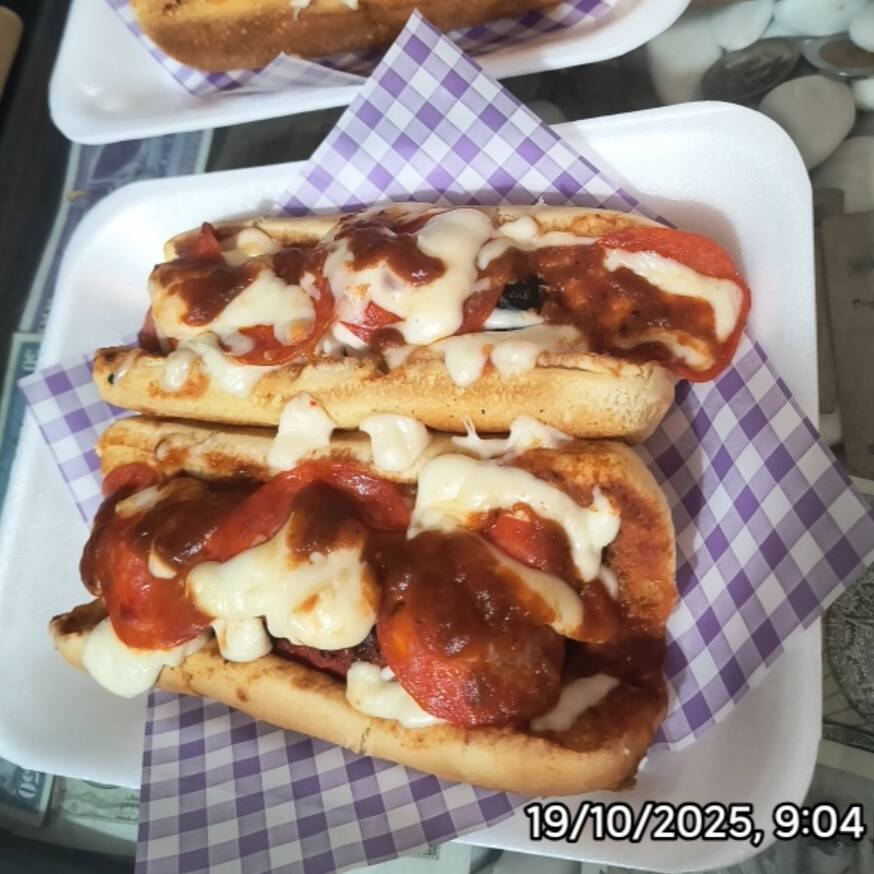 Salchicha roja asada ,salsa de pizza, queso gratinado al horno en base de bolillo grande (tres mitades)