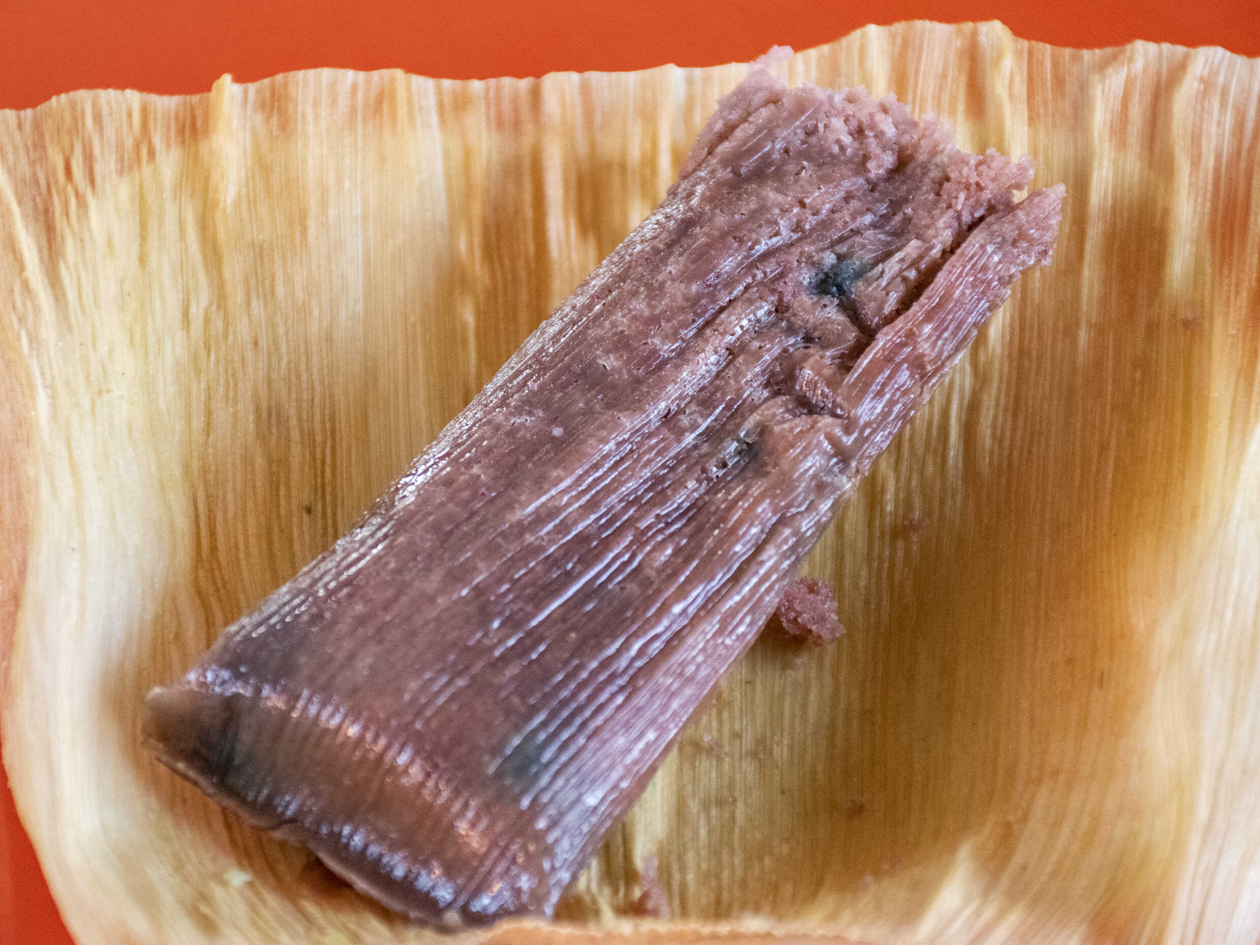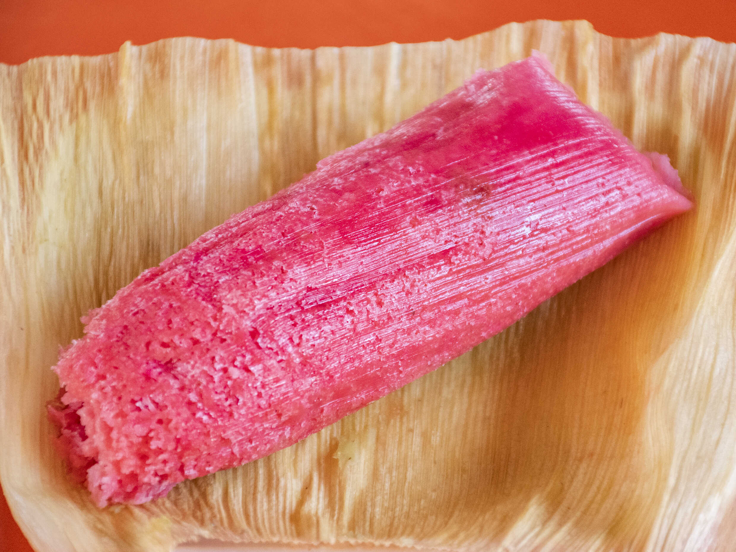 Masa de harina de maíz endulzada, con esencia de fresa y pasas