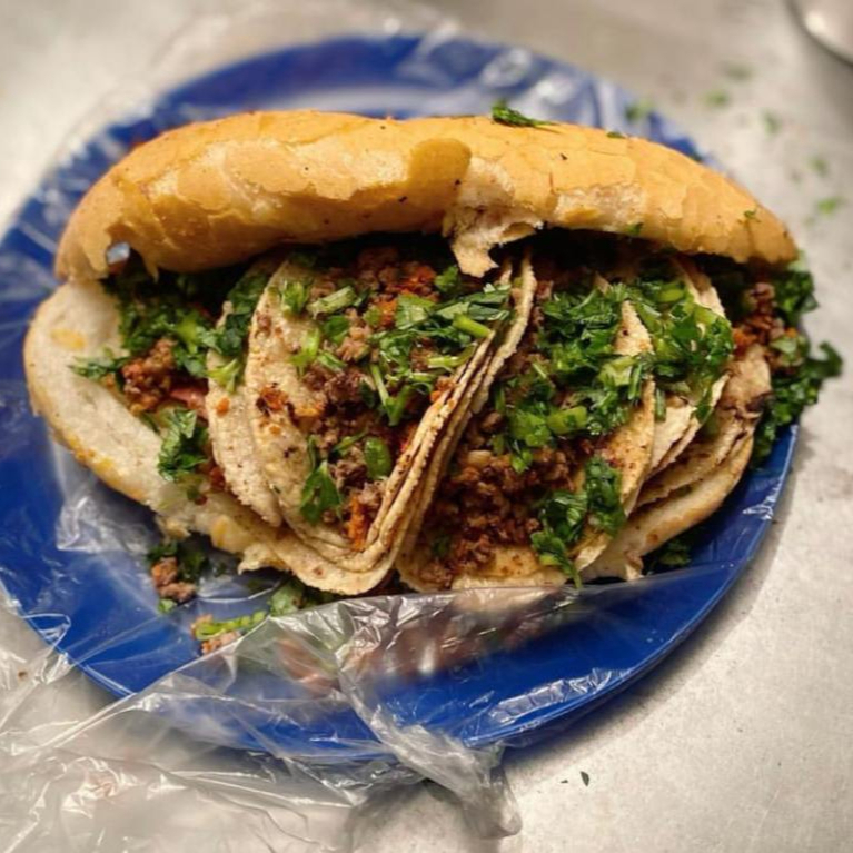 Tortilla de harina, carne bien sazonada, cebolla, cilantro y salsas caseras.