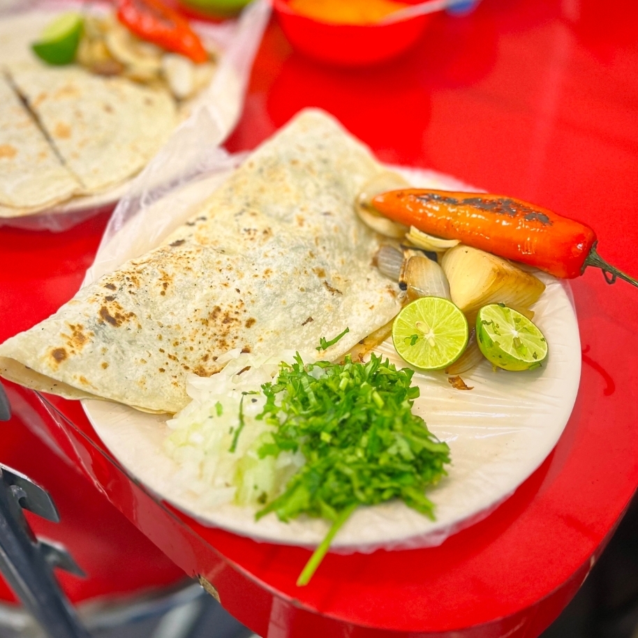 Tortilla de harina gigante doblada a la mitad con queso y carne de tu elección.