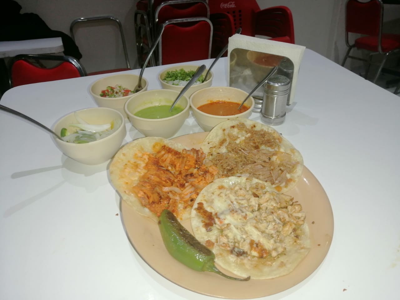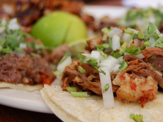 Deliciosa carne de Res acompañada con tortilla de maíz complementa con salsa roja, salsa verde, cebolla, cilantro y cebolla desflemada.