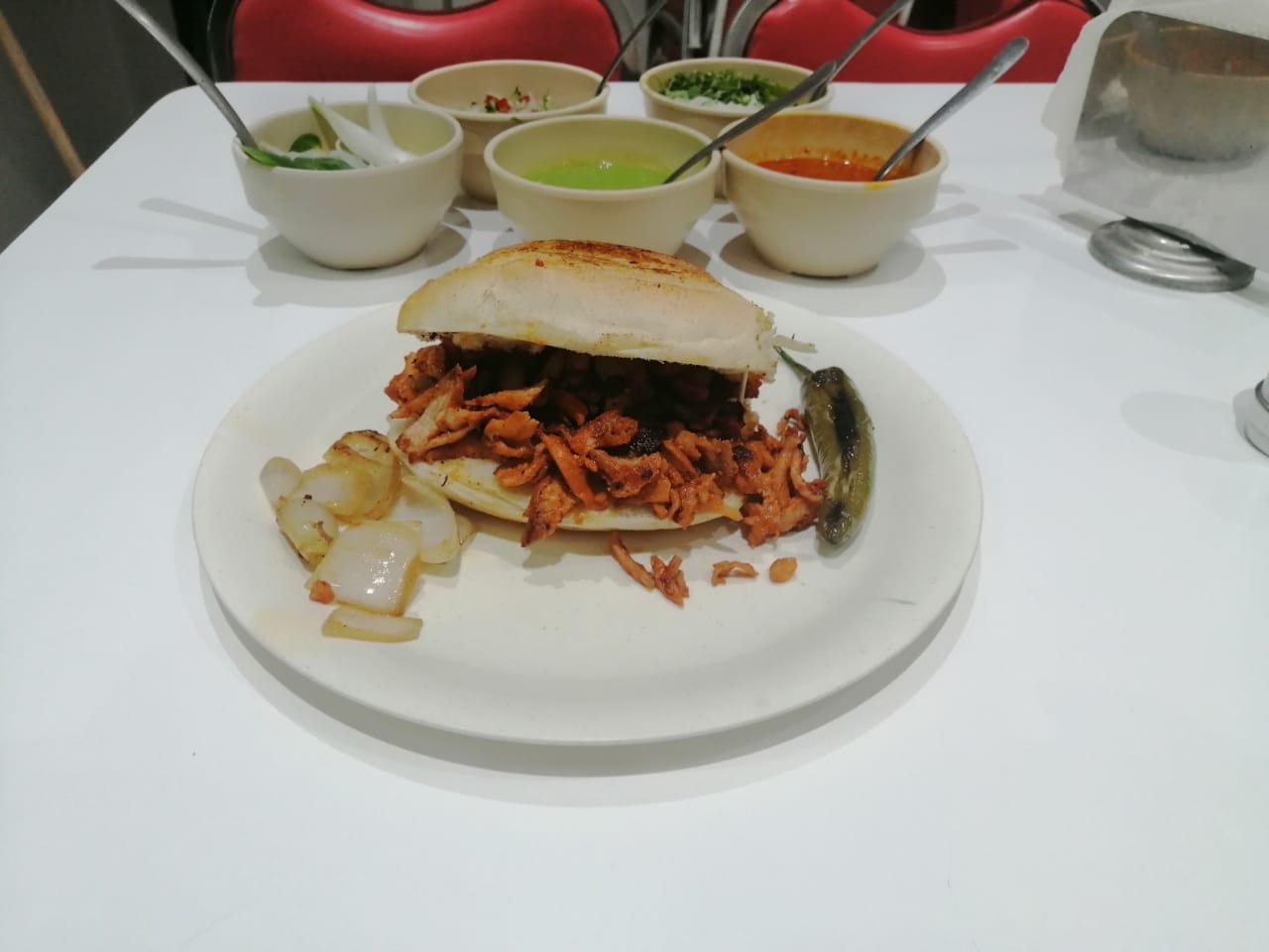 Bolillo con delicioso carne al pastor. Complementada con salsa roja, verde, cebolla, cilantro y cebolla desflemada.