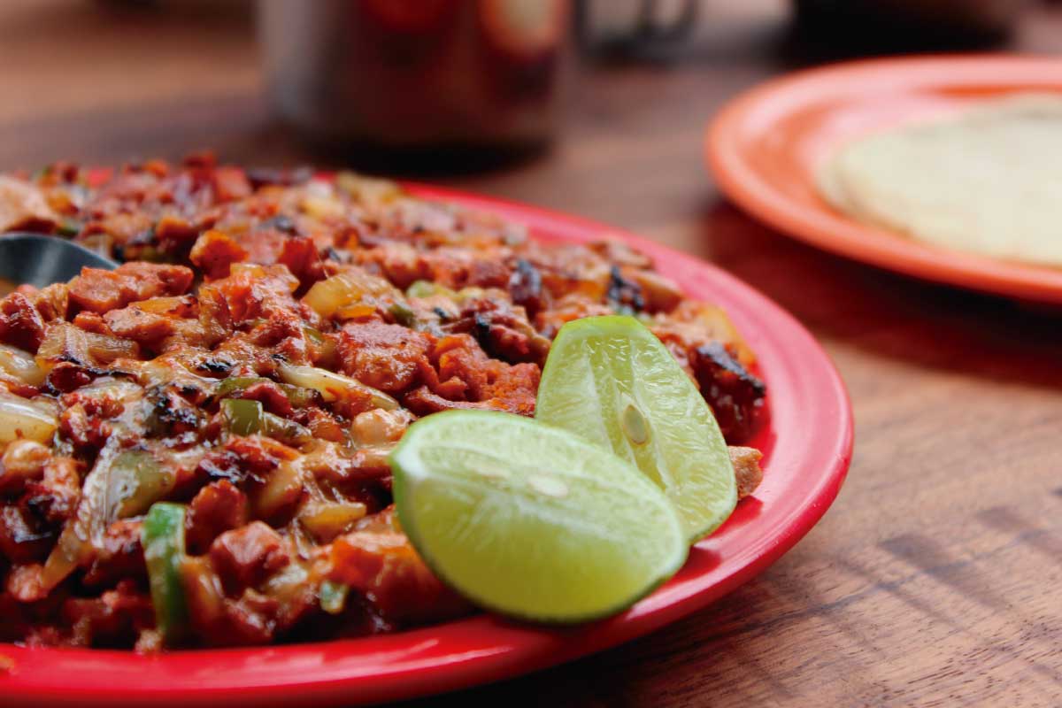 Deliciosa carné de puerco acompañada con queso sobre una tortilla de harina. Complementada con salsa roja, salsa verde, cebolla, cilantro y cebolla desflemada.