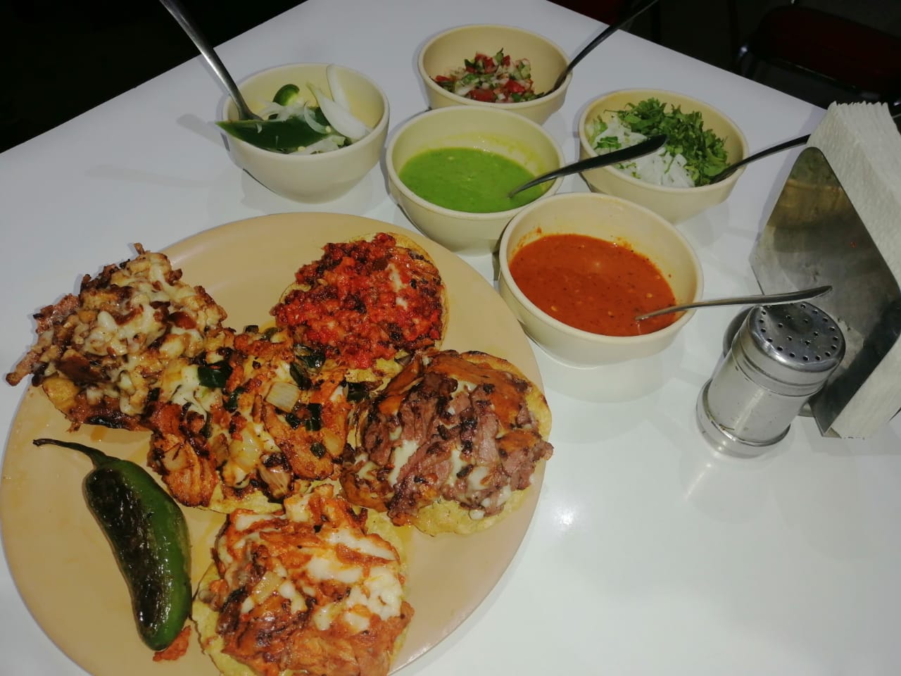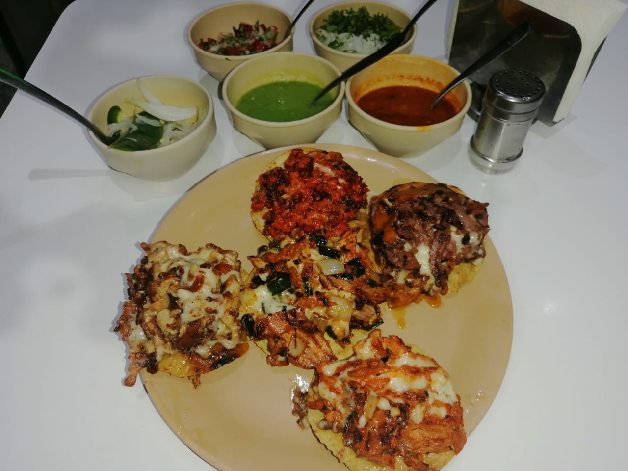Deliciosa combinación de carné al Pastor, Bistec, Tocino, Cebolla, Chile Poblano y queso sobre una tostada. Complemetado con salsa roja, salsa verde, cebolla, cilantro y cebolla desflemada.