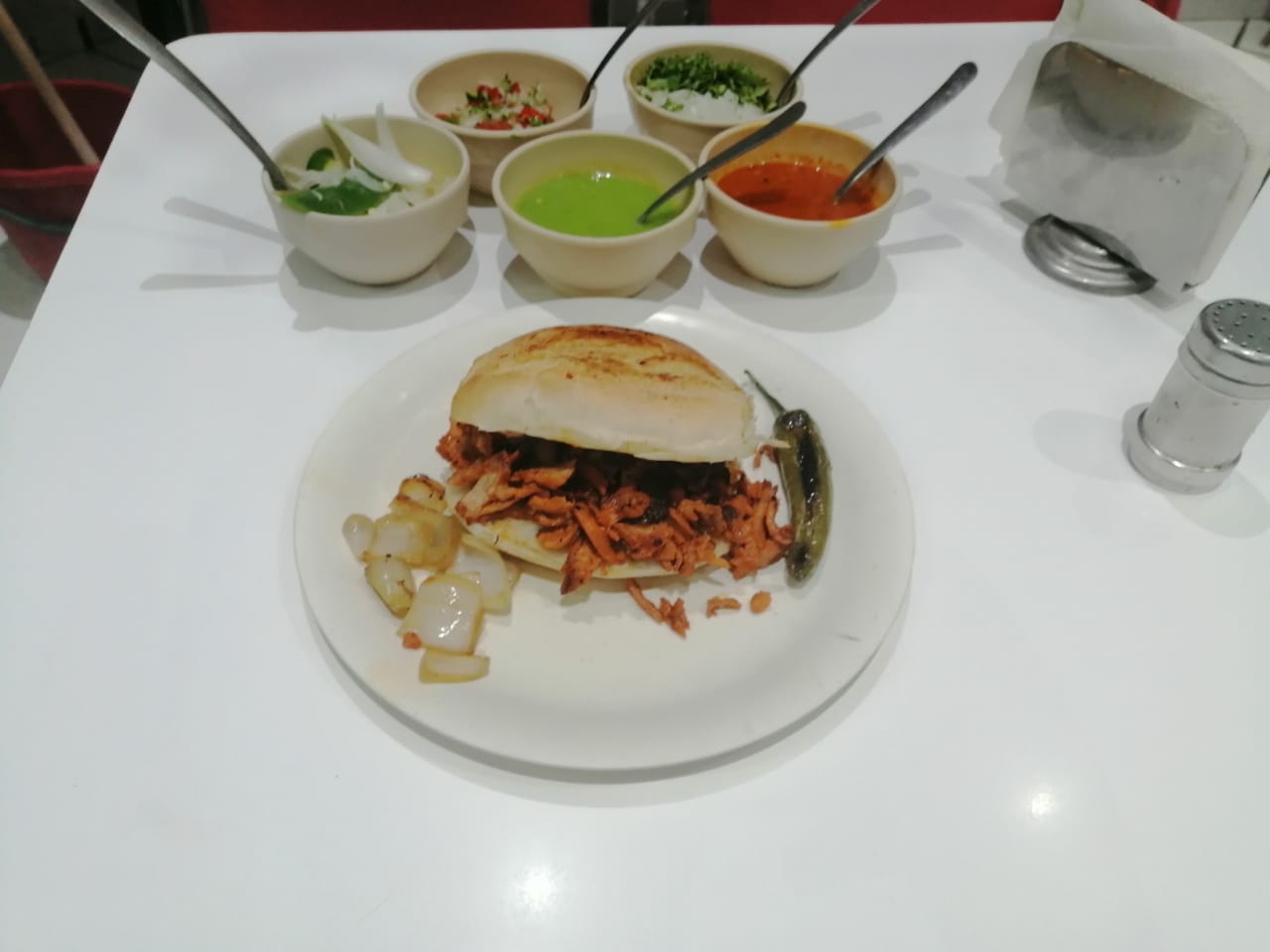 Bolillo con carne, Incluyen salsa verde y roja, pico de gallo, cebolla con habanero.