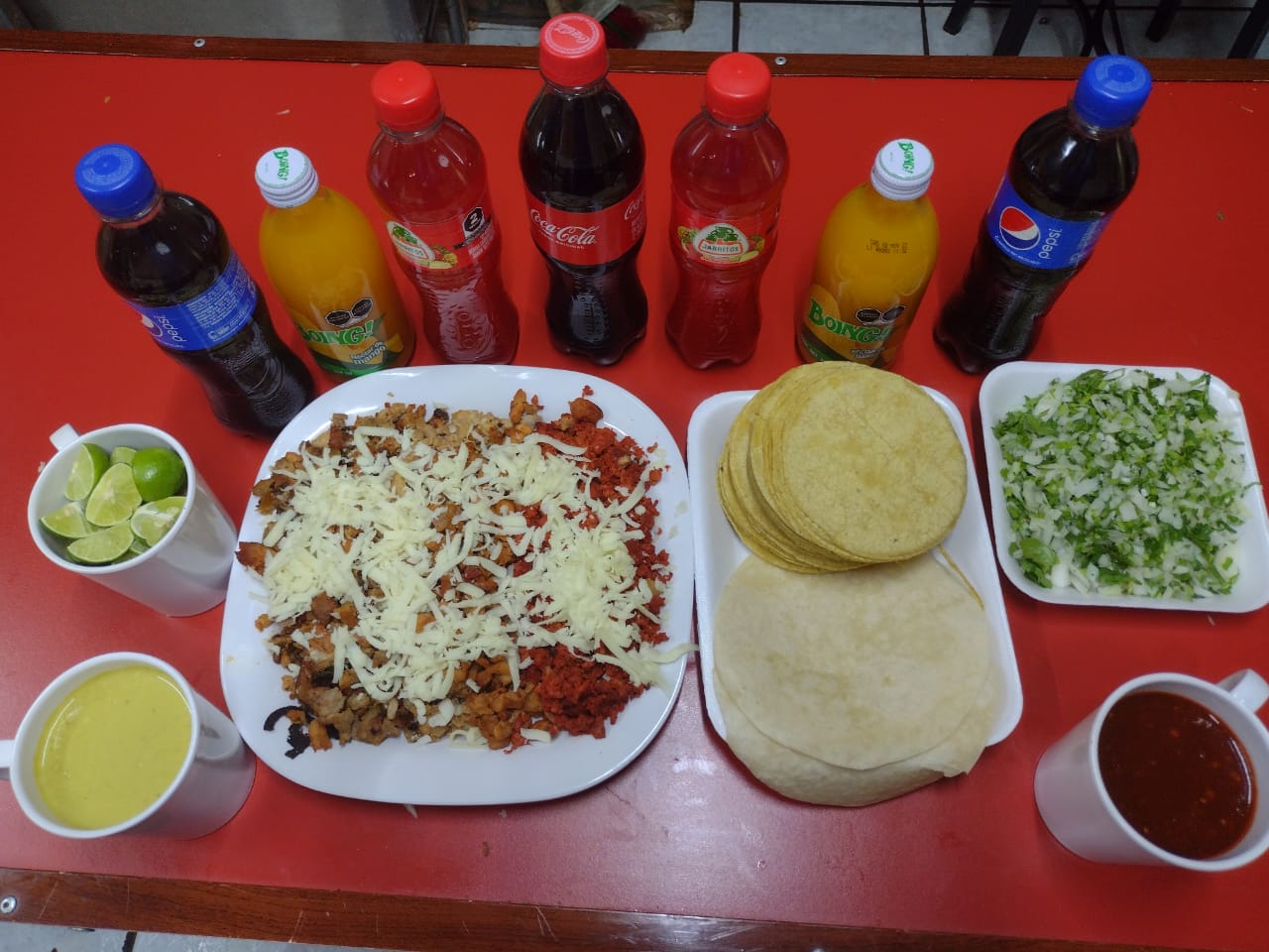 1 parrillada mixta (pastor, bistec, alambre y chorizo)12 tortillas de maíz y 3 tortillas de harina