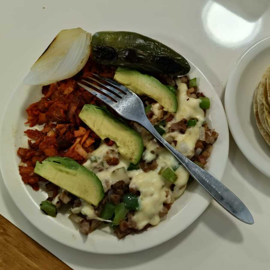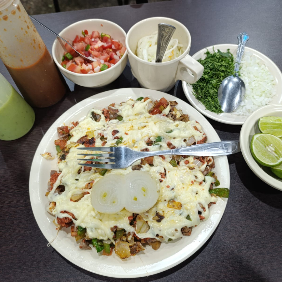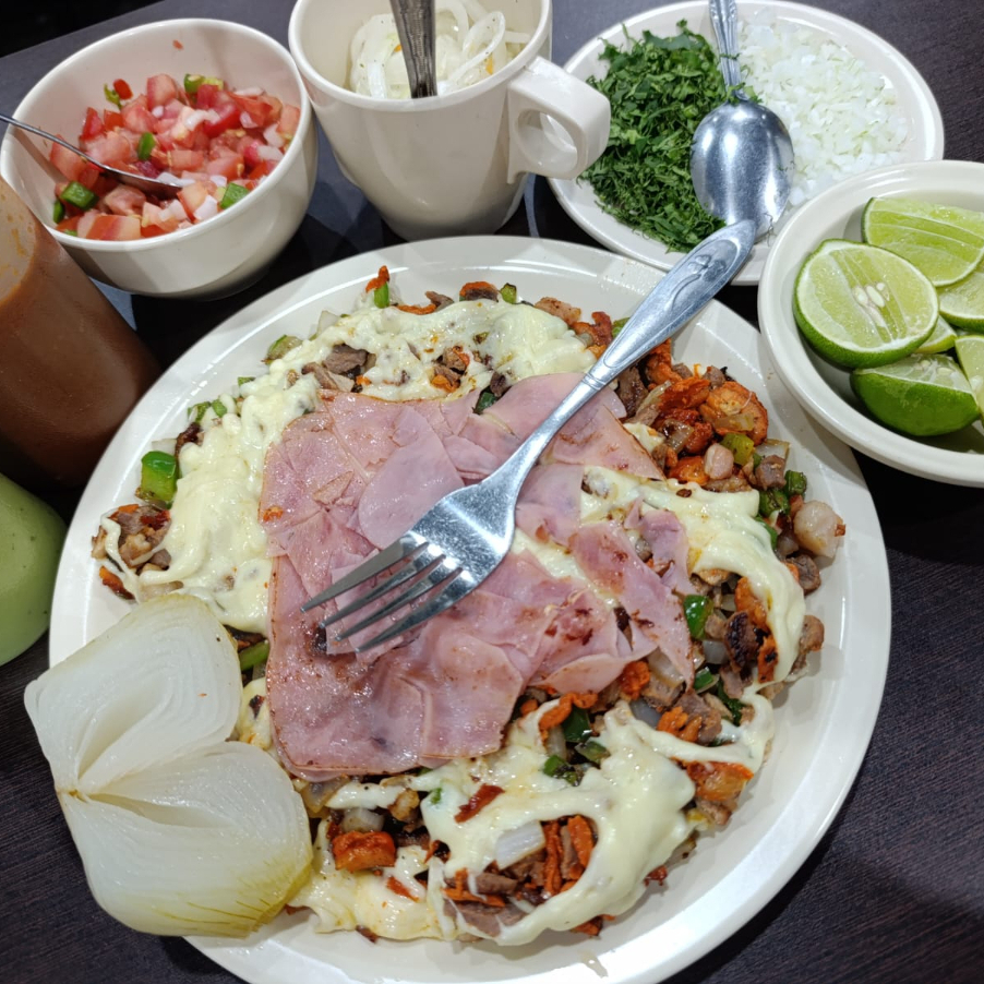 Bistec, chuleta, pastor, pimiento, cebollas, queso y aguacate.