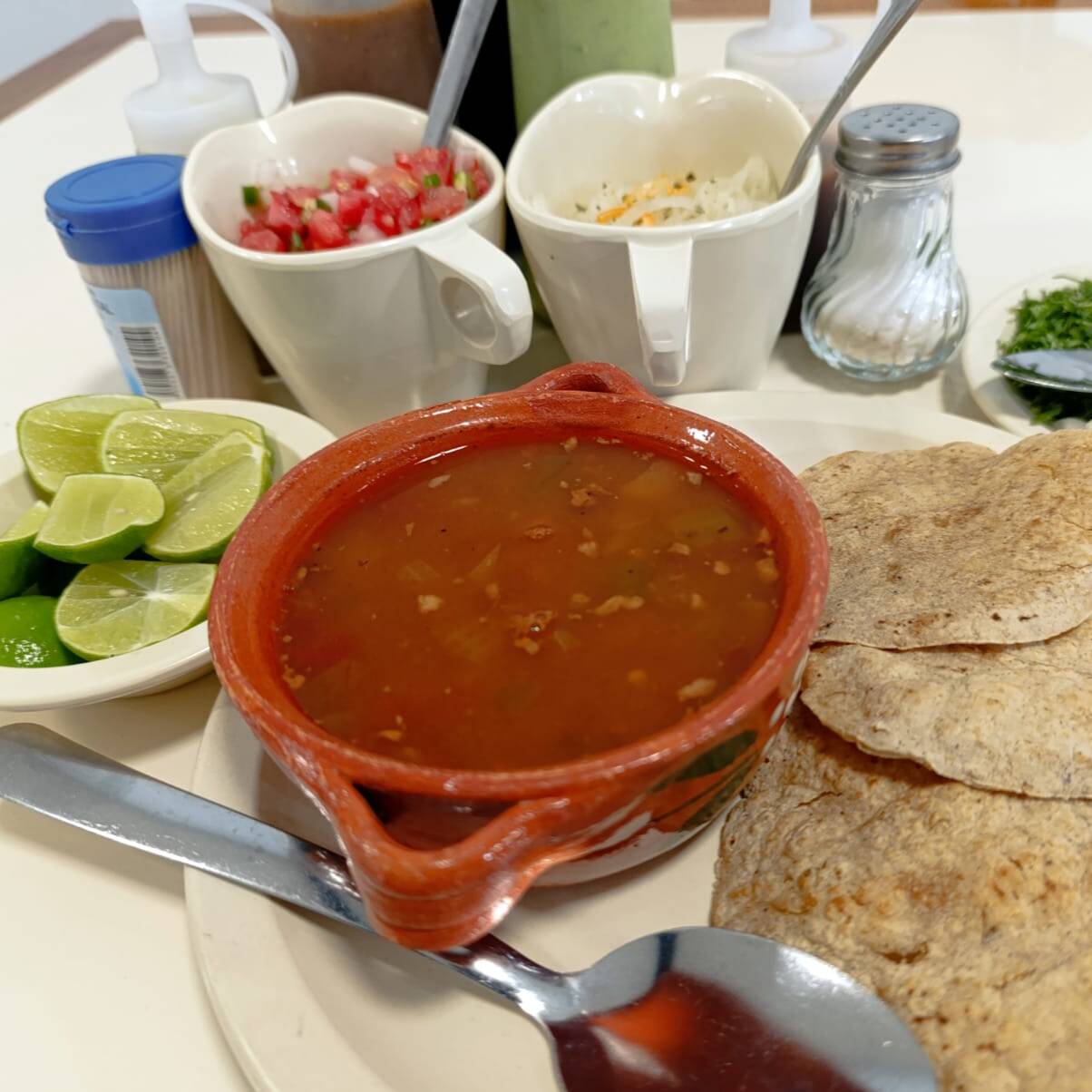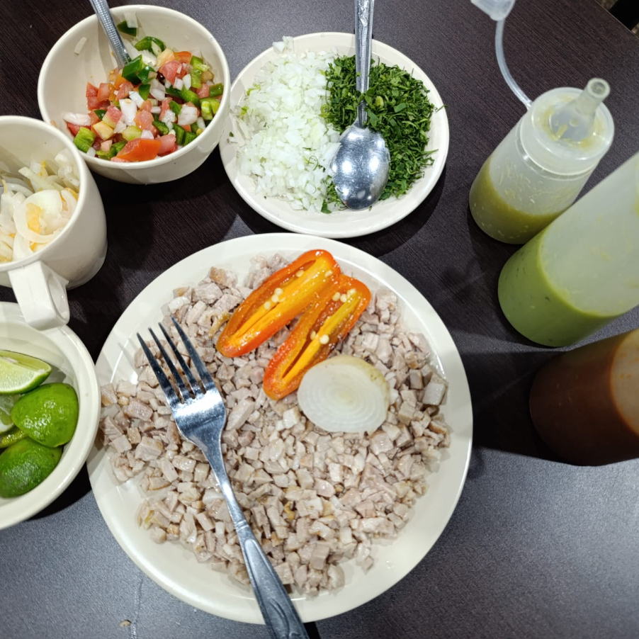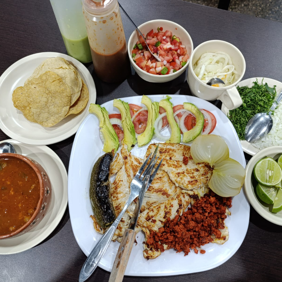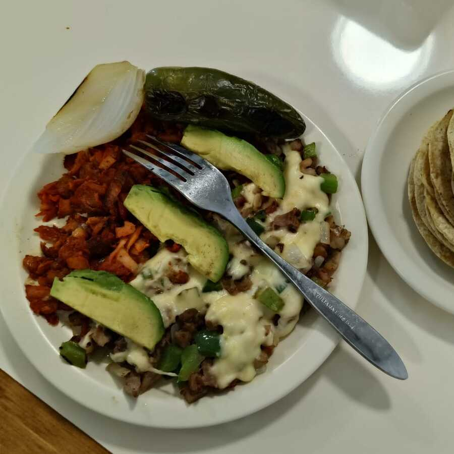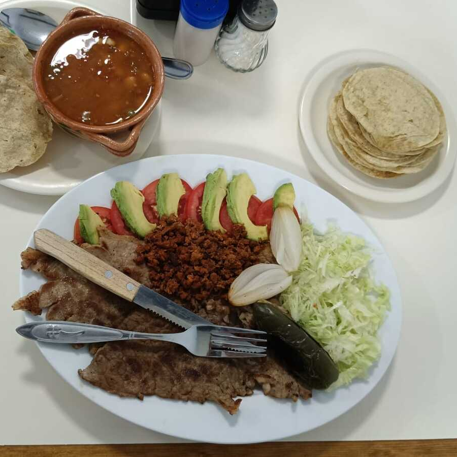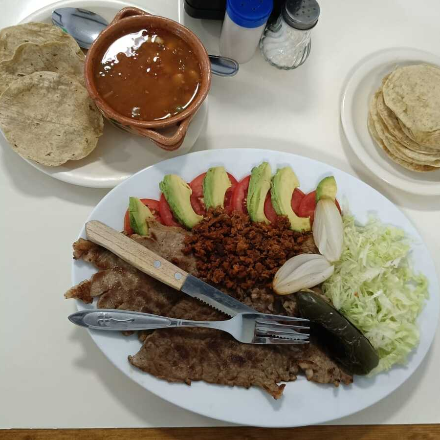 Ensalada, chorizo, cebollita y una orden de frijoles.