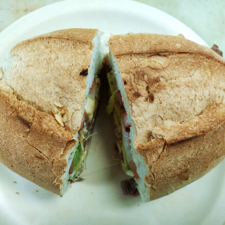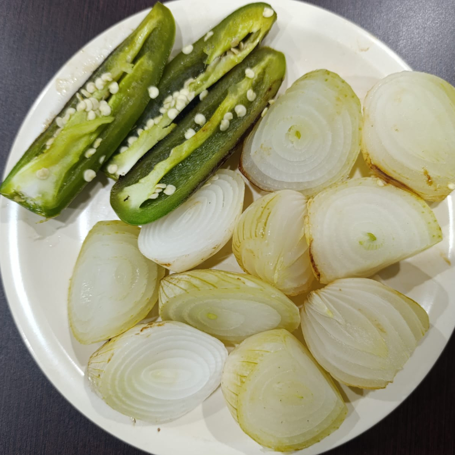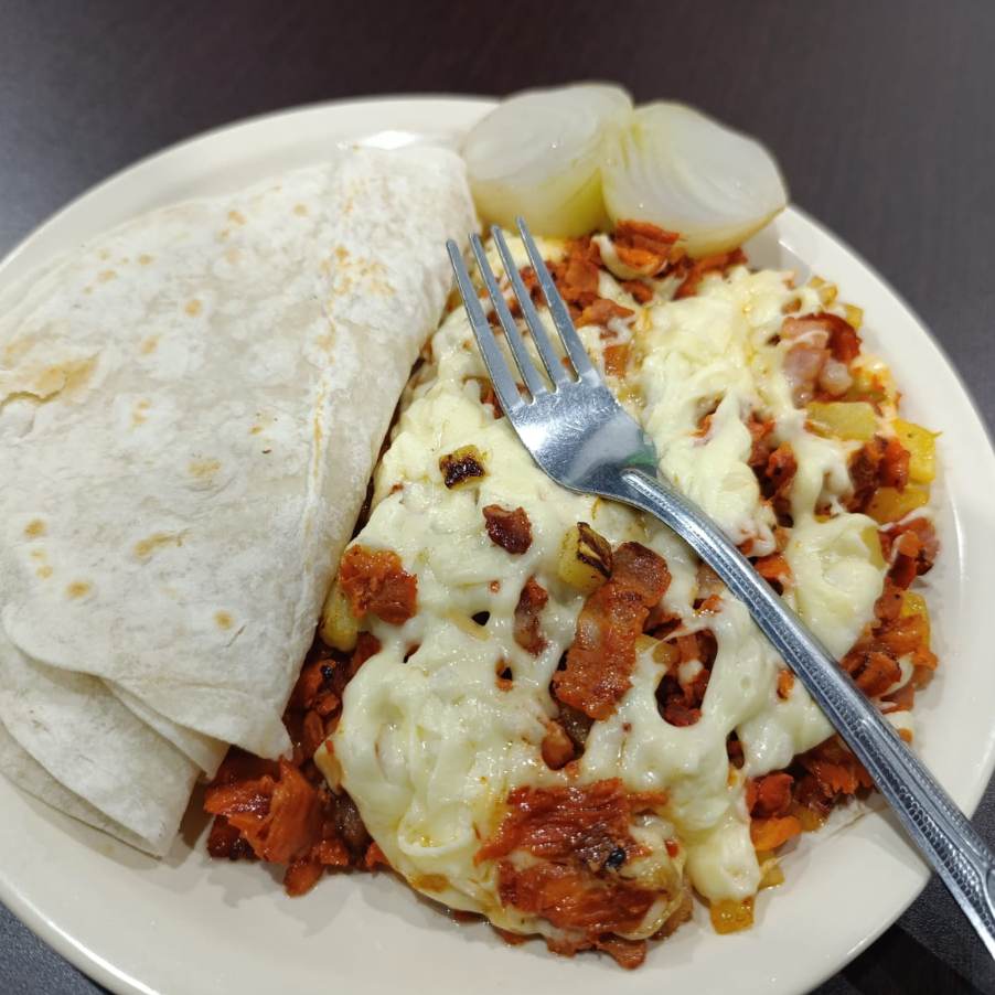 Pimiento, cebolla, tocino y queso (6 a 8 tacos).