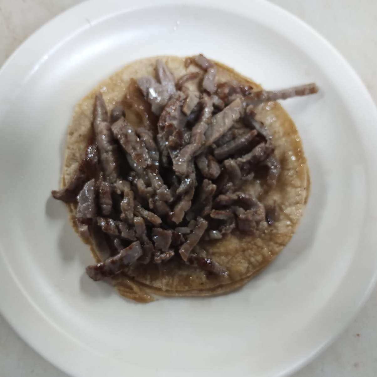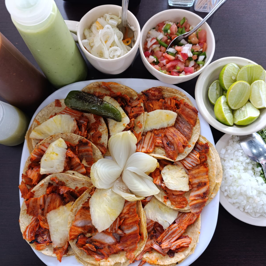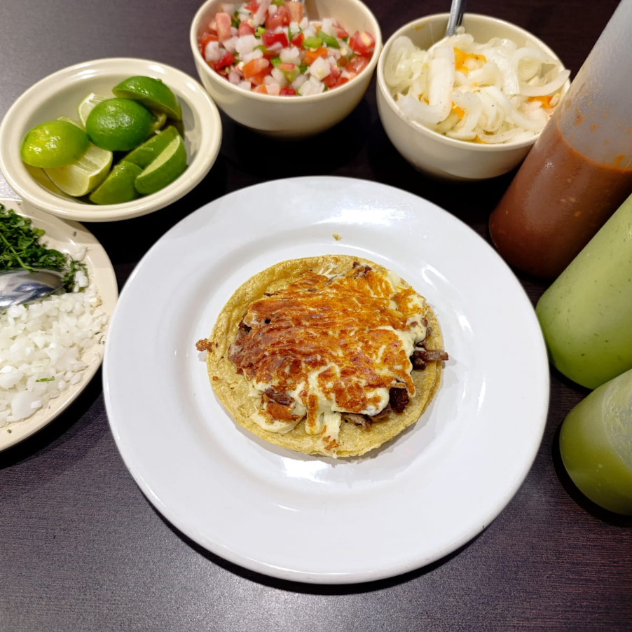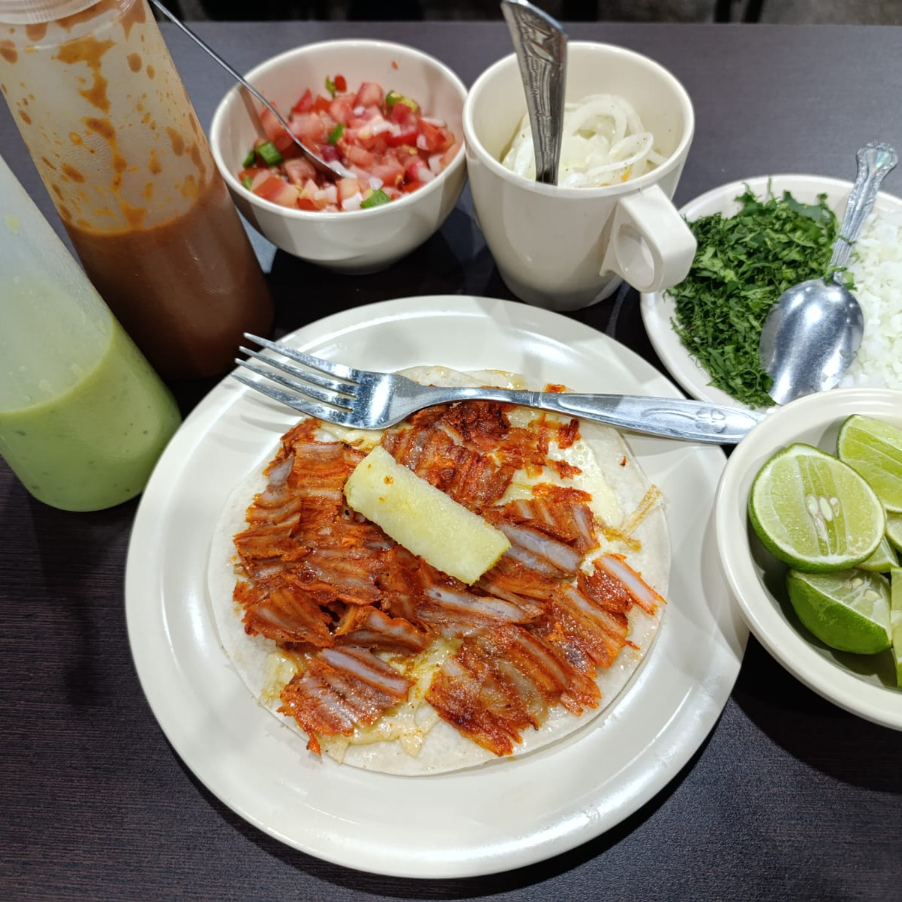 2 Tiras de bistec asado, queso, pastor y cebollitas.
