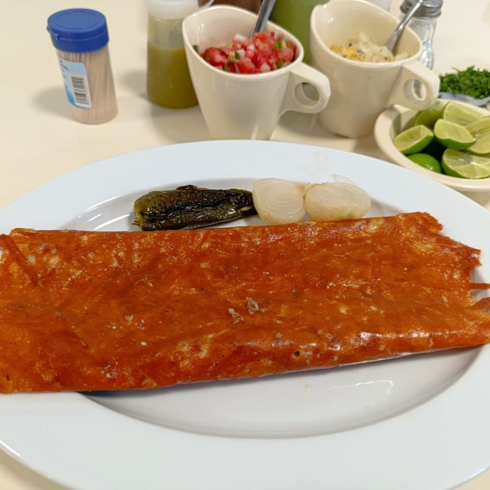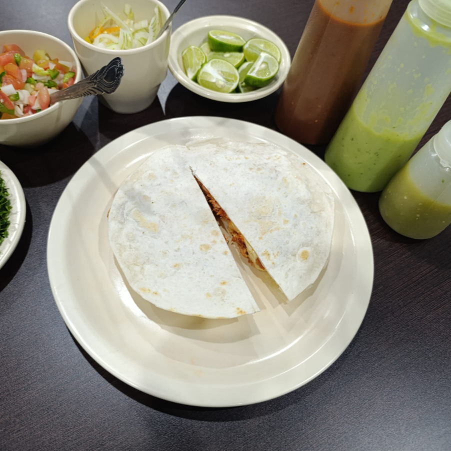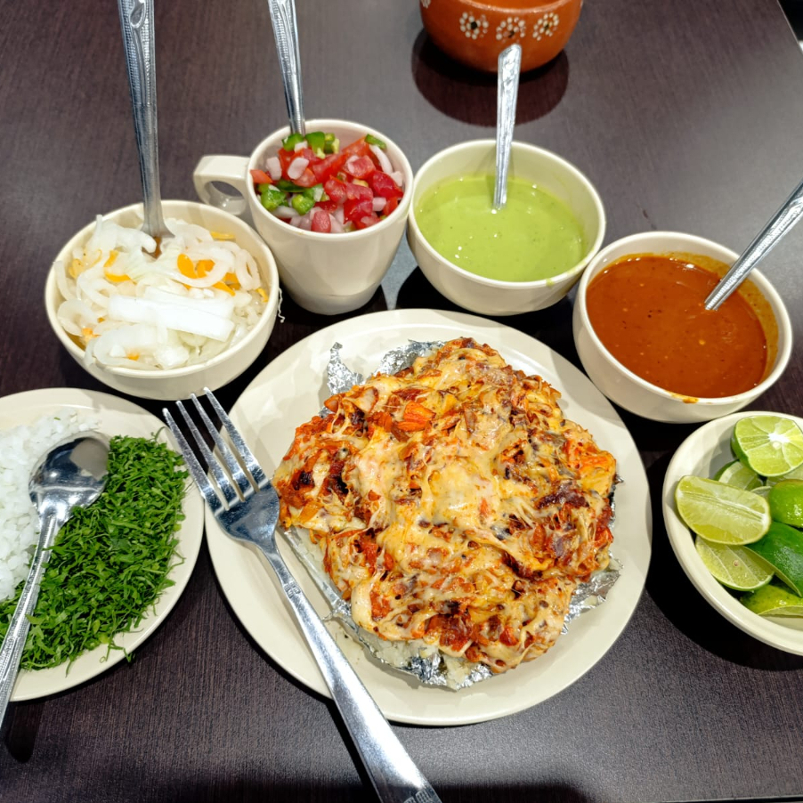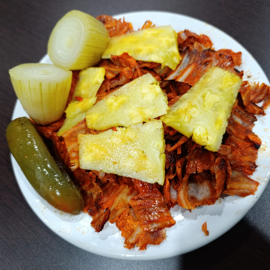 2 Tiras de bistec asado, queso, pastor y cebollitas.