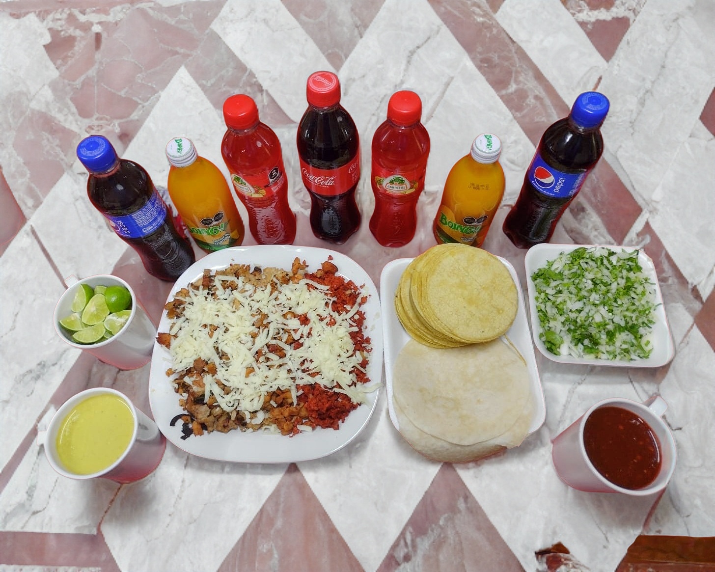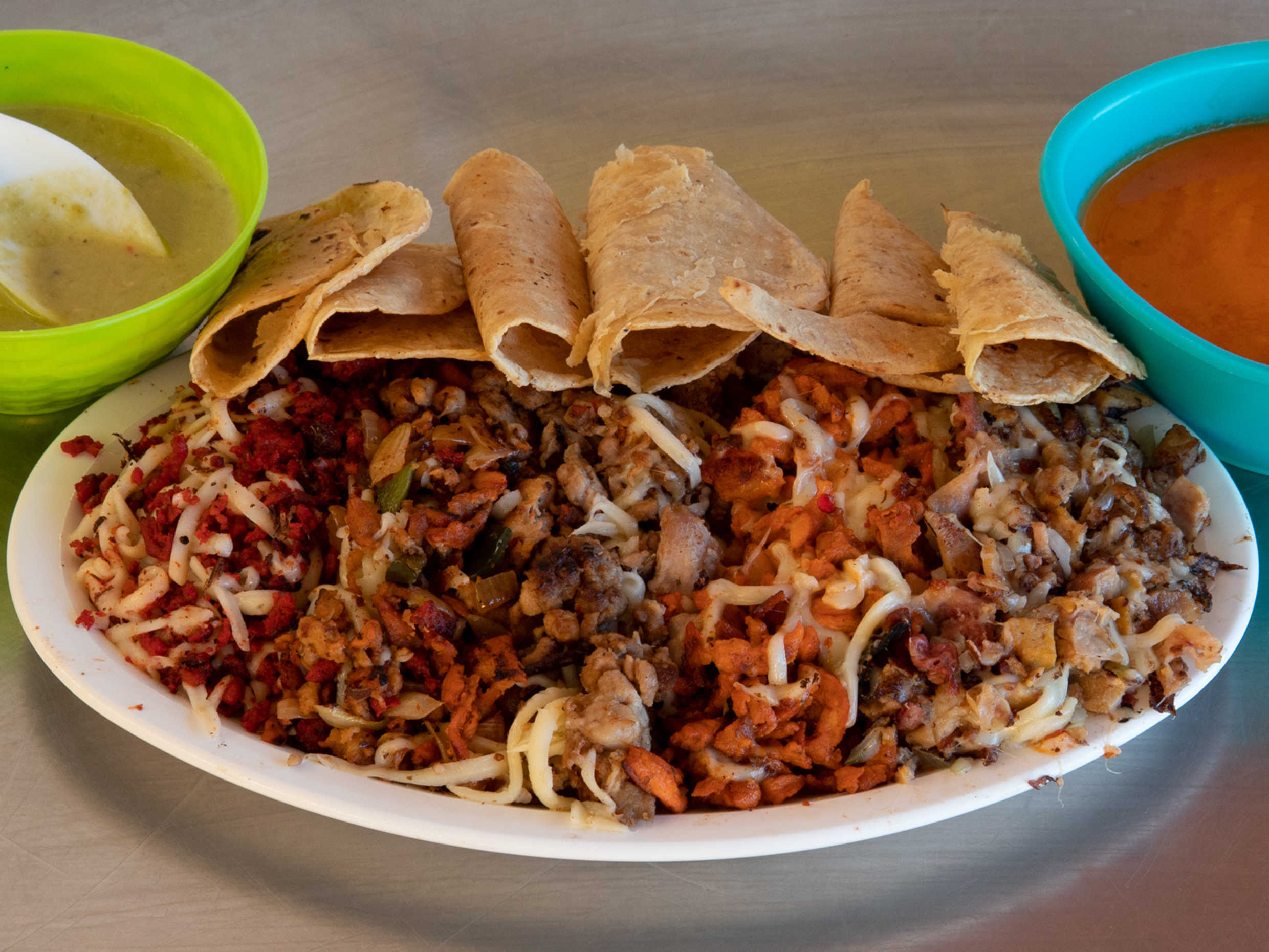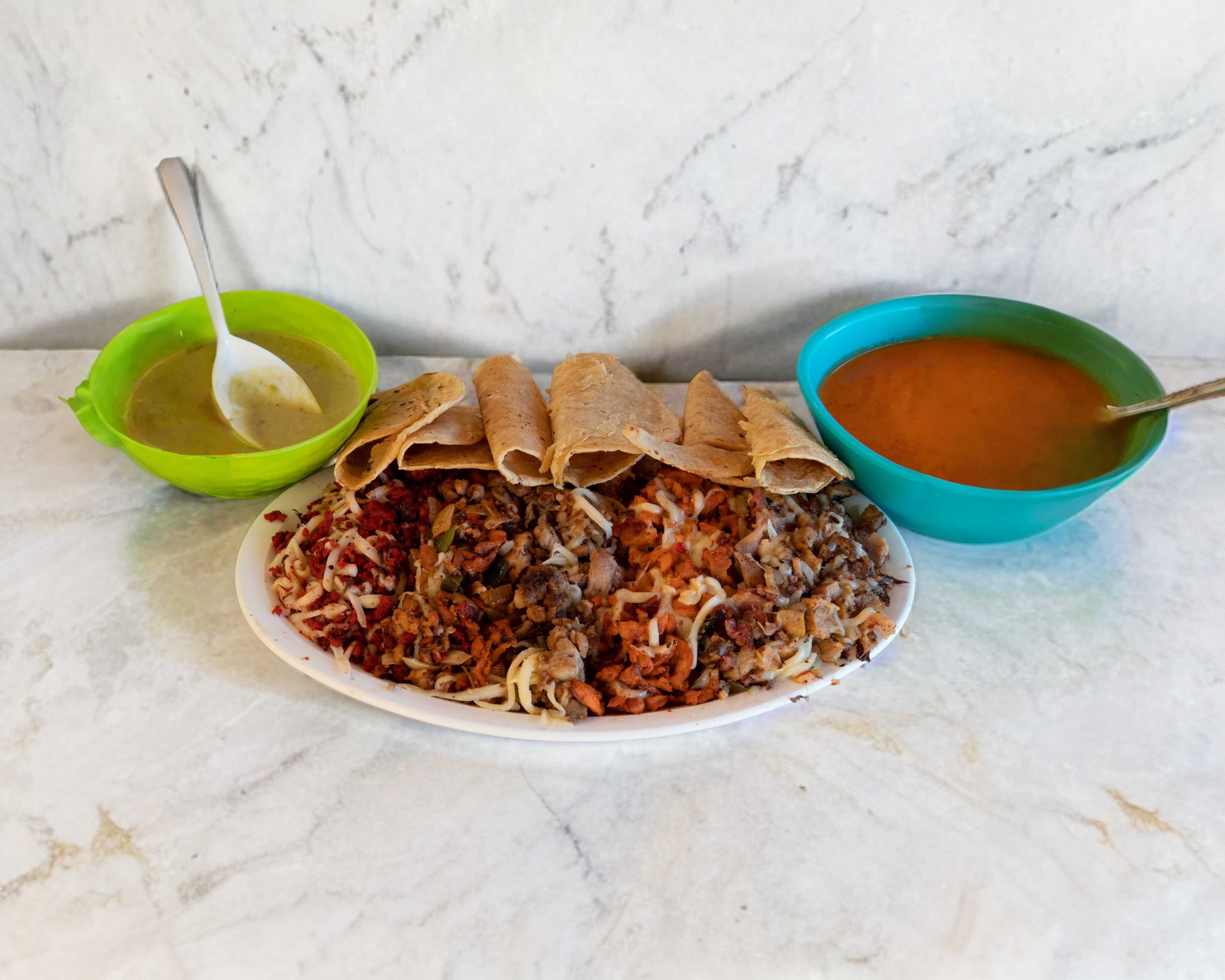 1 parrillada mixta (pastor, bistec, alambre y chorizo)12 tortillas de maíz y 3 tortillas de harina