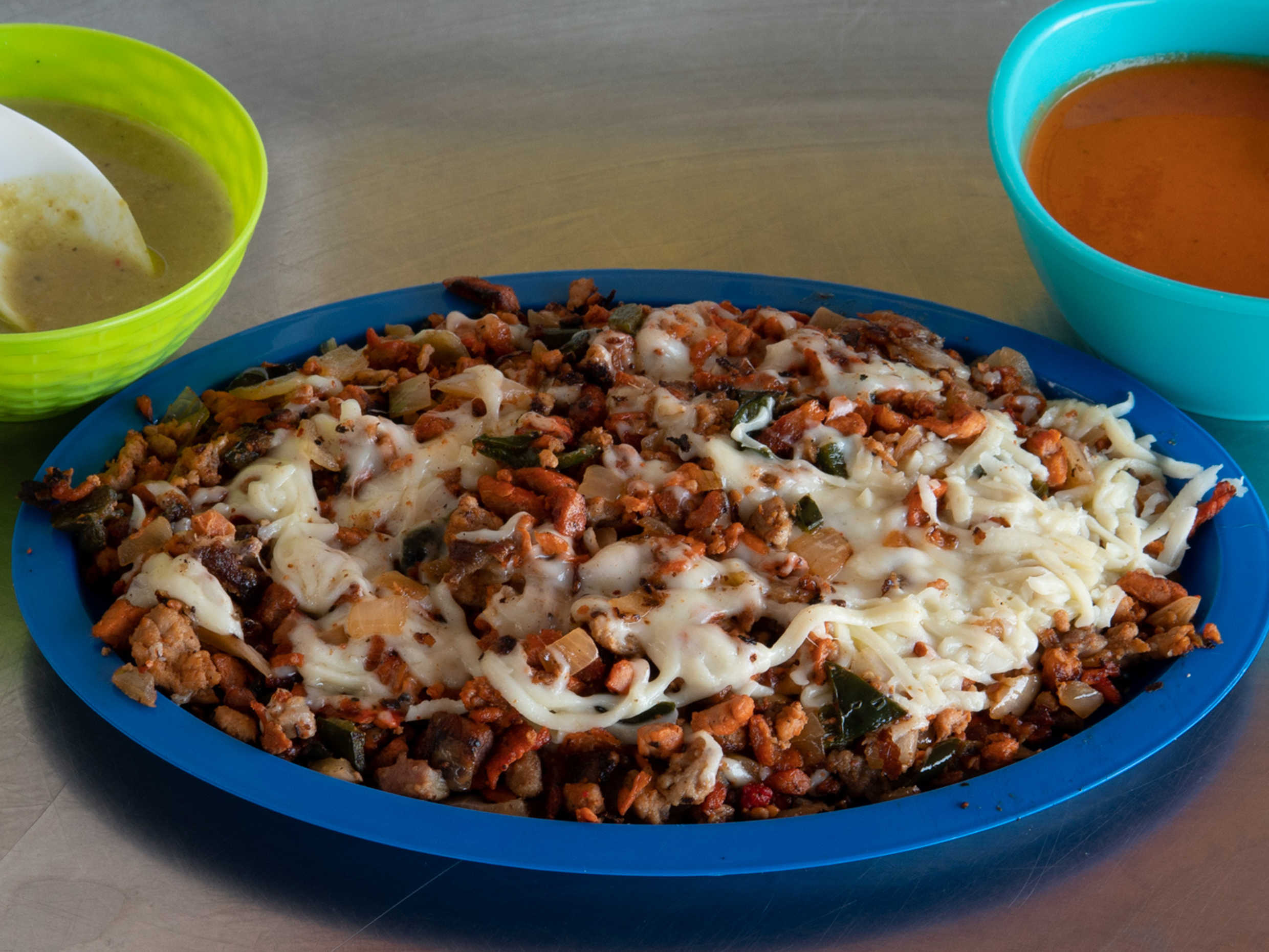 1 volcán de bistec con chorizo y salsas