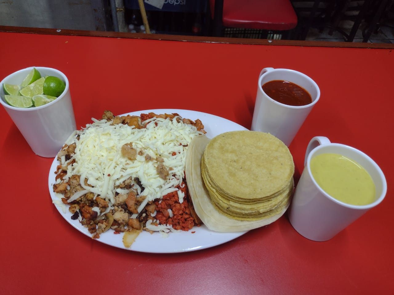 Promoción 3 tacos de pastor con queso y salsas