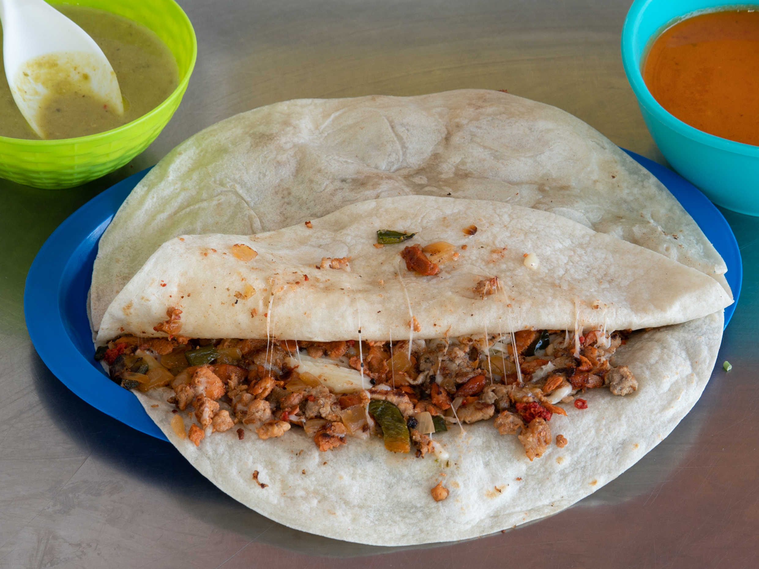 SUPER QUEKA DE BISTEC CON CHORIZO 2 TORTILLAS DE HARINA GIGANTES, salsa