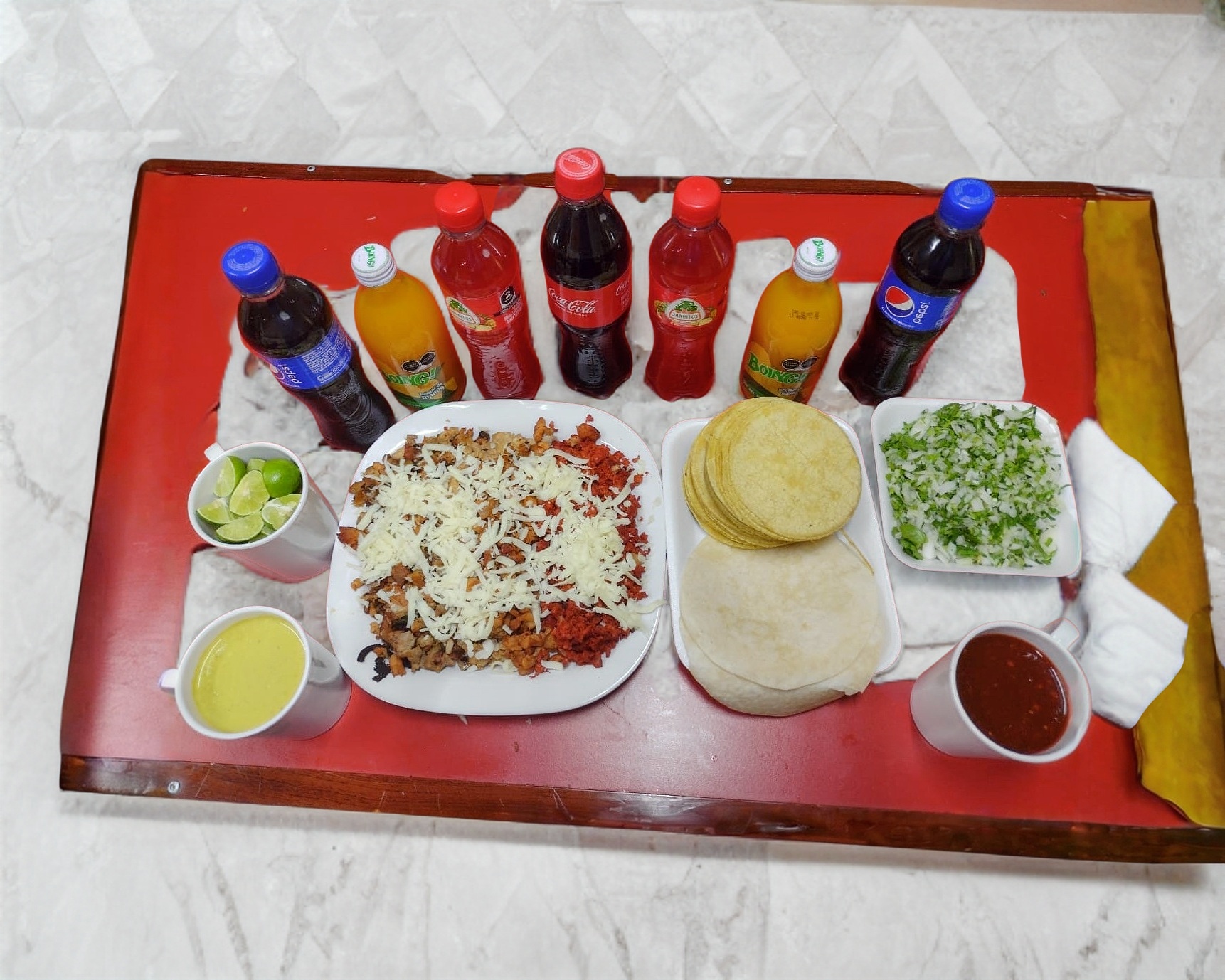 3 gringas de alambre, salsas, verduras y limones