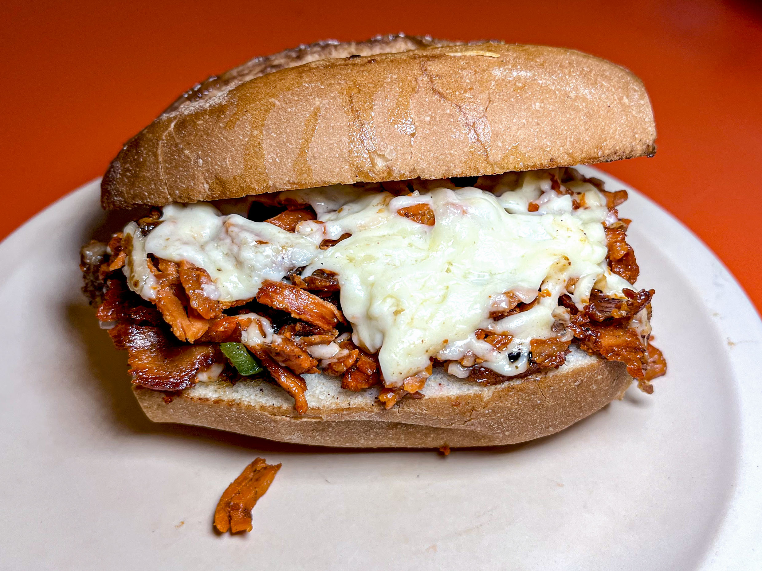 Bistec asado, champiñones, queso, cebolla y chiles asados.