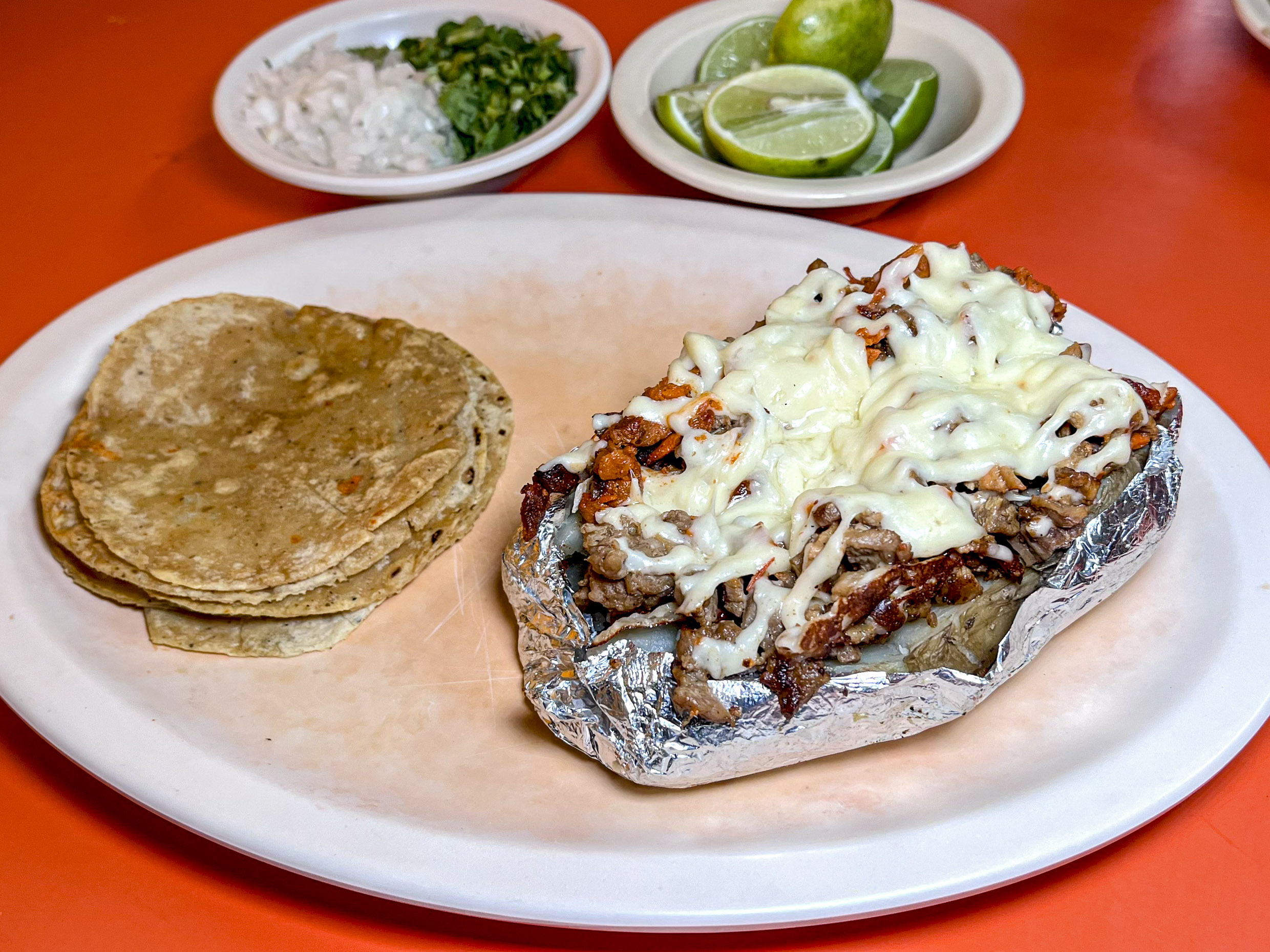 Papas asadas rellenas con la carne de su elección y revuelta con queso con una leve capa de mantequilla en la papa con 3 pares de tortillas.