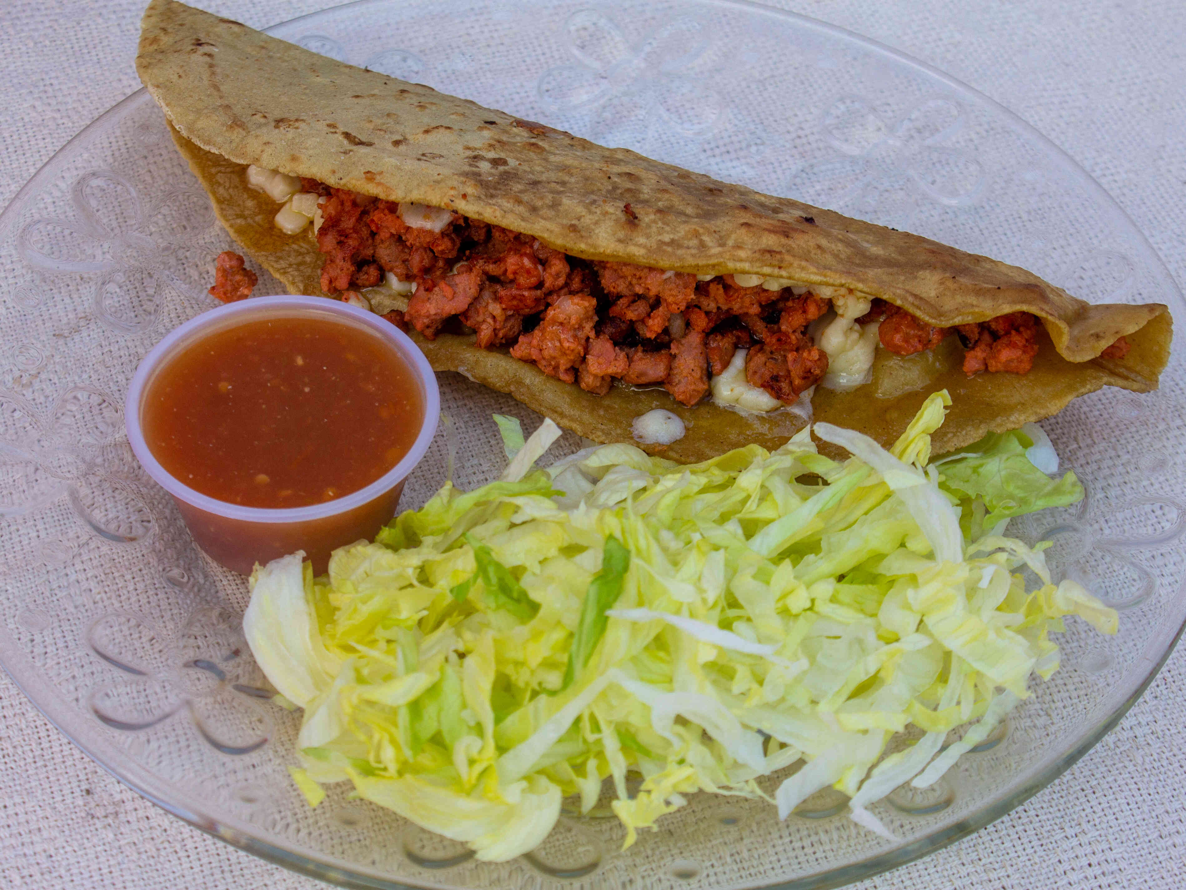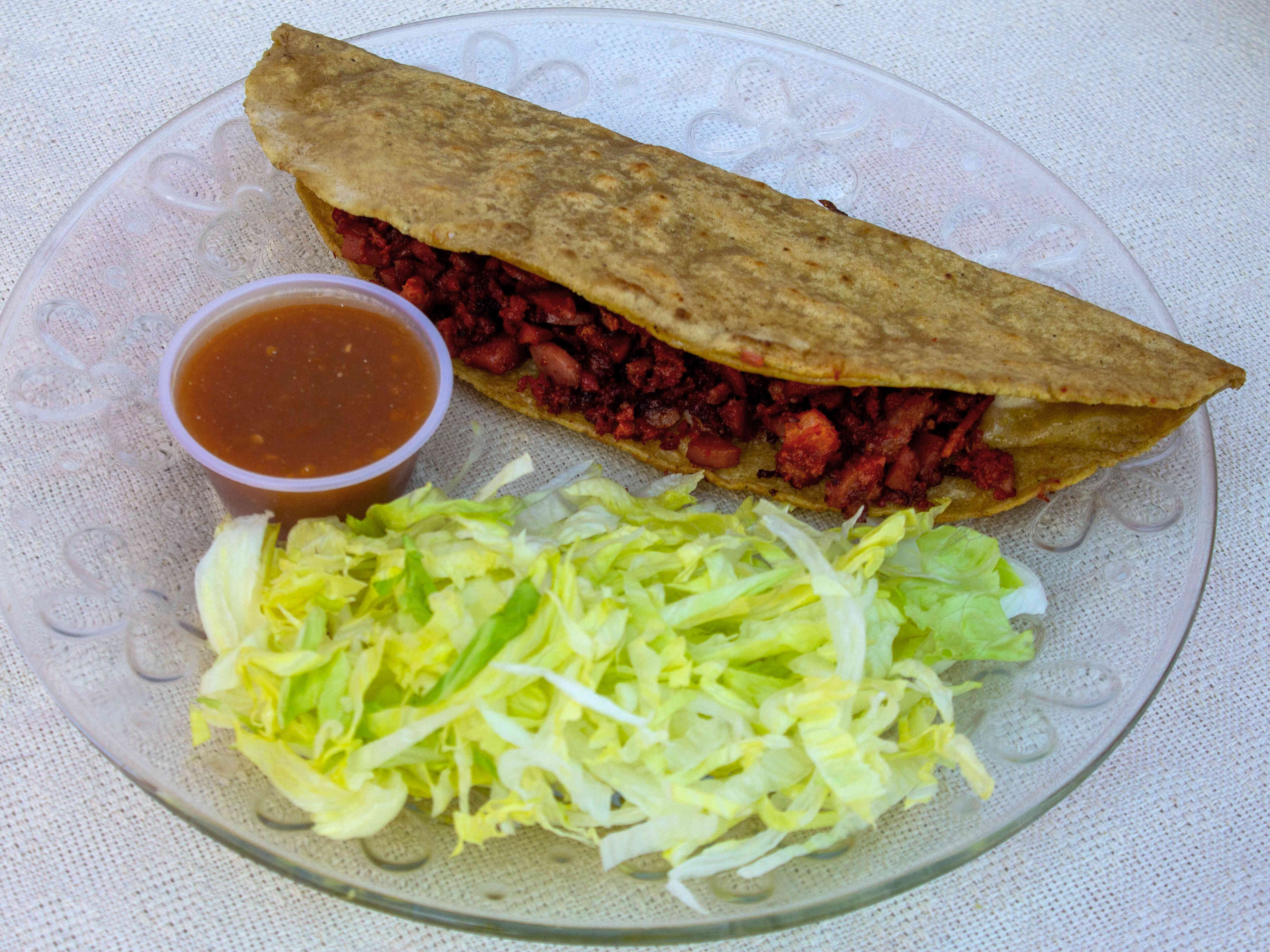 Deliciosa quesadilla de maíz con rico pastor y queso chihuahua. Incluye lechuga, crema y salsa.