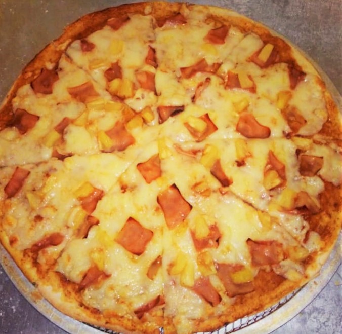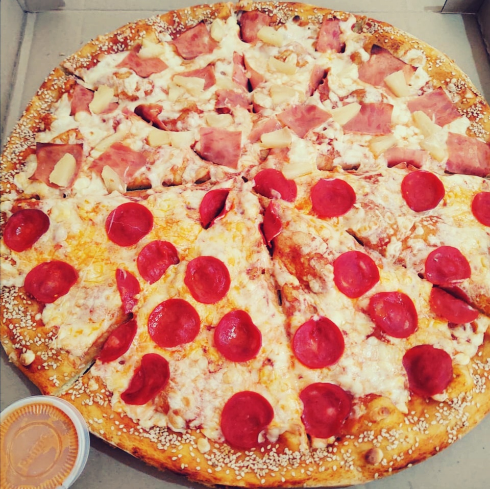 Piza mitad hawai y mitad peoperoni.